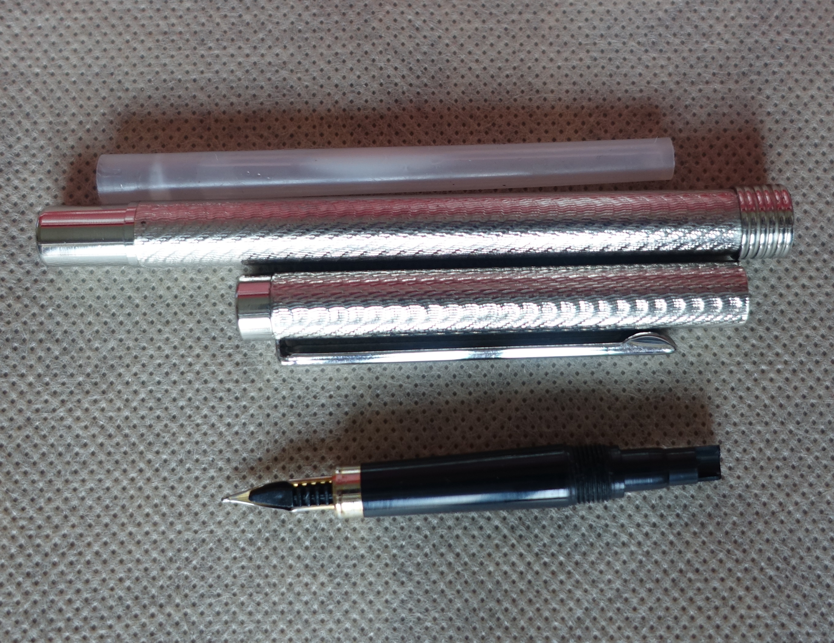 Questa mattina un collega mi ha "affidato" una piccola Pilot con fusto e cappuccio in acciaio spazzolato (tipo una piccola Parker 25) con pennino in acciaio e imboccatura praticamente identica a quella mostrata sopra. La penna è piccola e sottile ma monta tranquillamente le cartucce standard Pilot.