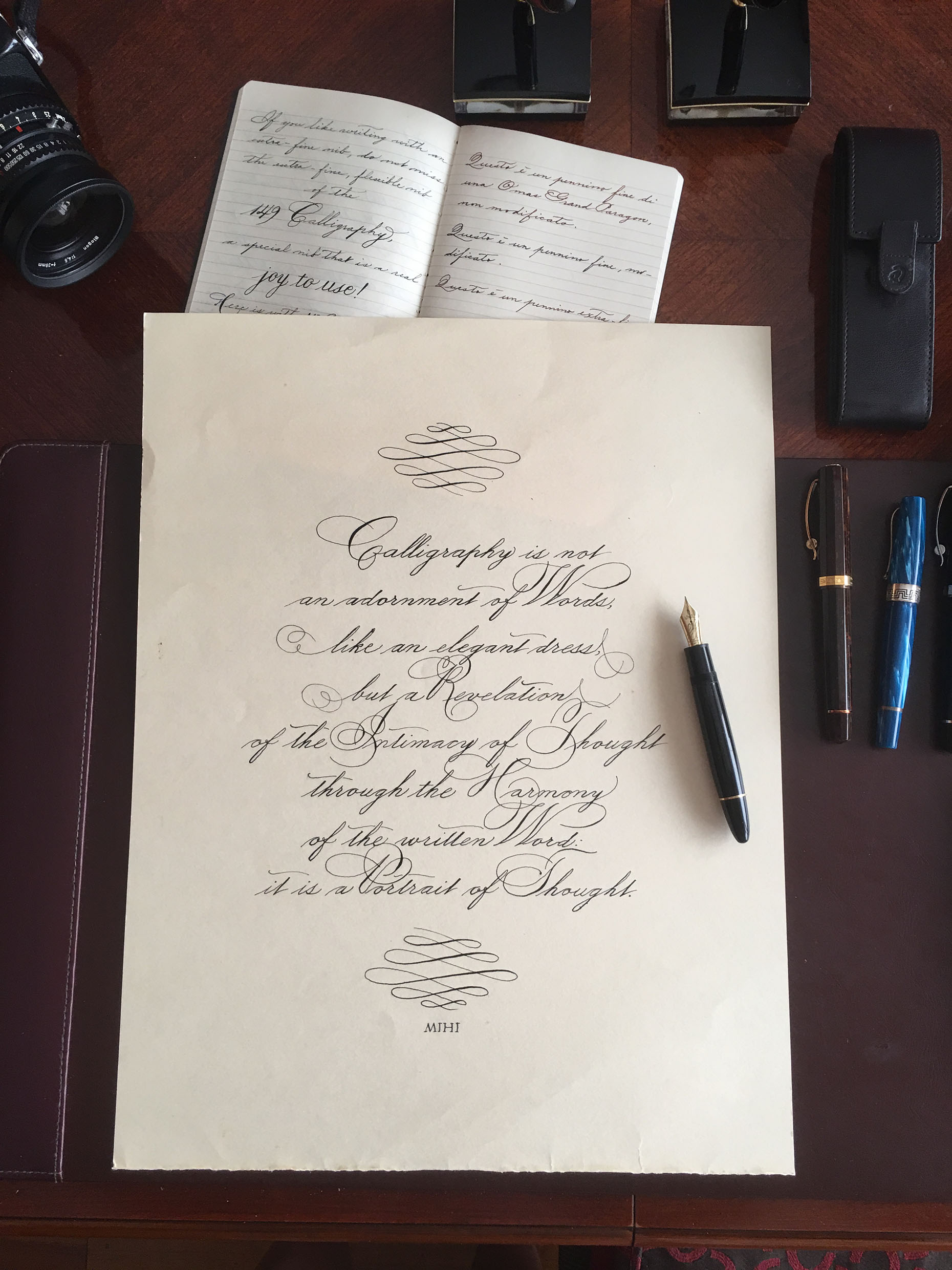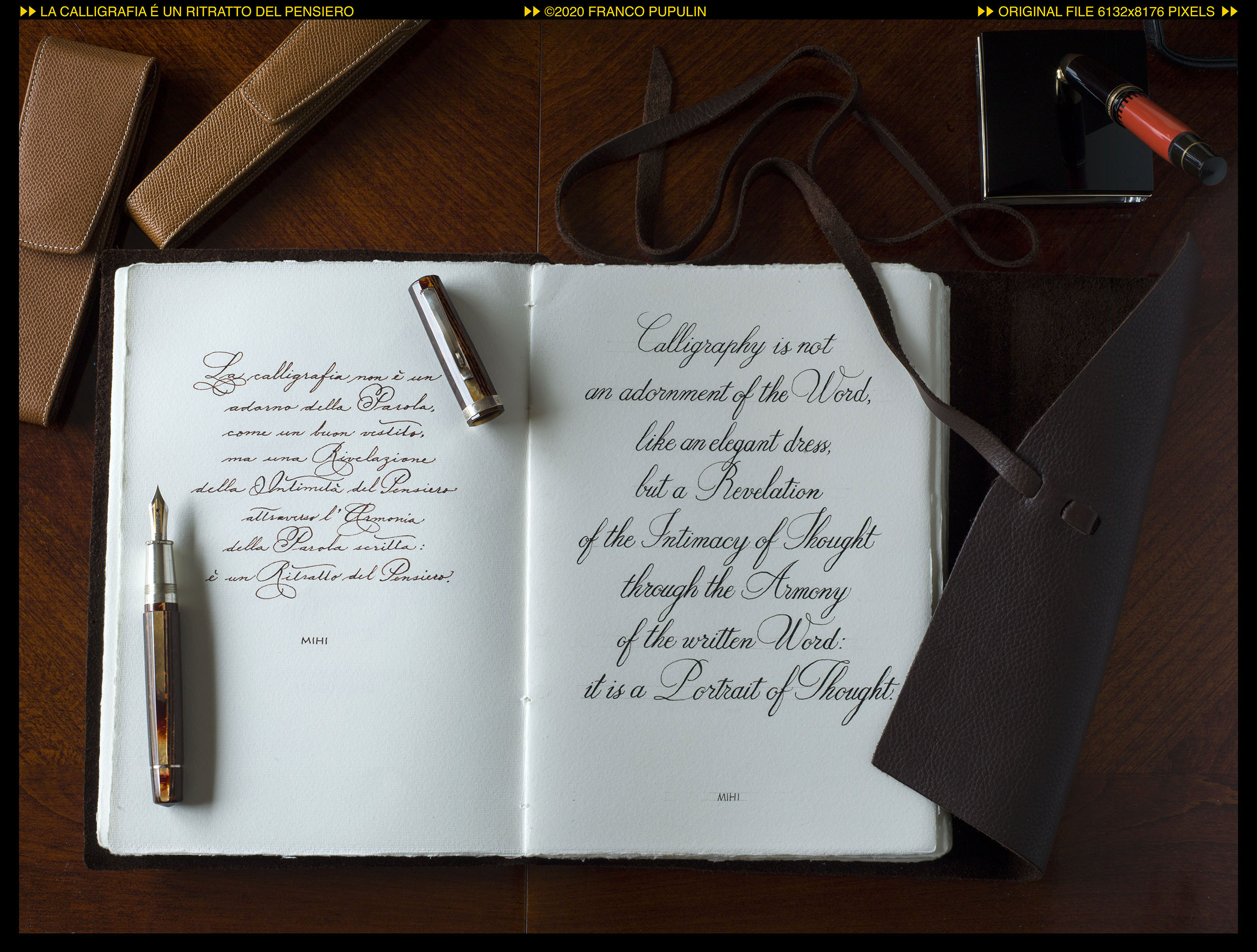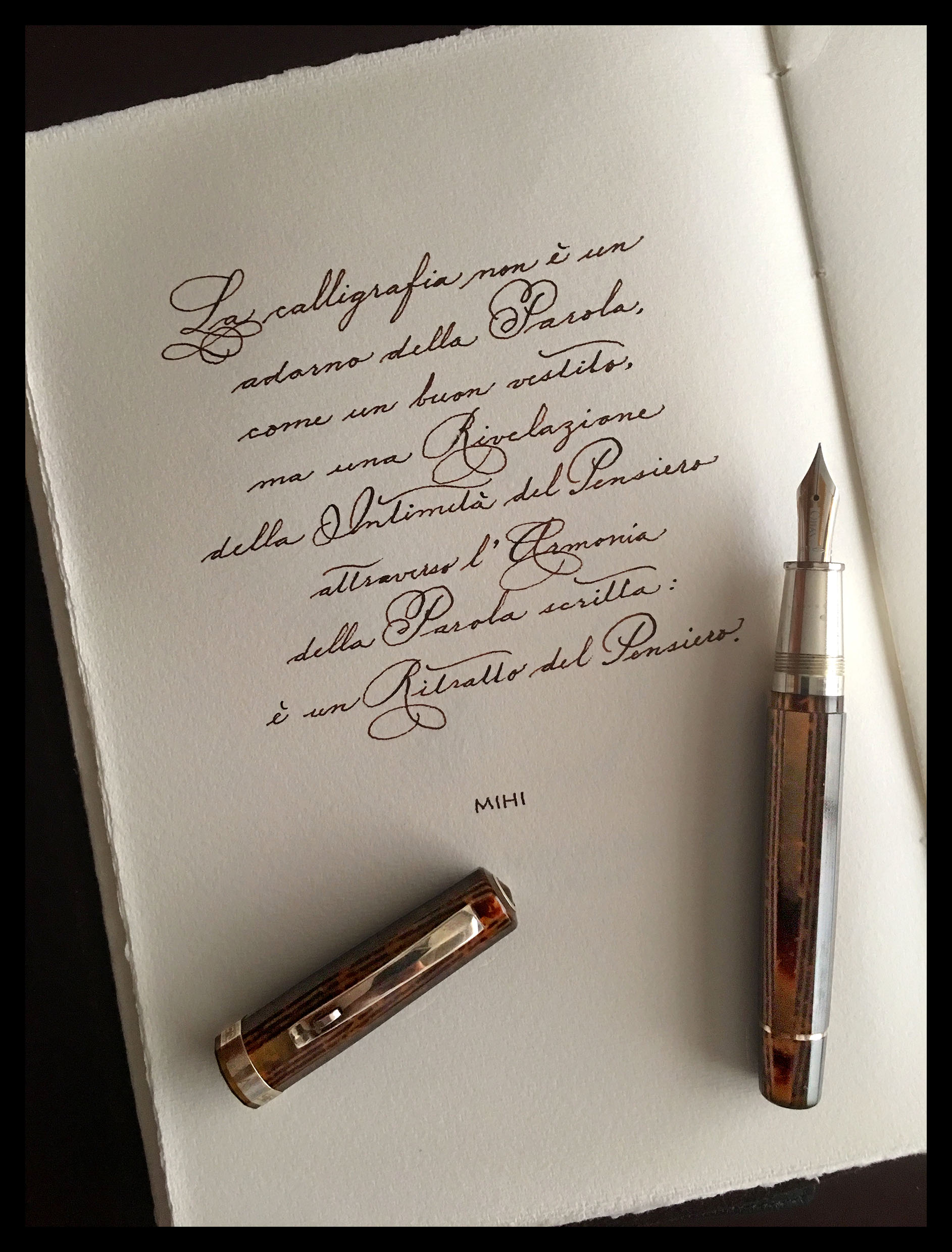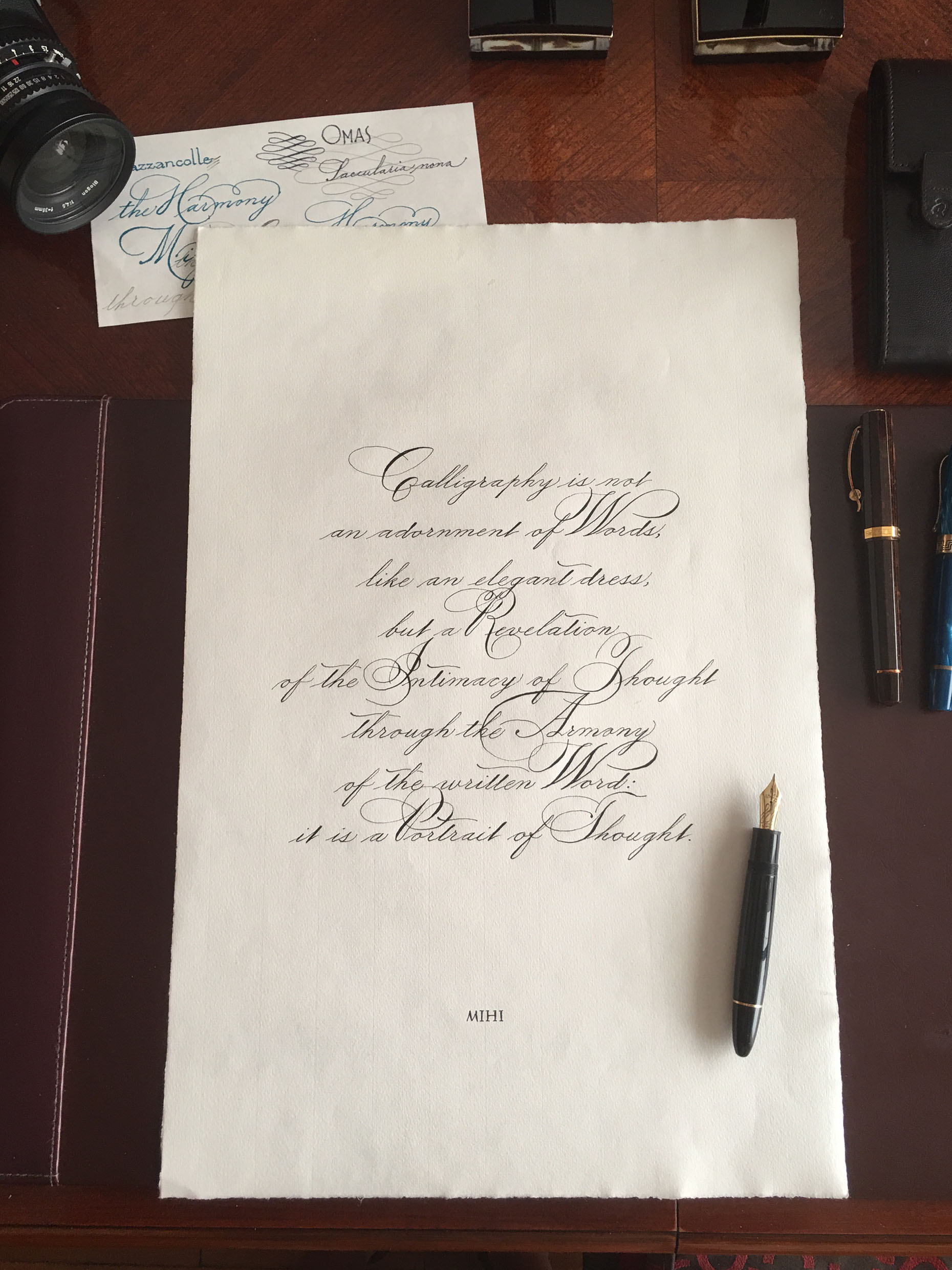 La versione in inglese é scritta in uno in stile simile al Copperplate, con la Montblanc 149 Calligraphy, ma é certamente da migliorare.