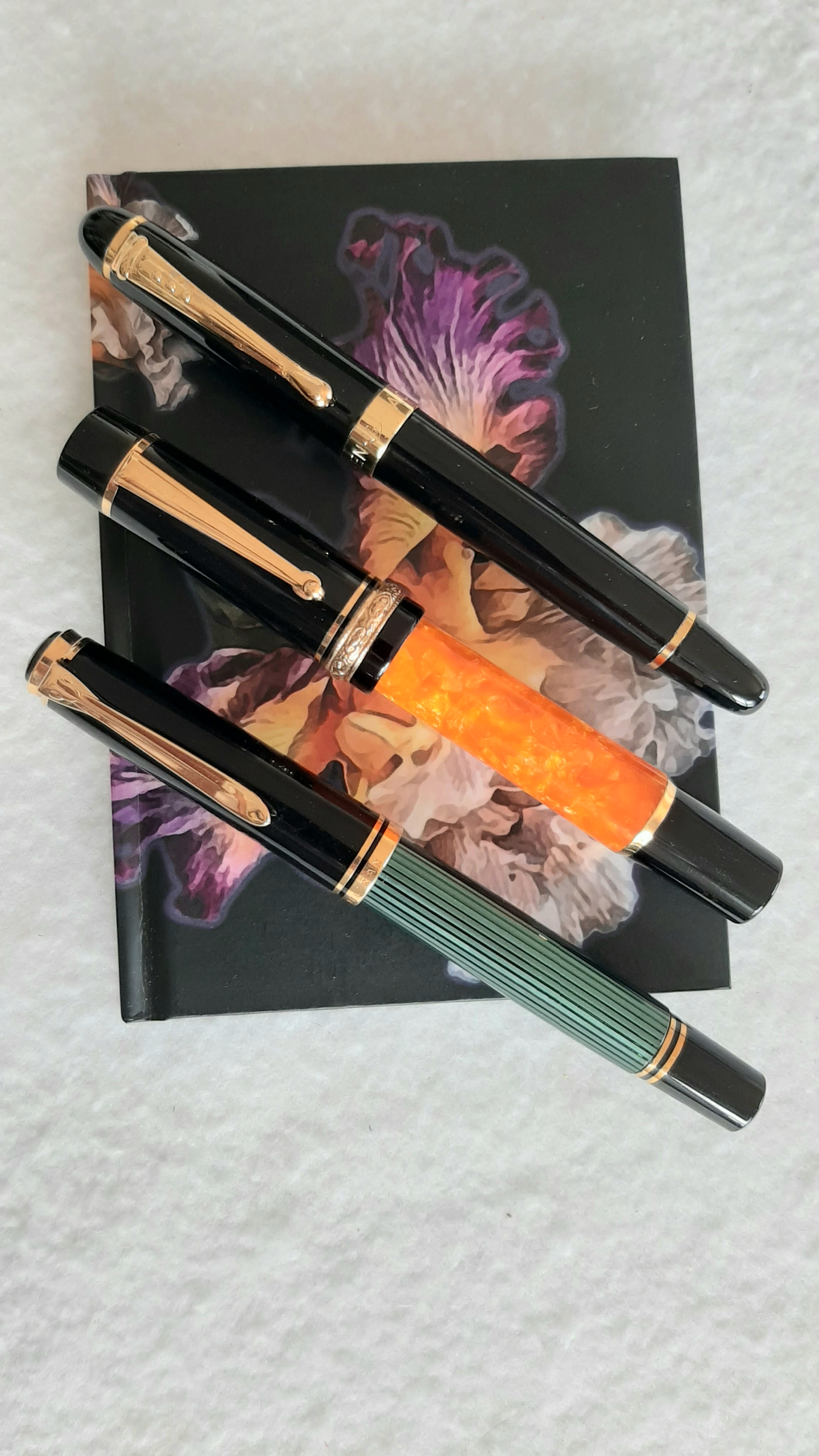 Ho trascorso qualche giorno in montagna e ho portato con me queste tre penne. La Delta Dolcevita caricata con Sheaffer black ha un pennino meraviglioso, fine e scorrevole come pochi. La Pelikan m800 West Germany caricata con Visconti blu, anche lei con un vero pennino fine che è proprio fine...E per finire la cinese Zhen Hao 936 presentata qualche giorno fa con il Diamine blue black. Tutte e tre mi hanno accompagnato splendidamente, ognuna con le sue caratteristiche ben precise ma sempre piacevoli da usare.