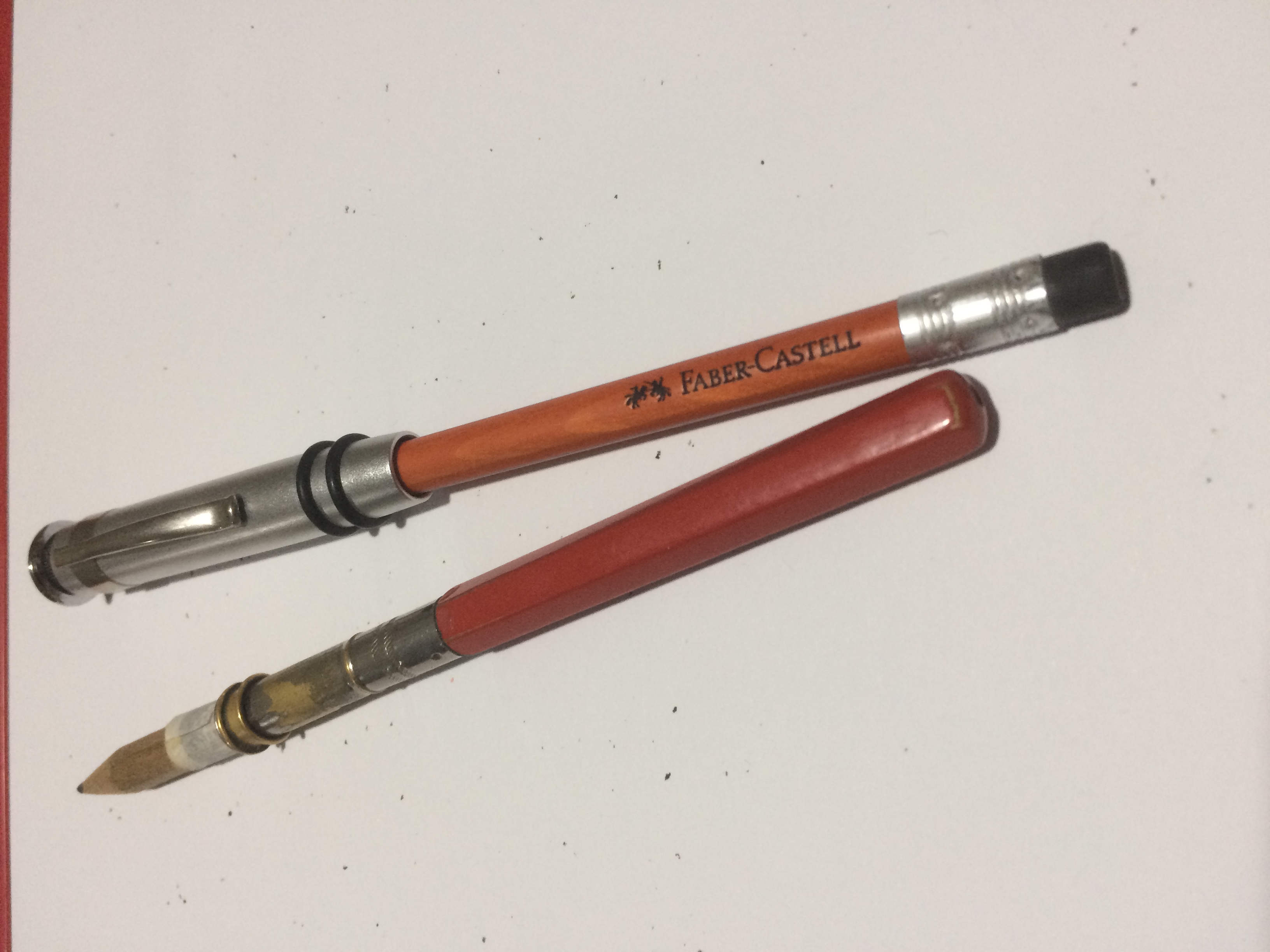 Porto sempre con me una matita con allunga lapis in plastica verde (Faber Castell matita perfetta) e una stilografica con inchiostro nero, mentre sul mio tavolo da lavoro non mancano mai matite colorate e inchiostri colorati.
