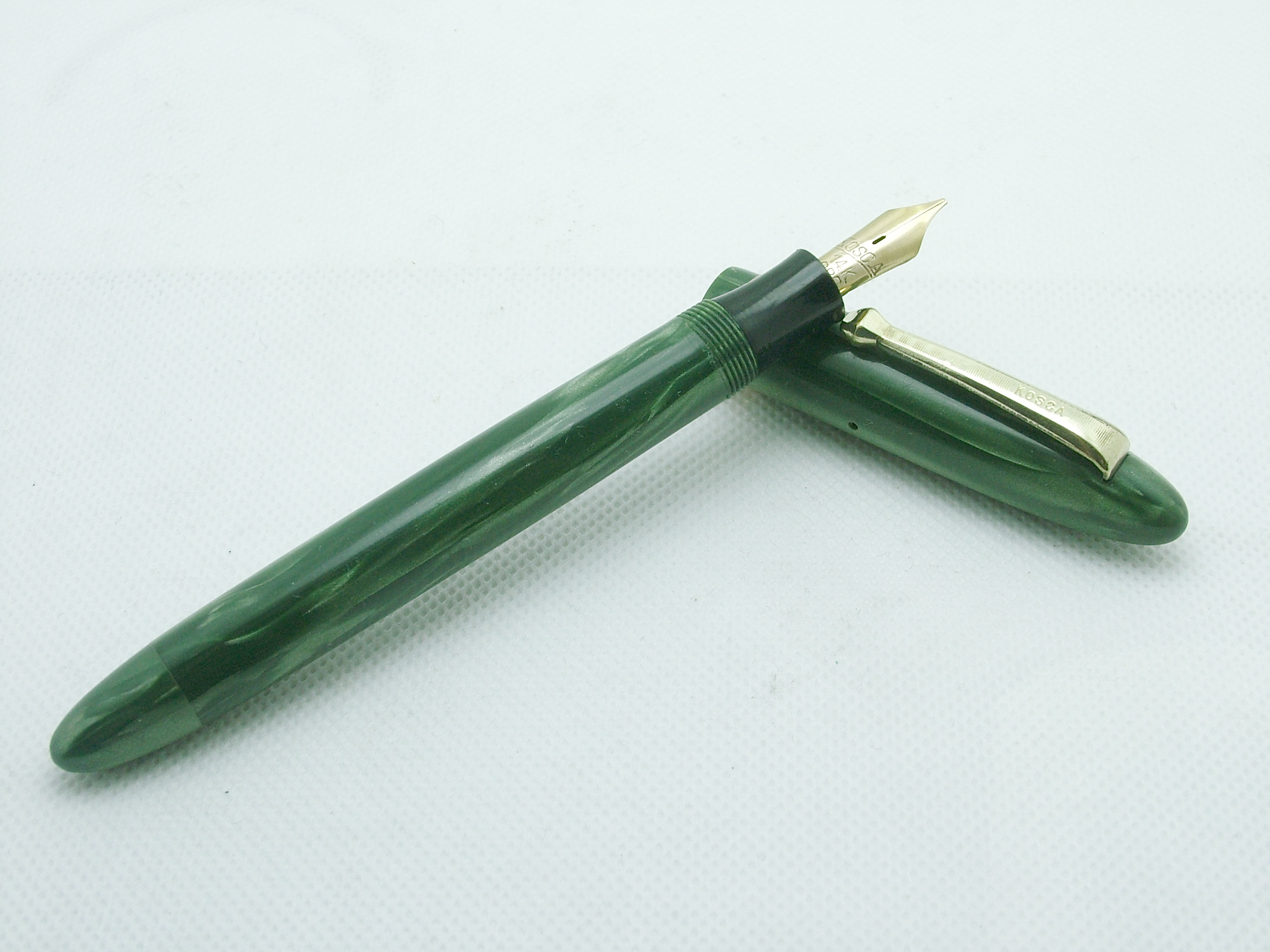 Il modello che mi fa piacere condividere è in celluloide risale agli anni 40,con pennino in oro,accessori laminati in oro di un bel verde marmorizzato.