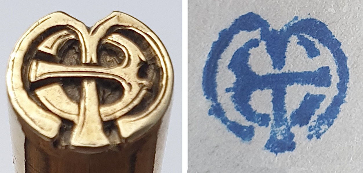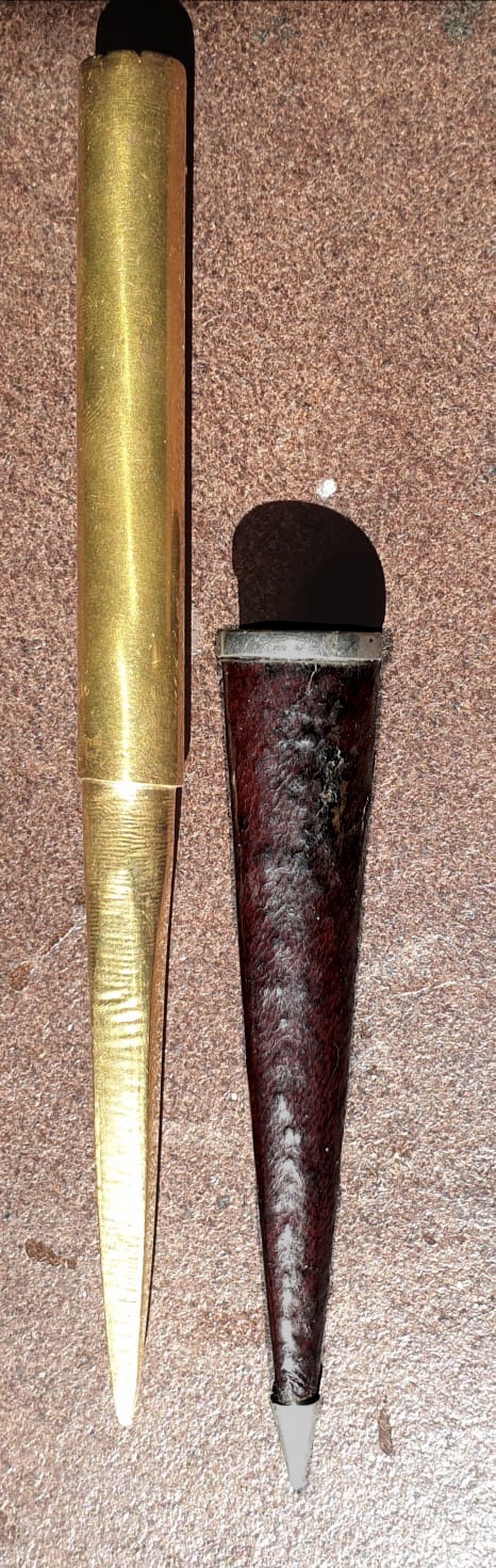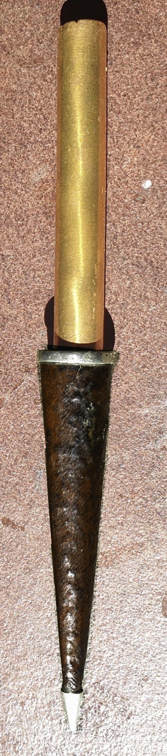 Ben ritrovati! Dopo più di due mesi di assenza, torno a voi con questo stupendo stilo in ottone massiccio per la scrittura su tavolette di cera, con sigillo composto da monogramma in caratteri onciali, completo di fodero in legno rivestito in pelle con bordo e puntale d’argento. Lunghezza stilo: 126 mm; diametro maggiore: 9 mm; lunghezza fodero: 73 mm.
