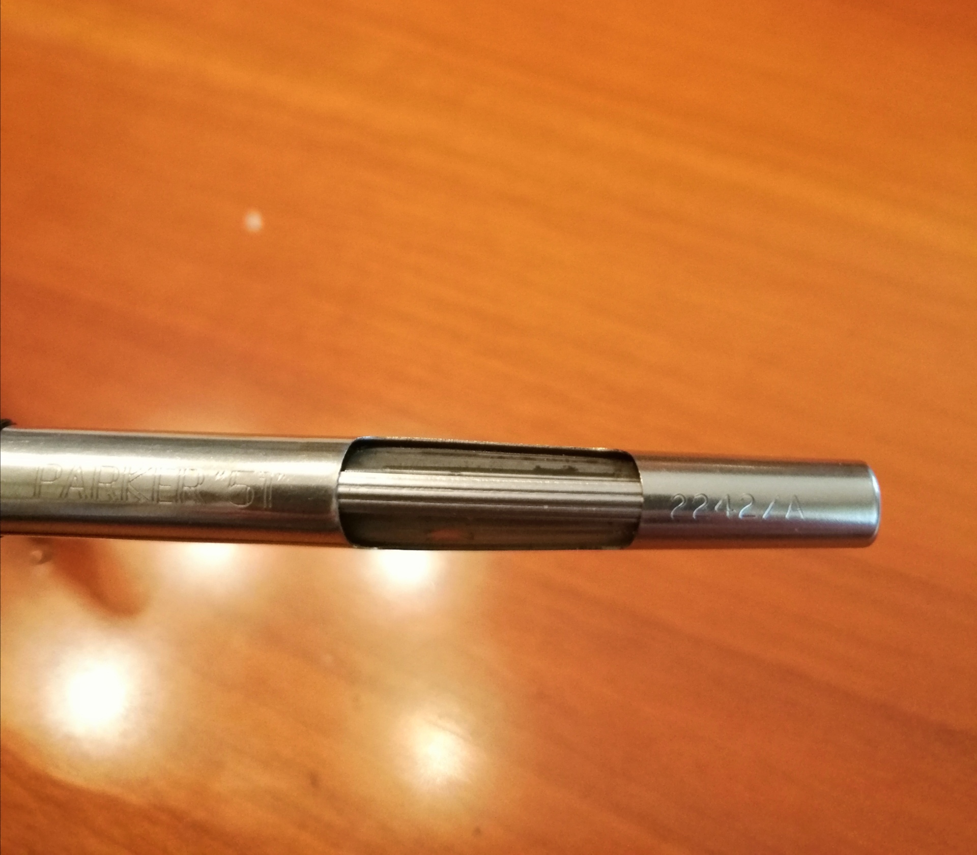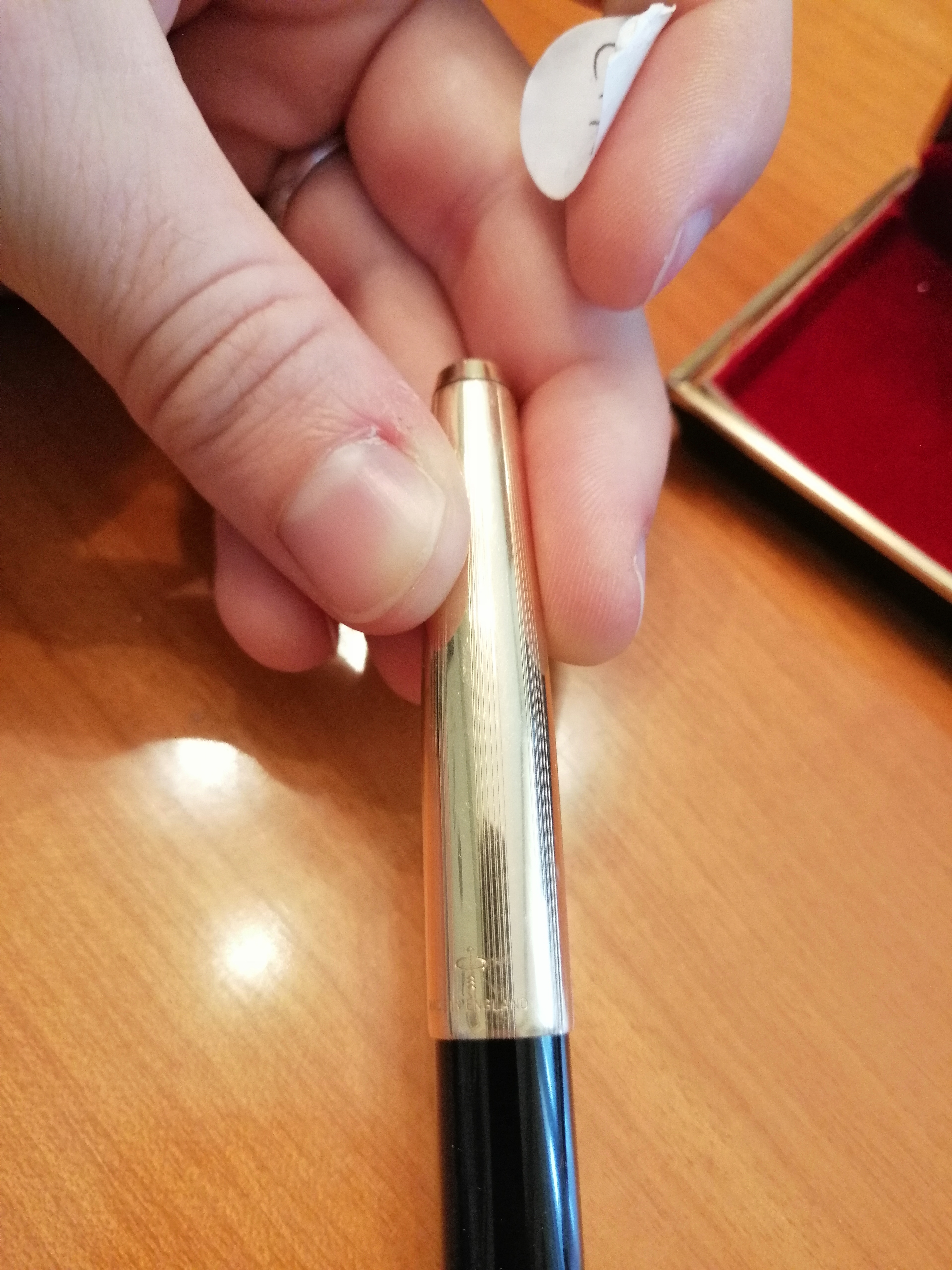 La penna si presenta bene, senza particolari danni (qualche segno di usura sul cappuccio, il sacchetto abbastanza pulito salvo qualche residuo, il pennino ben allineato con la sezione. Non ho riconosciuto subito la penna anche per la parte finale del corpo, che tendenzialmente sulle 51 è ben arrotondato. Questo invece presenta una forma più spigolosa. Comunque indagando un po' in rete scopro che dovrebbe trattarsi del modello 51 MArk III e decido per l'acquisto. Da 48 euro di partenza sono riuscito a portarla a casa per 35 euro, scatola compresa di cui avrei fatto volentieri a meno, primo perchè non mi sembra la sua scatola originale, secondo per una dedica di un maldestro Zio Bruno.