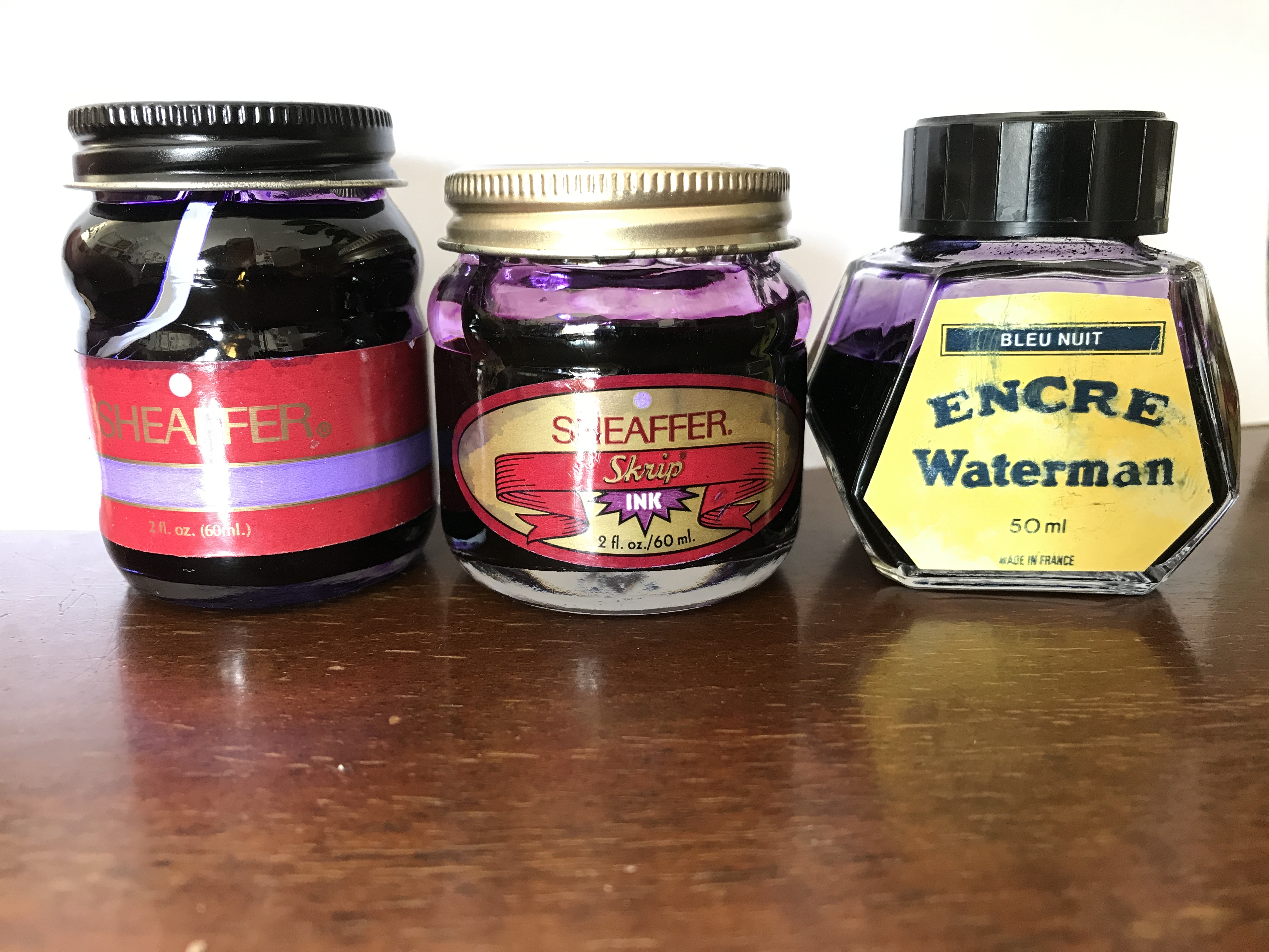 Buongiorno. Ho trovato questi calamai con inchiostri un po' stagionati: il Waterman lo userò, più o meno mi pare come quello attuale; ma i due Sheaffer sono di un "violaceo cadaverico"che non so se dovuto all'invecchiamento oppure se così già all'origine (in particolare quello nella boccetta col tappo nero). A parte questo vorrei sapere se sono inchiostri "sicuri" ovvero non intasano o colorano le penne. E magari il periodo in cui sono stati prodotti. Molte grazie!