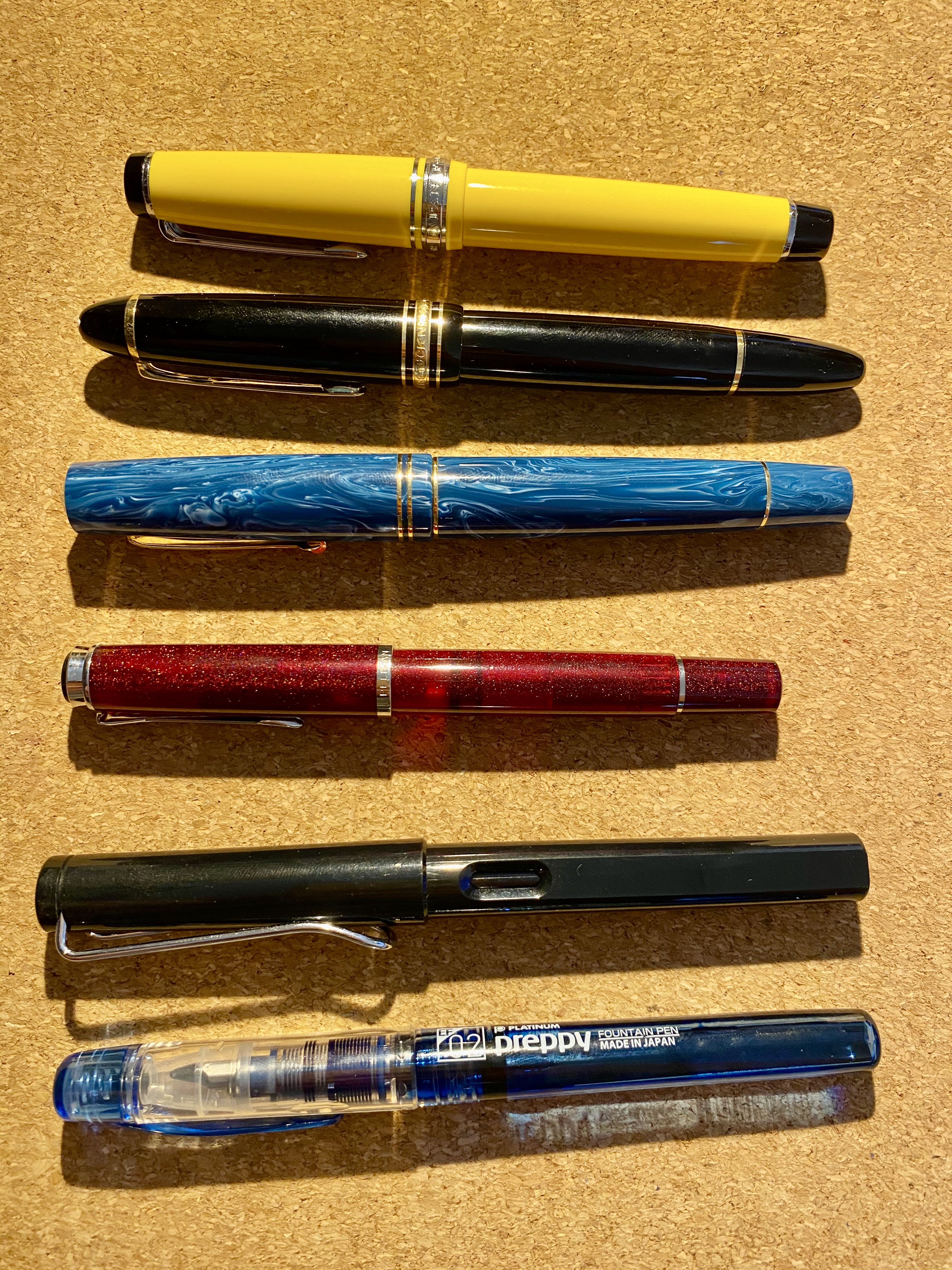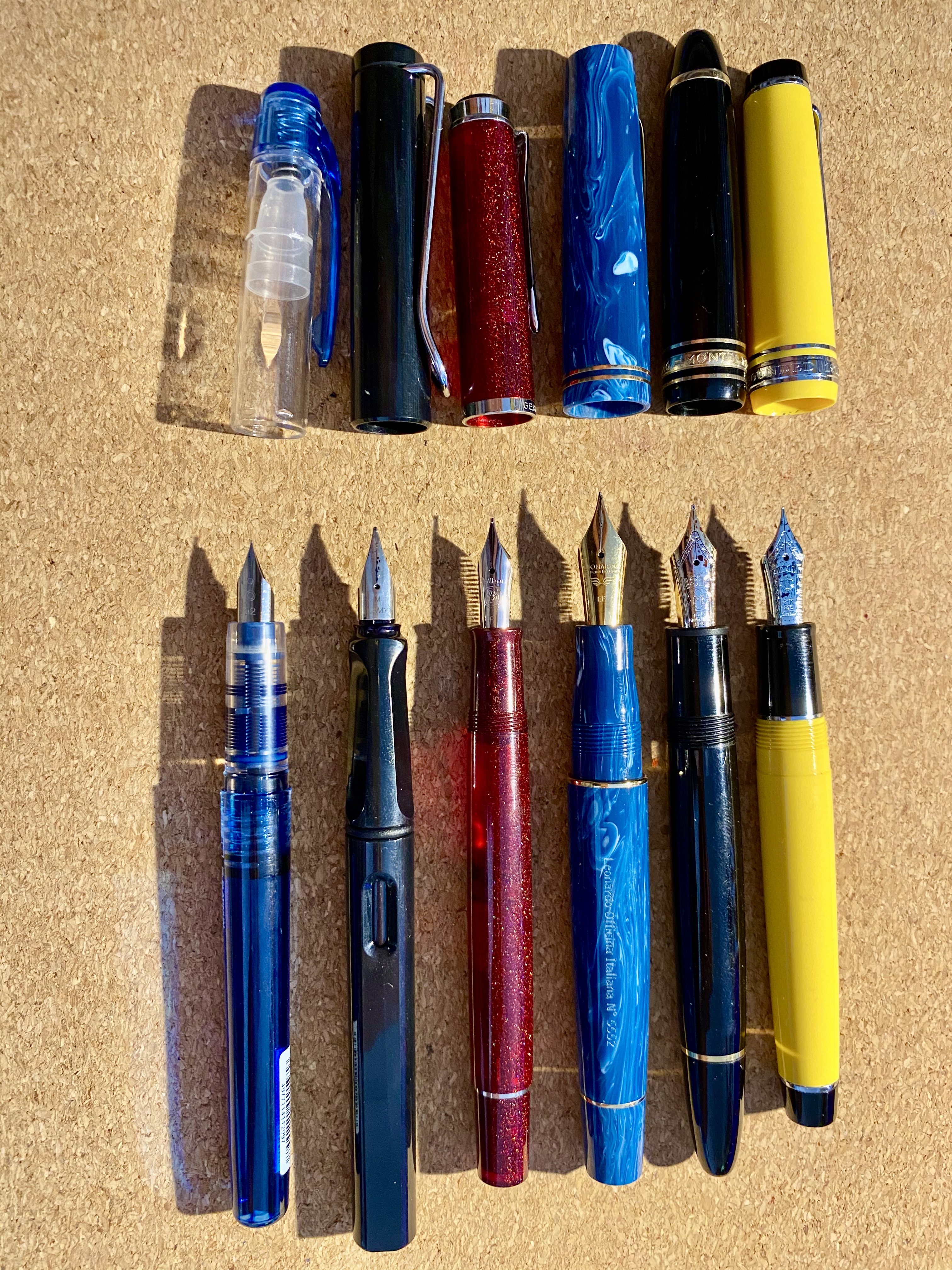 A casa: la nostra ultima 5000 con Pelikan 4001 nero; Waterman Man 200 burgundy con Diamine saddle brown; Aurora 88k con 4001 blu. Per errore mi sono accorto che c'è anche la matita perfetta. Domani metto quelle dello studio