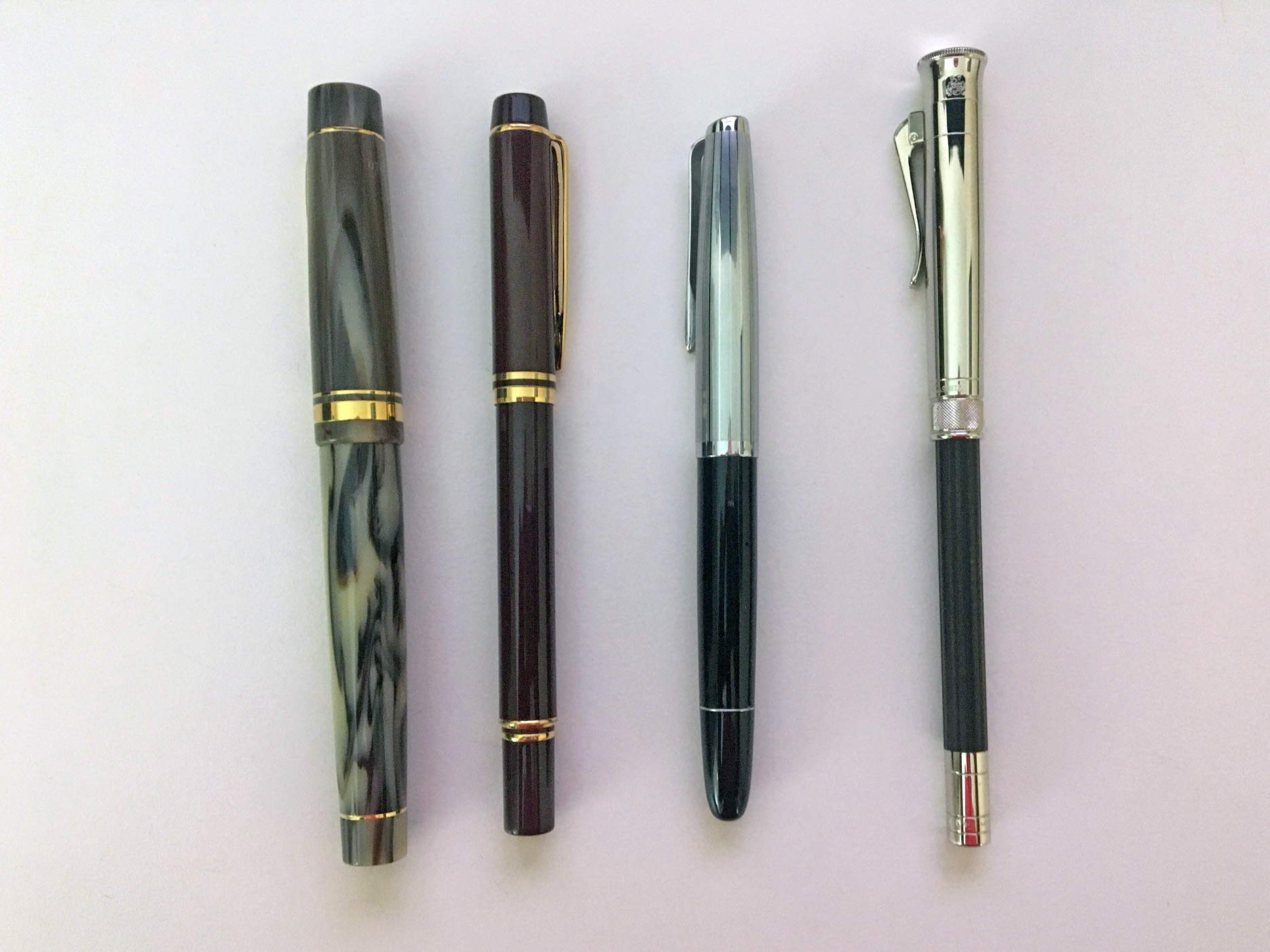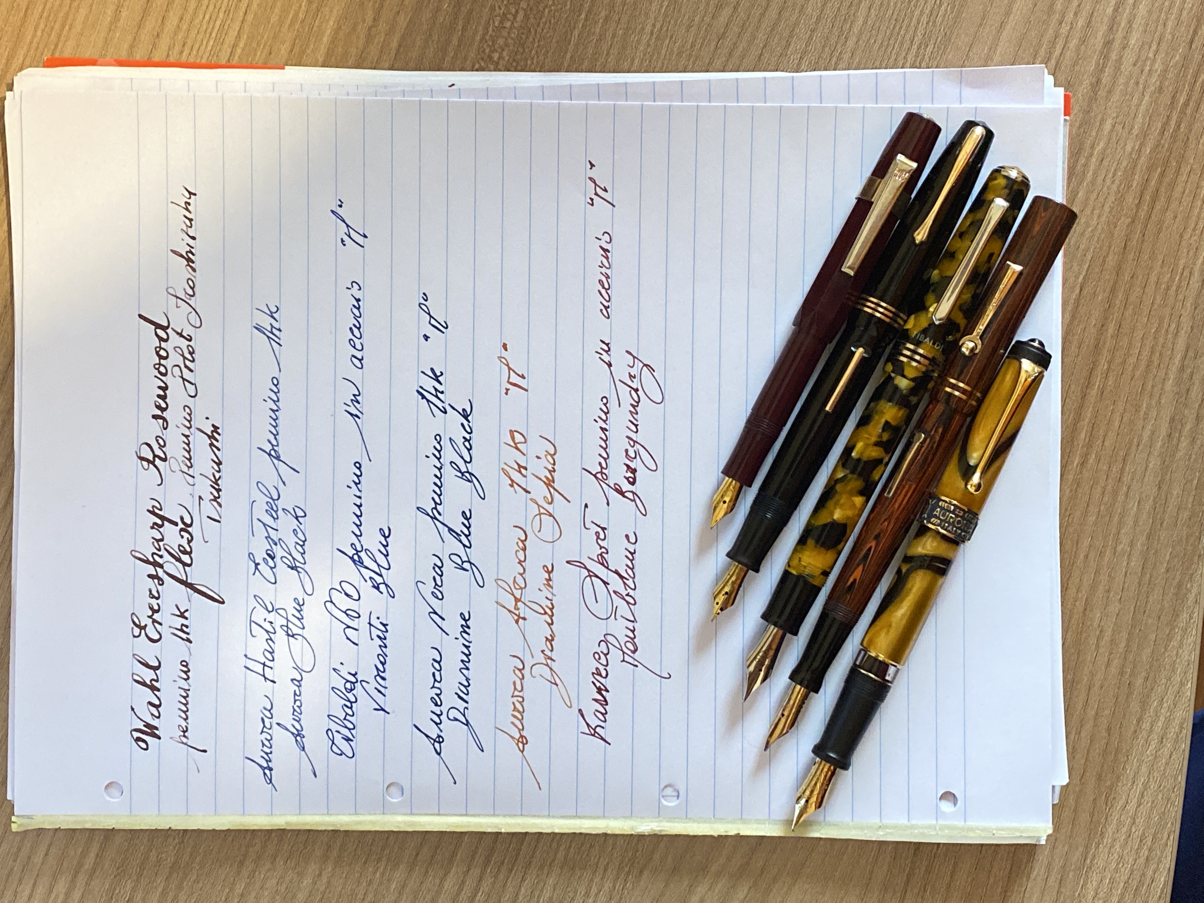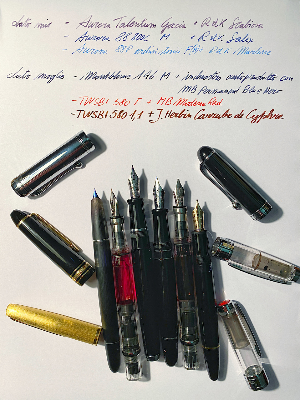 In studio una Montblanc 146 F con R & K Sepia, Aurora Talentum nera EF con Diamine Eclipse, Platinum 3776 Century Bourgogne nib oro 14k F con Waterman Audacious Red, Pelikan M600 old style Nib 18k F con Pilot Iroshizuku syo-ro.