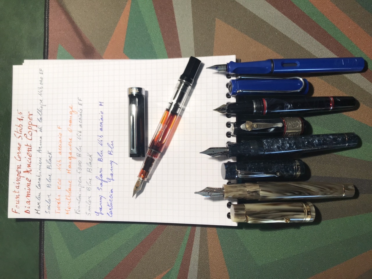 A casa ne ho 4, 2 Fountainpen 5.000 la corno e la blu, una Twsbi trasparente e un Lamy Safari