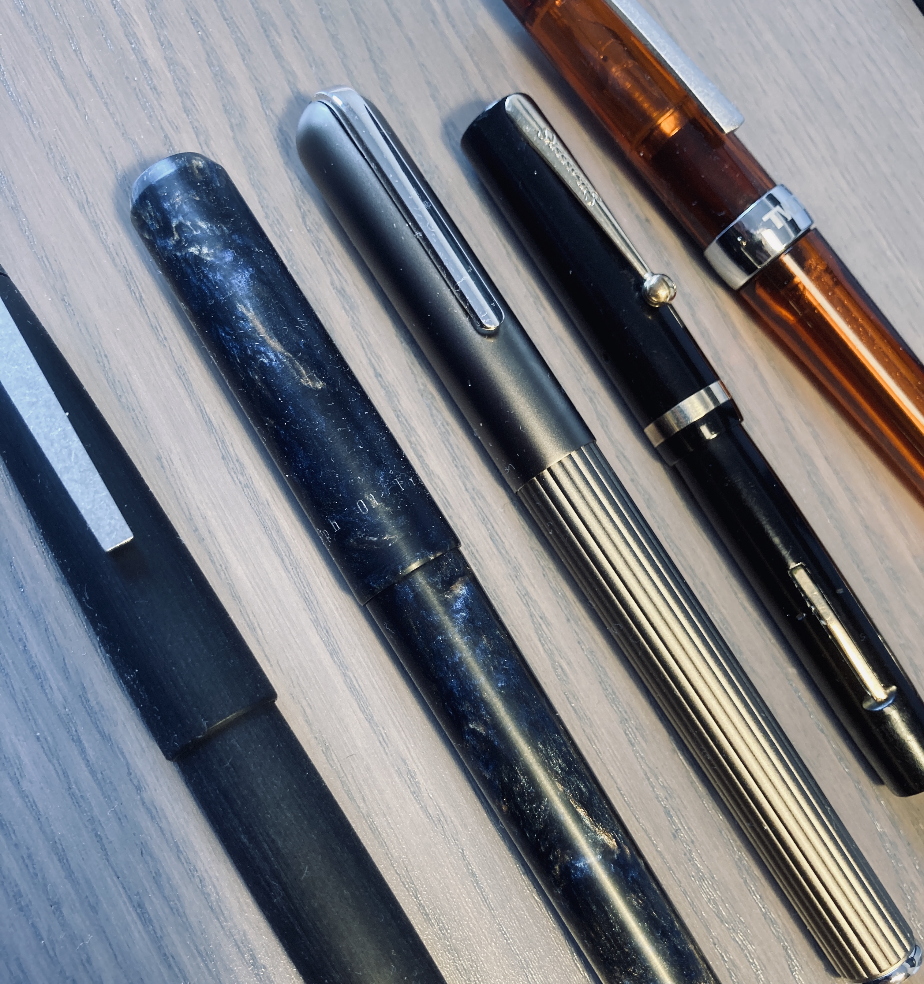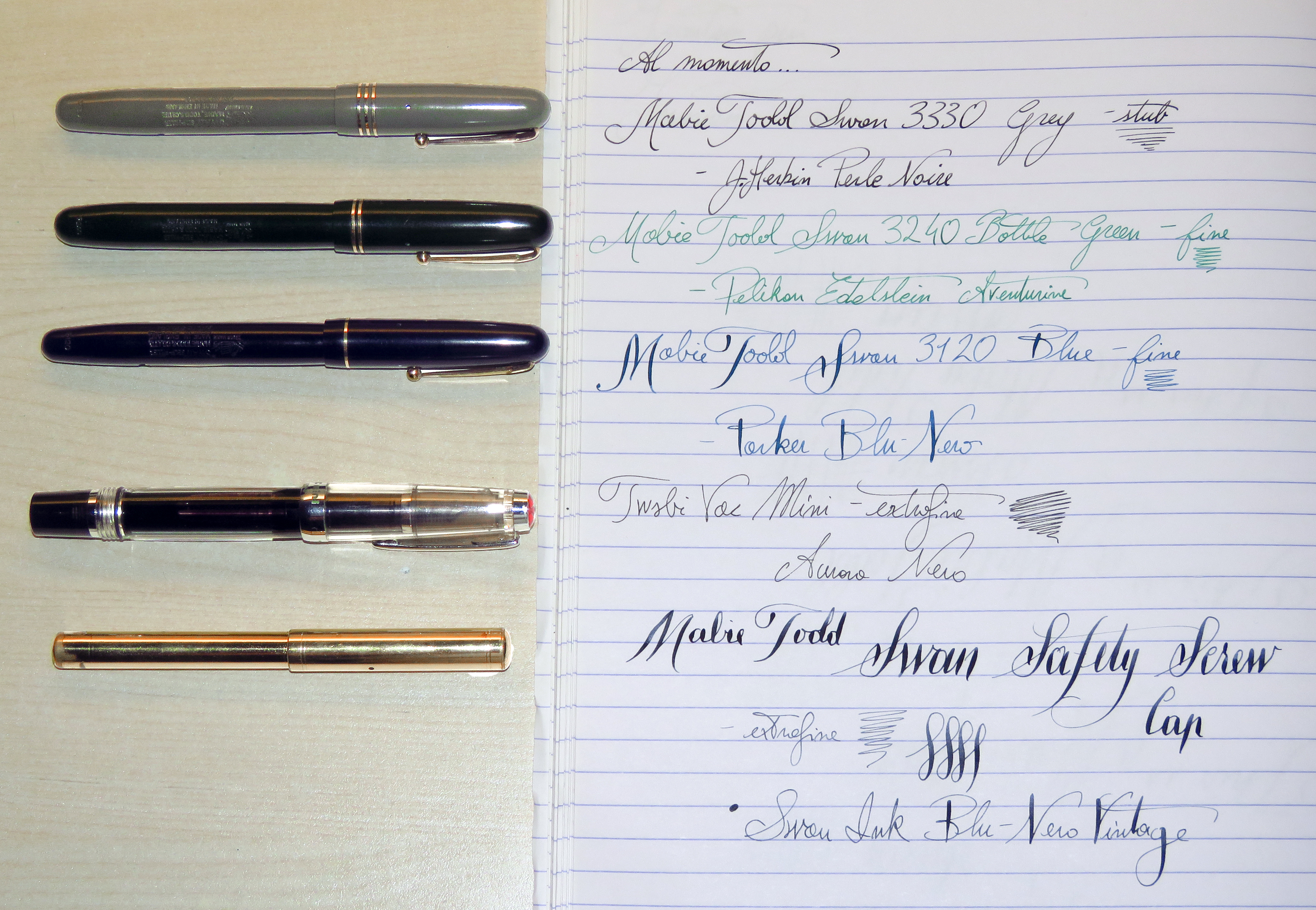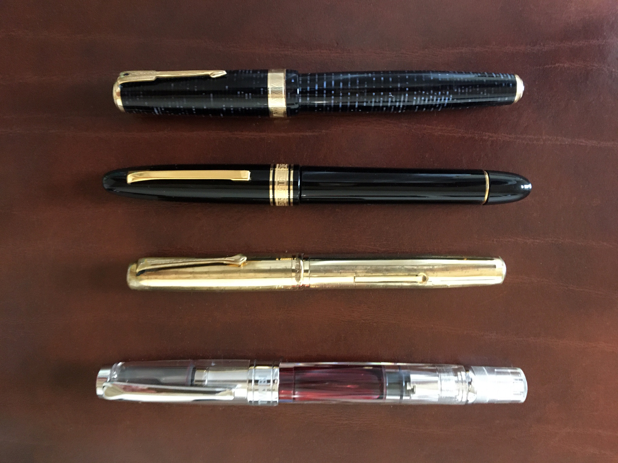 Sulla scrivania in studio la Parker 75 con inchiostro Parker blu, la MB 149 con inchiostro MB nero, una Omas Milord con inchiostro Pelikan blu, una Pelikan 400 con inchiostro Diamine Oxblood, che confermo essere un marrone ma assolutamente di mio gusto, e da ultima una Shaeffer Nononsense caricata con Pelikan verde scuro.