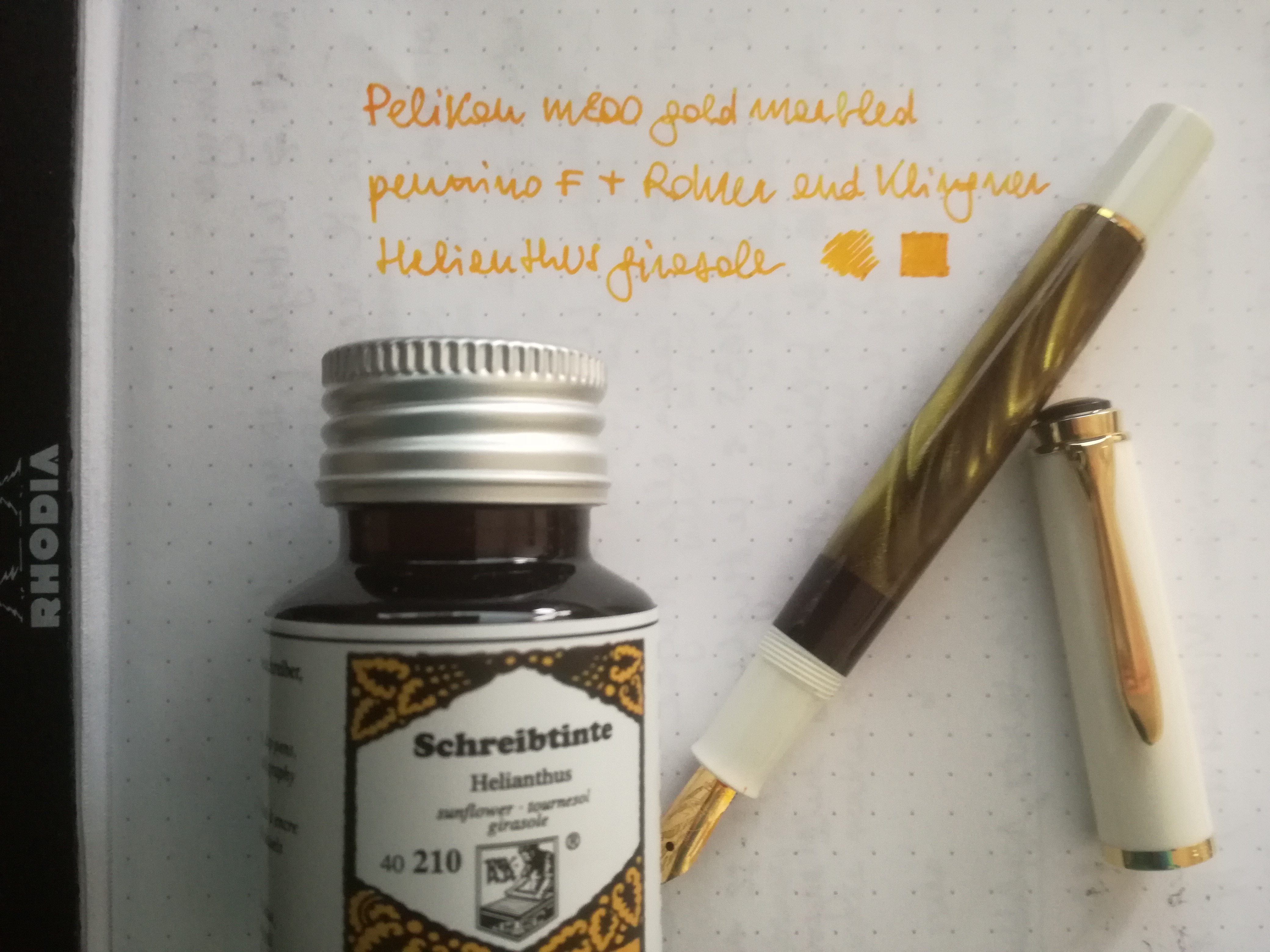 L'abbinamento tra la m200 Pelikan in versione speciale gold marmorizzato e questo giallo girasole della Rohrer & Klingner è davvero bello. Questo è il mio giallo preferito: uno dei pochi colori chiari chiari che secondo me è davvero possibile utilizzare anche come inchiostro per scrivere appunti (nota: all'inizio sembra troppo chiaro, ma dopo che si asciuga diventa più scuro!!!).