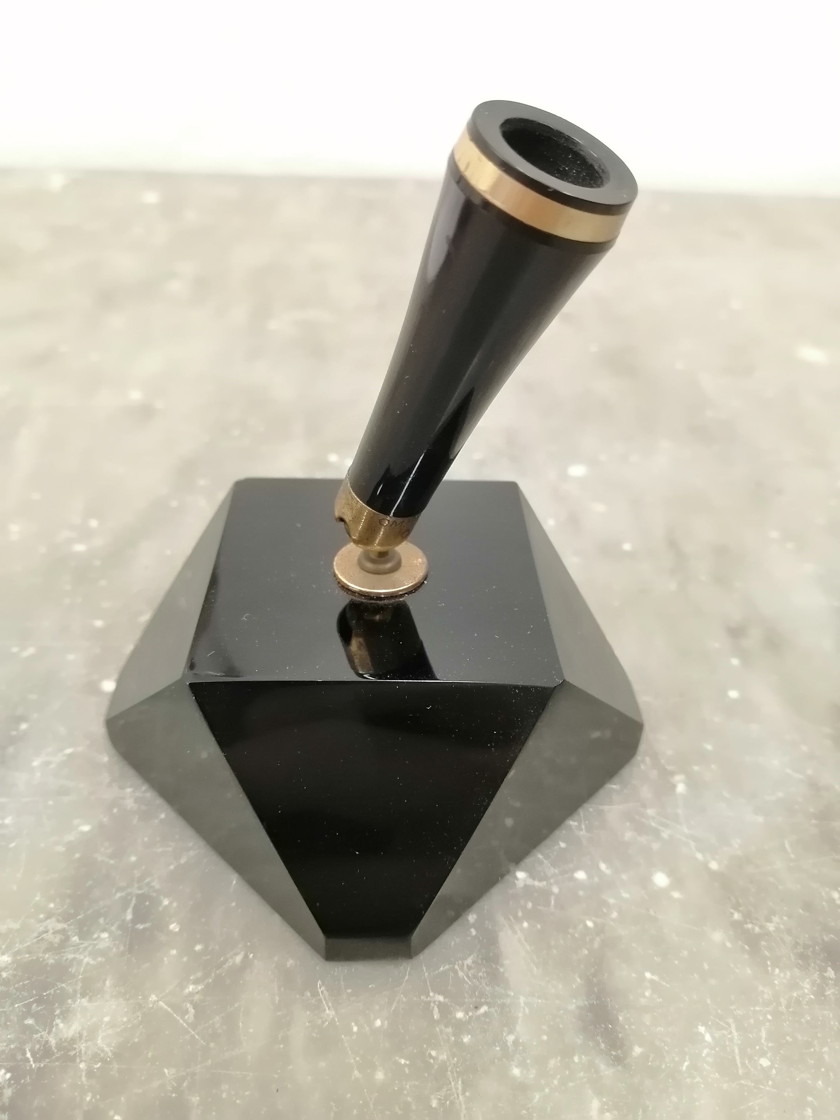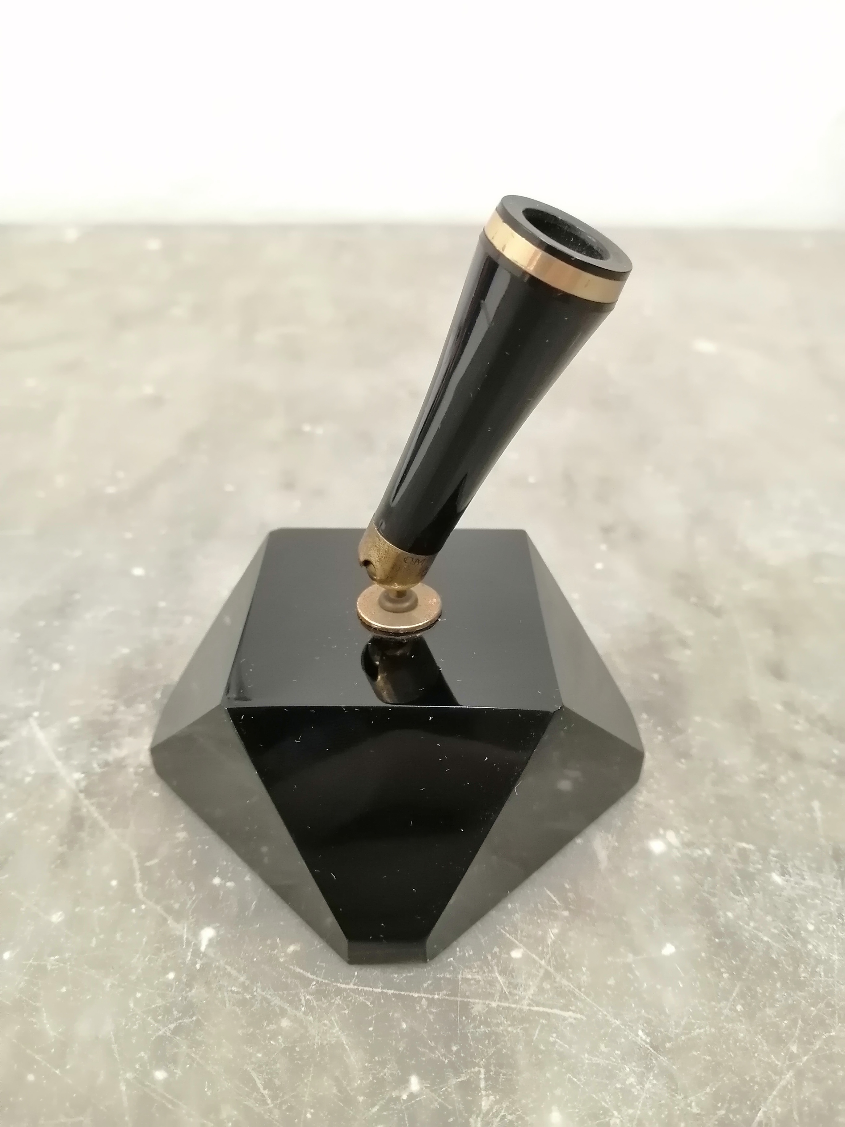 Dalle sue foto non si vedeva la scritta omas ma appena ho visto la forma mi sono ricordato di averla già vista sul sito del gm sanpei. Stessa base nera ma stiloforo e penna di colore arancione, descritto come "omas suite", datato anni sessanta. Qui il materiale della base era descritto come vetro nero sfaccettato, e non marmo... In realtà anche a me sembra vetro.