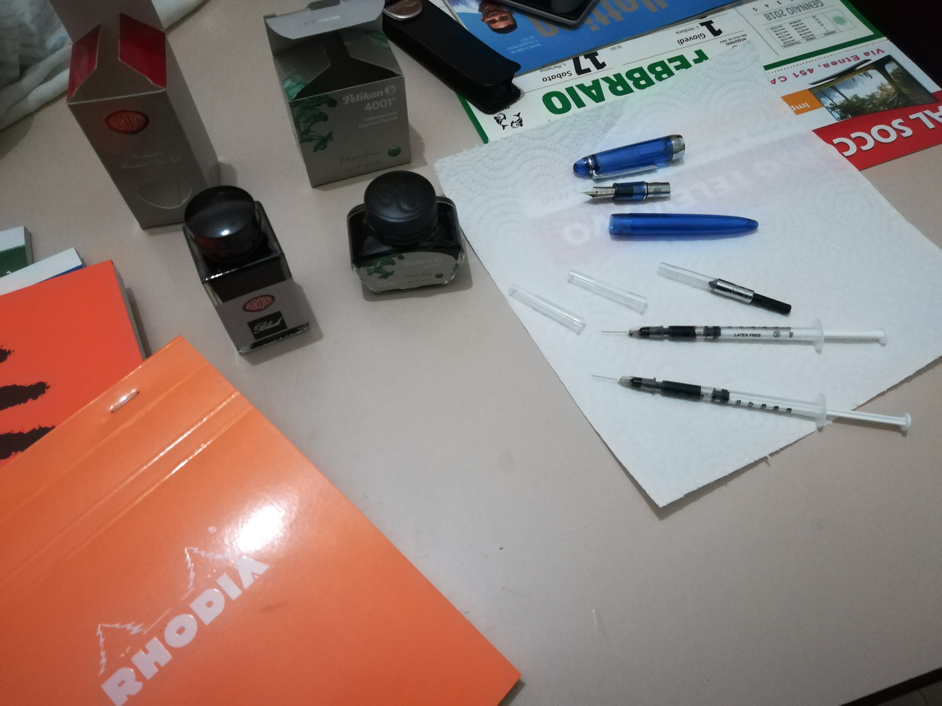 Con due siringhe da 1ml ho aspirato 0.25 ml di Aurora Black e 0.25ml di Pelikan 4001 Dark Green, ho, quindi, riversato - preso dall'euforia per la tinta ottenuta - senza indugi, il tutto nel converter della mia Sailor Shikiori Uchimizu ed ho usato l'accortezza di reinserirlo mentre il pennino era rivolto verso il soffitto. Non sono sicuro di avere la pressione ottimale all'interno del converter (noto una erogazione un pelo più generosa, forse merito della fluidità dell'Aurora Black?!) Ad ogni modo per adesso la penna sta scrivendo senza problemi di sorta e con la tinta che tanto ho cercato. Volevo chiedervi secondo voi dopo quanto tempo senza problemi posso ritenere questa miscela sicura? Grazie infinite.