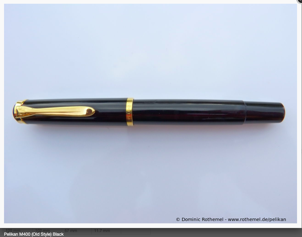 • La penna in questione è una M600 pre 1997 che ha le stesse dimensioni della M400 attuale dalla quale è distinguibile grazie all'unico anello tra corpo e stantuffo. Ho portato a prova di ciò i dati consultabili su pelikan-collectibles.