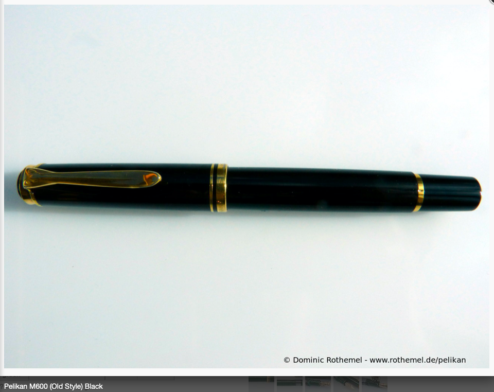 - La penna in questione è una M600 pre 1997 che ha le stesse dimensioni della M400 attuale dalla quale è distinguibile grazie all'unico anello tra corpo e stantuffo. Ho portato a prova di ciò i dati consultabili su pelikan-collectibles.
