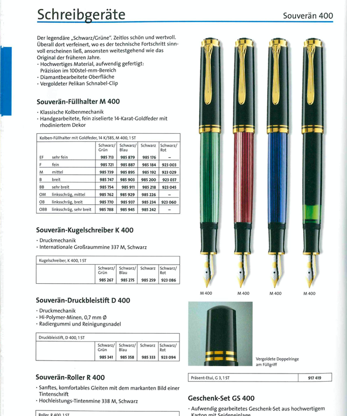 ) con doppio anello. Dopo aver visto queste immagini devo ammettere che stavo per rinunciare a continuare a spulciare il sito pelikan-collectibles ma poi per fortuna ho trovato tra le sue pagine i cataloghi della Pelikan. Purtroppo nei suoi cataloghi la Pelikan mostra le penne aperte con il cappuccio infilato sul retro e quindi non si vedono gli anelli. Però nel catalogo del 2003 nella pagina dedicata alla M400 c'è un dettaglio del pomello di ricarica dove si vedono chiaramente i due anelli (allego foto del catalogo) escludendo definitivamente che la mia penna possa essere una M400 di quegli anni. Almeno questa è una mia deduzione logica da profano. Naturalmente tengo in altissima considerazione i vostri pareri che sembrano dare ragione alle mie semplici deduzioni.
