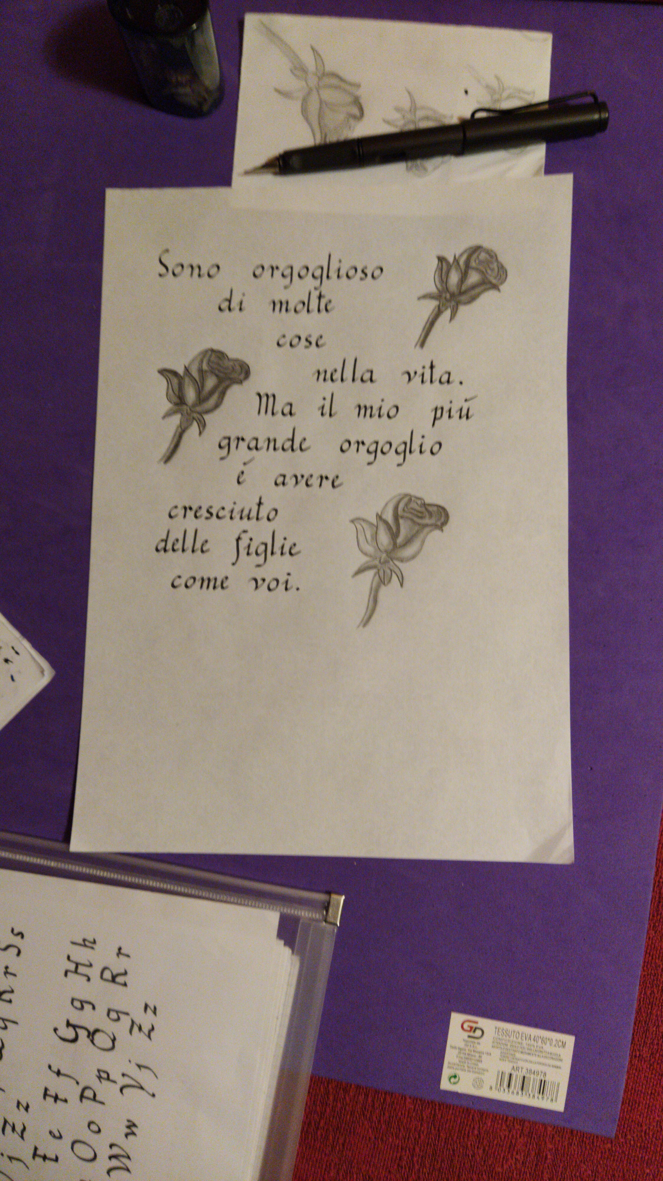 Domanda: vedo che usi un pennino identico a quelli che ho io, la lettera "a" minuscola in quanti tratti la fai? Con due tratti ho una "a" riconoscibile ma alquanto brutta, per farla come voglio io me e vogliono 3. Primo la conchetta, secondo il discendente con la grazia di uscita, terzo il coperchio. Un problema che incontro è la conchetta, quando devo guidare il pennino verso l'alto il flusso d'inchiostro cessa. Non c'è verso che possa fare tratti "controvento" per così dire. Ho un pennino disgraziato o c'è un segreto che mi deve ancora venir svelato?