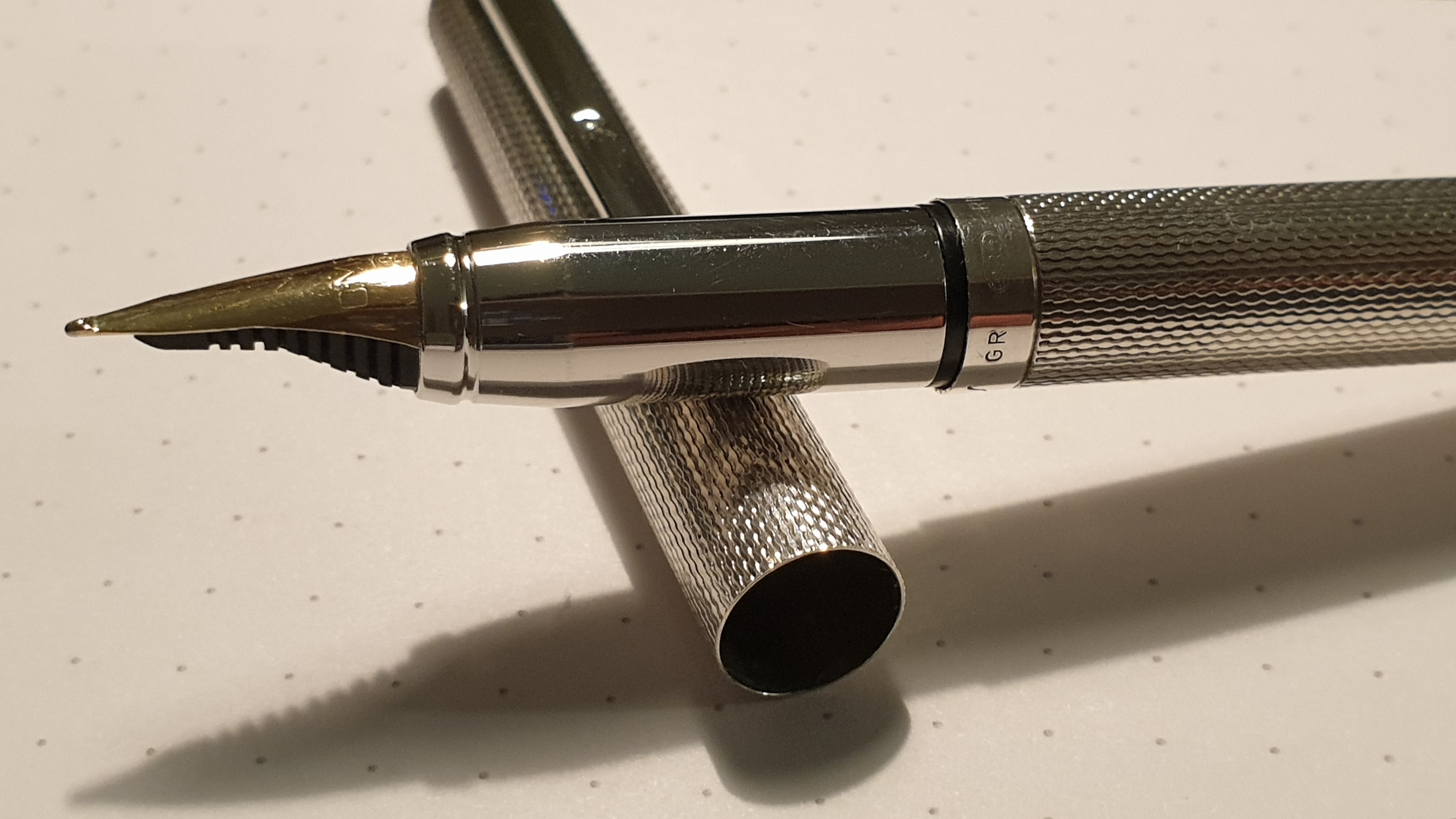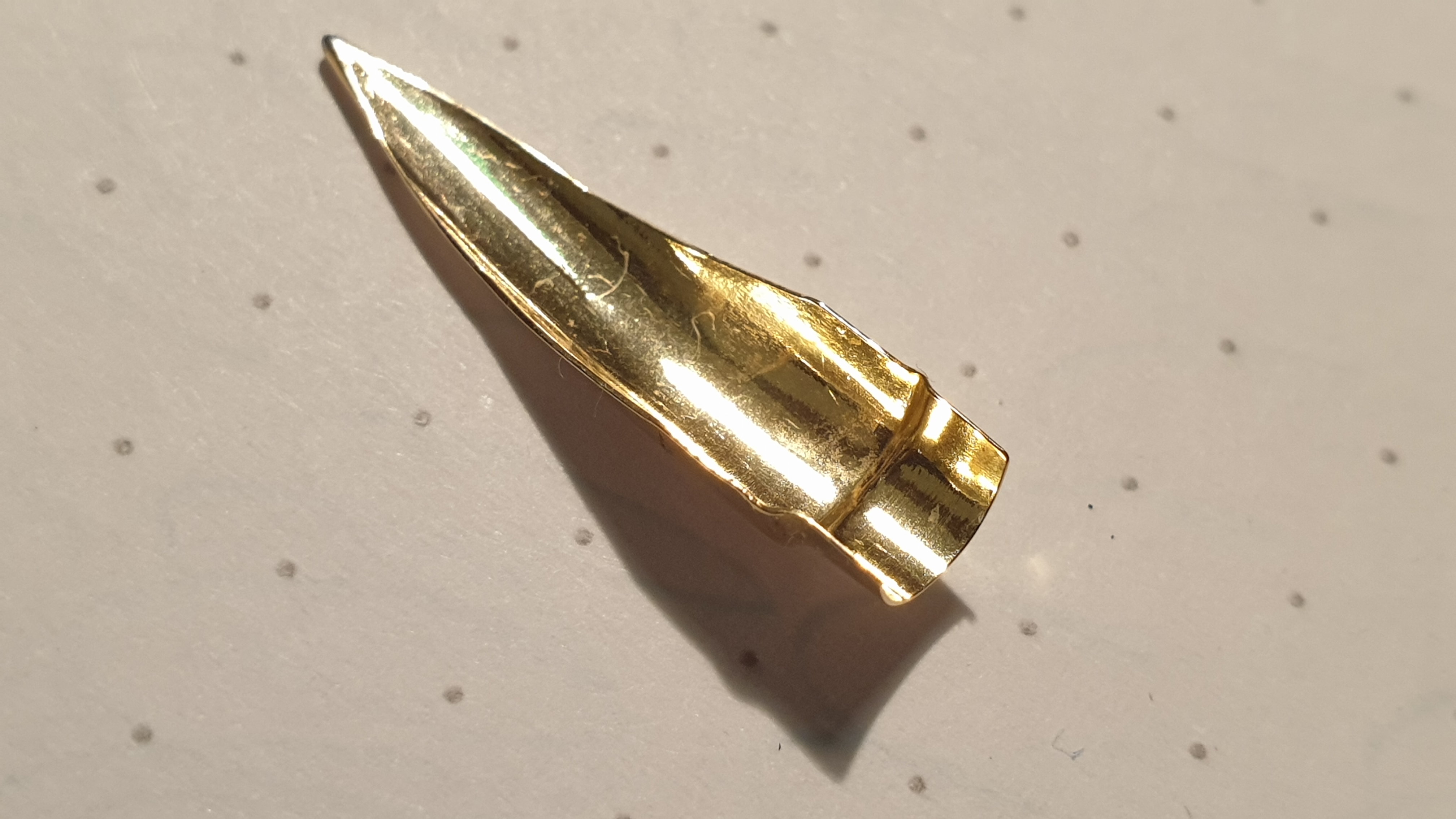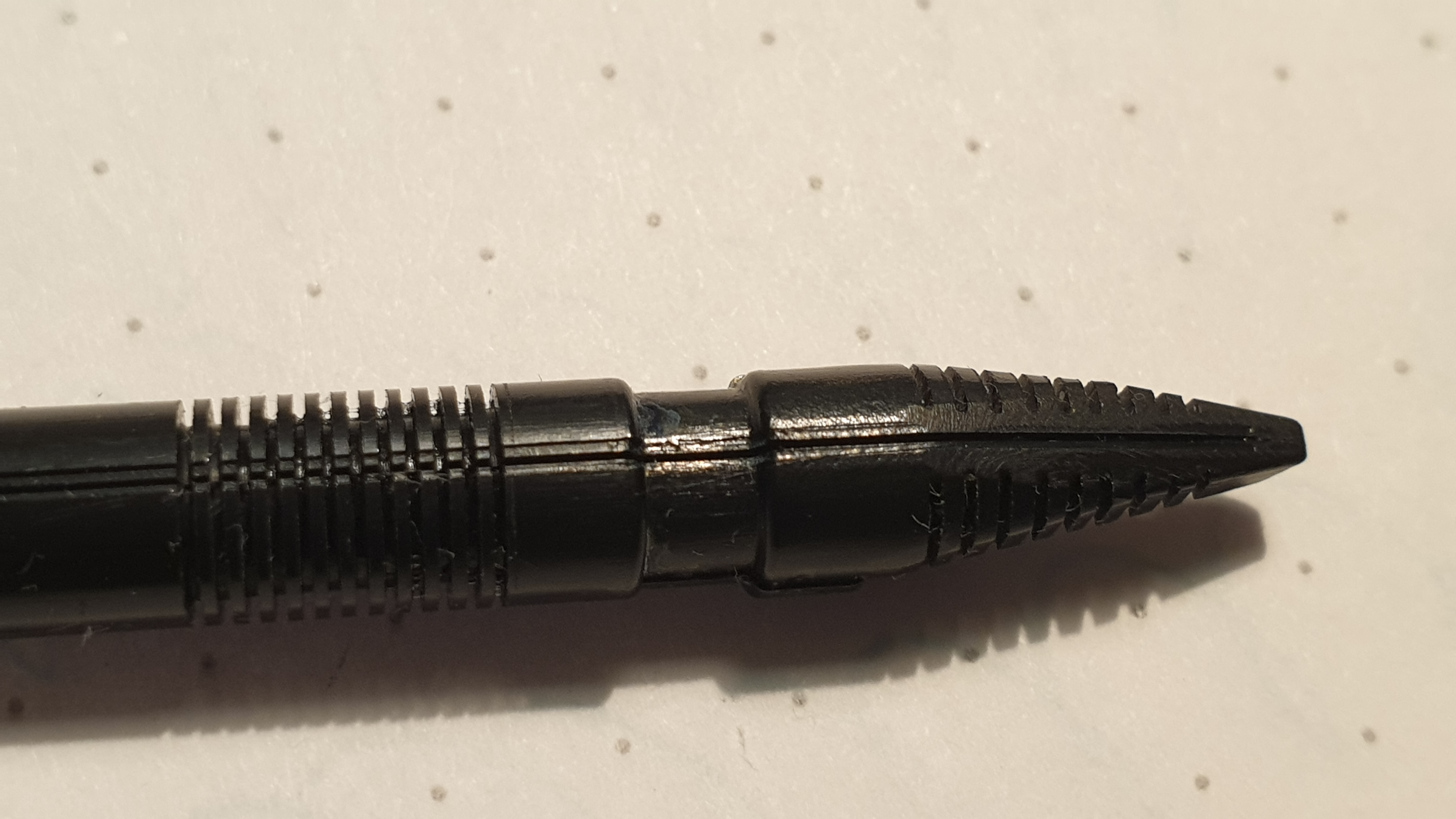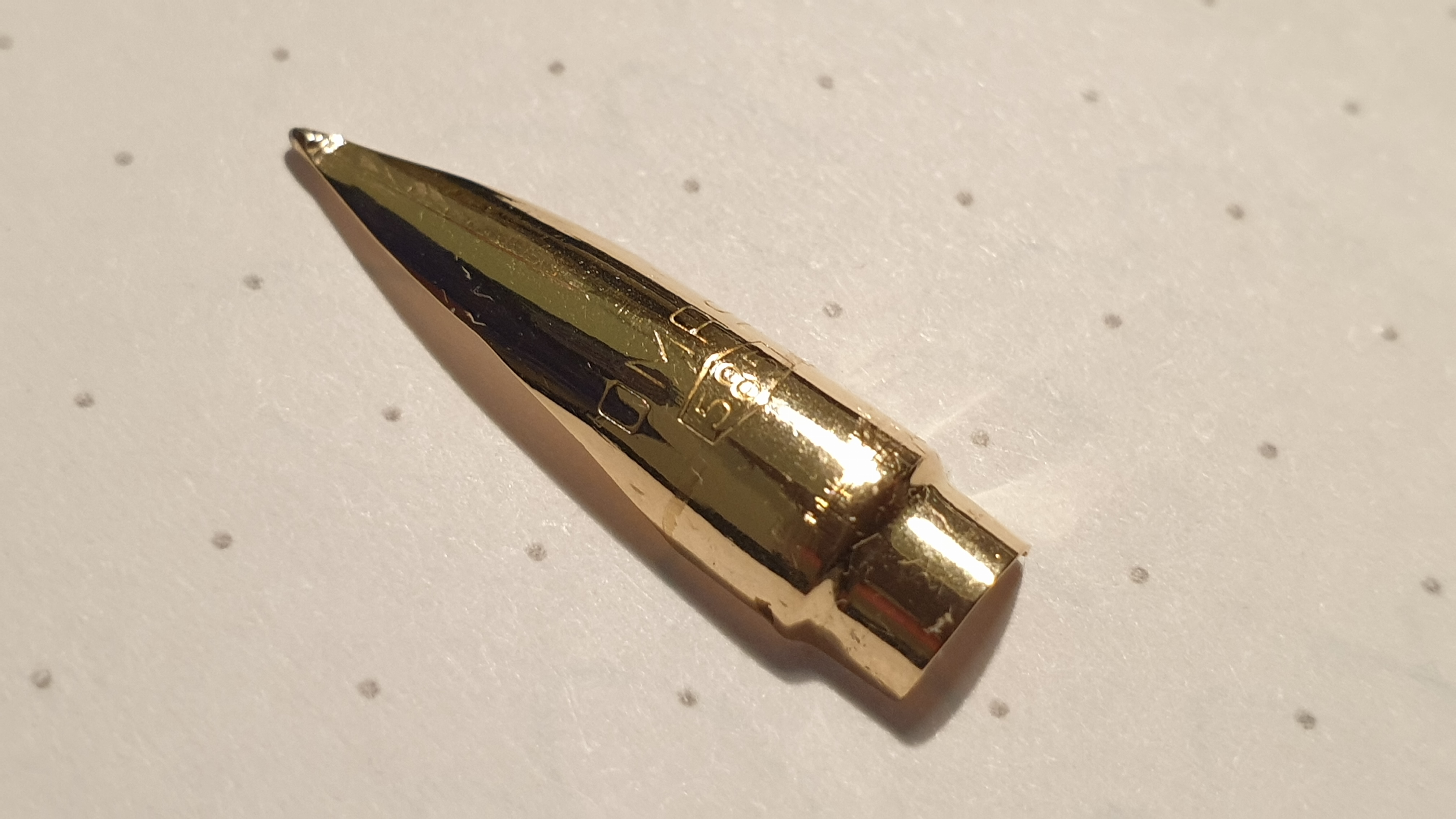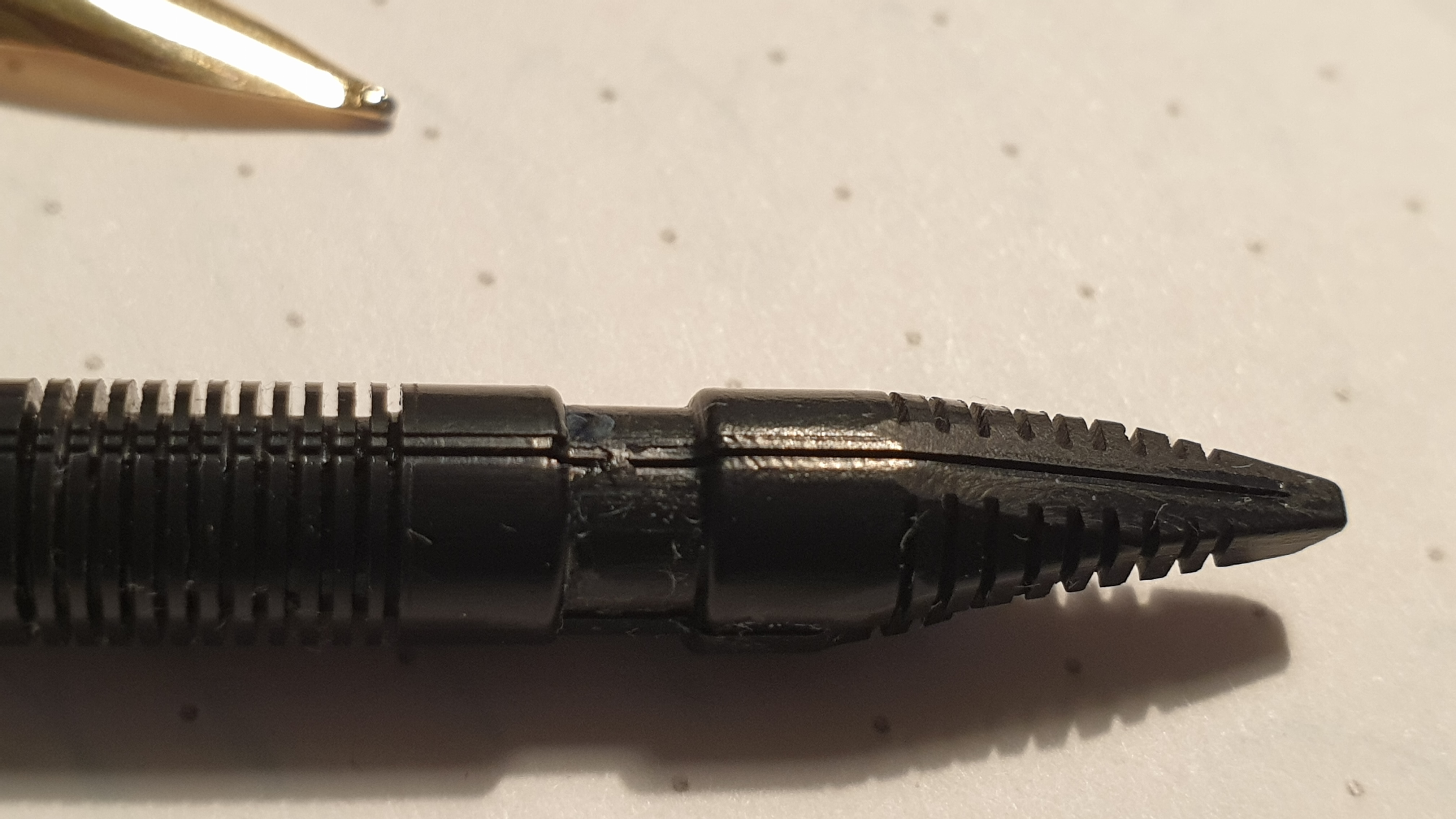 Non vi descrivo la delusione provata dopo aver comprato questa bellissima penna vintage ed aver scoperto che scriveva molto peggio di una qualsiasi penna economica, con flusso magro e frequenti "stop and start", anche dopo un lavaggio per alcuni giorni in acqua e detersivo per piatti. Naturalmente le mie aspettative erano altre, così ho deciso di smontarla completamente e mettere stavolta i singoli pezzi in ammollo, per poi spazzolare delicatamente i canali del conduttore, sciacquare il tutto in acqua limpida, rimontare la penna e testarla di nuovo: peggio di prima! In preda ad una crisi, quando stavo per dare l'estremo saluto alla bambina, con relativa degna sepoltura, ho avuto un'illuminazione; così ho deciso di smontarla nuovamente ed osservare con la lente d'ingrandimento l'intero sistema di canali del conduttore. Bingo! Sulla parte del canale principale dove era posizionata la coda del pennino, c'era del materiale plastico frutto di un difetto di stampaggio e di un successivo controllo qualitativo poco accorto o forse inesistente, non notabile ad occhio nudo. Una volta rimosso il corpo estraneo dal canale con uno spillo, spazzolato nuovamente il conduttore, risciacquato e rimontato il tutto, la penna ha iniziato subito a "volare" sul foglio... come nei video di Marco Chiari! ;)