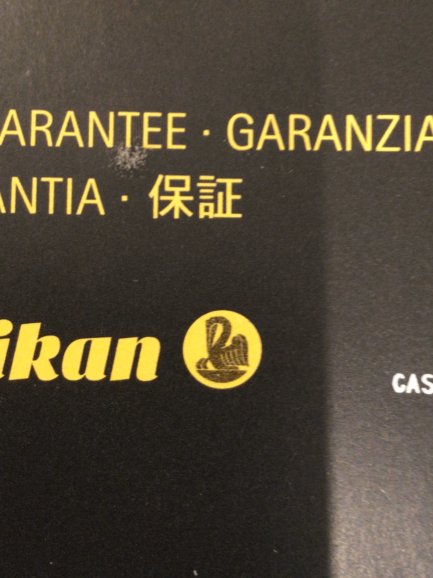 La penna in questione sembra essere stata prodotta nella Germania Ovest come si vede nella scritta sull'anello dorato del cappuccio. Il pennino è in oro 18k monotono anche se alcun zone sembrano più scure. La misura e il peso rientrano tra quelli dichiarati dalla Pelikan per le M600 old style. Rimane il grande dubbio del perché sul cappuccio ci sia scritto 14k F mentre in realtà è un 18k M. Sul libretto della garanzia non c'è scritto nulla riguardo al modello ma c'è una voce in cui si presentano i pennini disponibili per una eventuale sostituzione entro le 4 settimane dall'acquisto. Nessuno di questi pennini è in oro 18k ma sono tutti segnati come 14c-585.