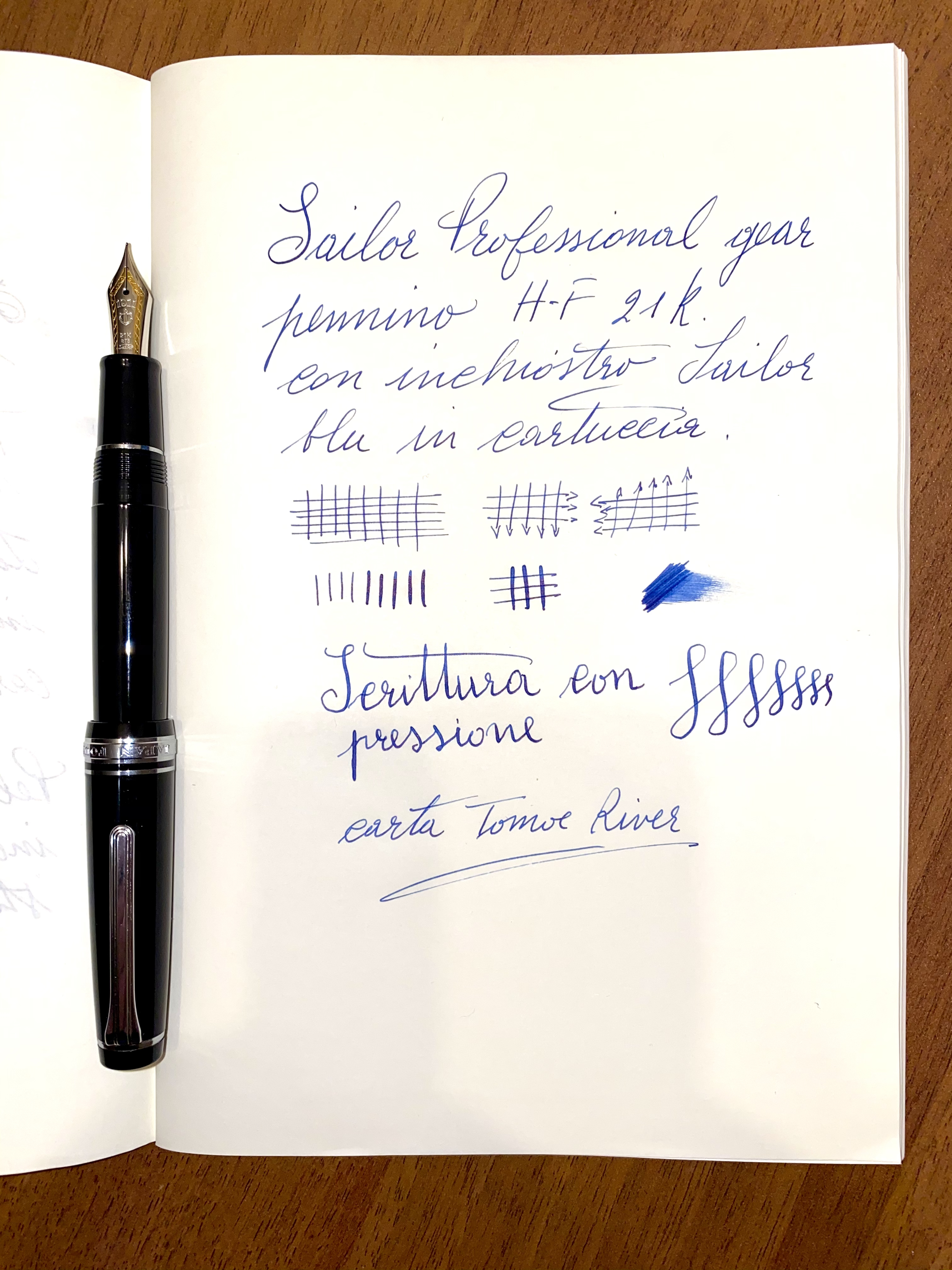 Ciao, qualche giorno addietro ho ricevuto una Sailor professional gear con pennino H-F 21k. La H penso indichi un pennino hard, duro, ma invece è morbido e docile. Uno spillo, questo va detto, ma assolutamente non un chiodo. Esperienza di scrittura piacevolissima anche andando veloce. Non perdo tempo a descriverla, tutti la conoscono bene o male. Siccome nell'annuncio di vendita c'era una foto in cui veniva descritta la diversa morbidezza dei pennini Sailor, in acciao, 14K e 21K, e quest' ultimo veniva indicato come il più morbido, ho voluto constatare e condividere con voi questa mia piccola curiosità soddisfatta. Allego qualche foto. La grafia, quando tento di scrivere con pressione sembra quella di un bambino delle elementari :mrgreen: