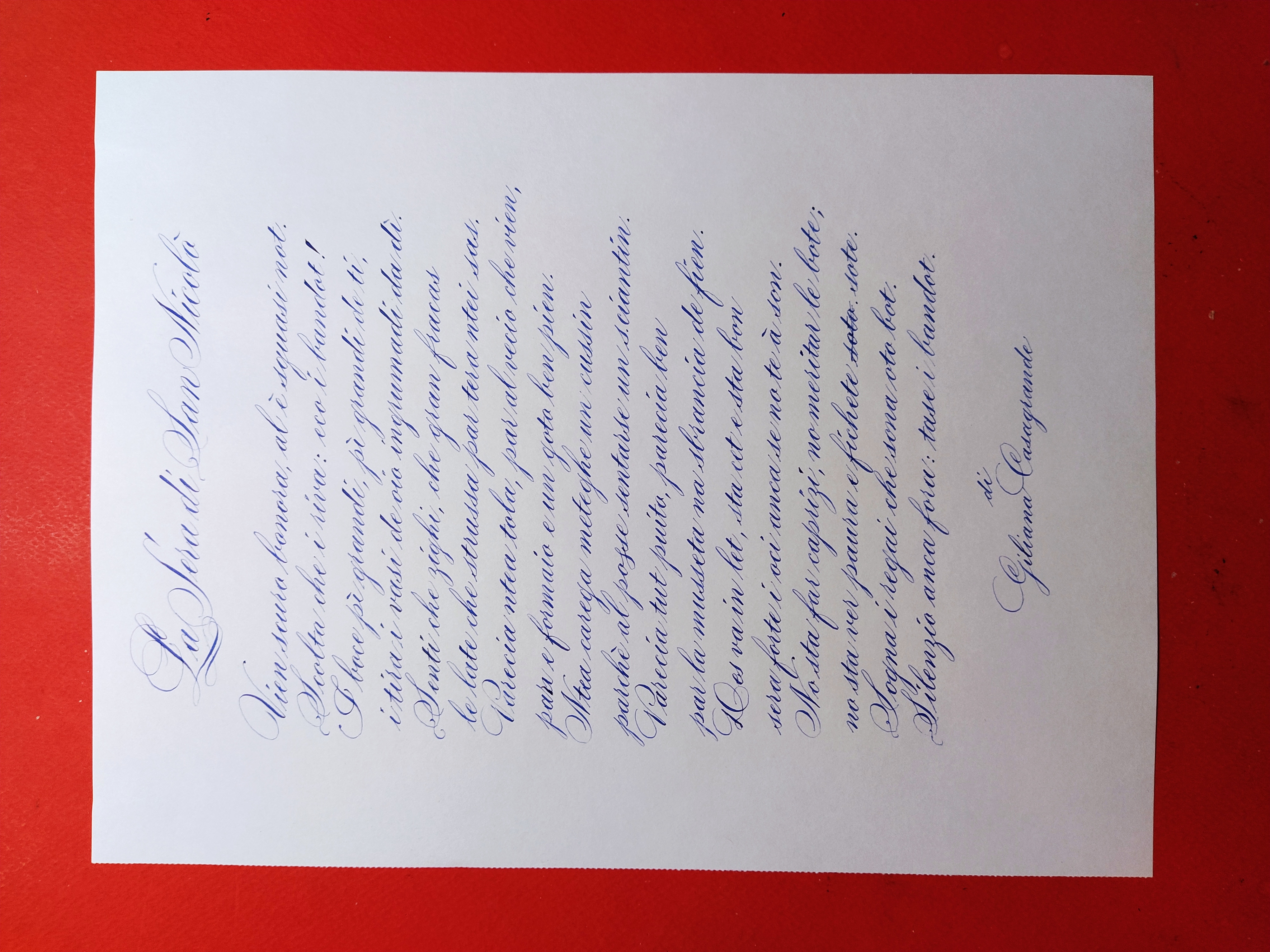 Ringrazio tutti per la smisurata benevolenza riservata ai miei tentativi calligrafici, e in particolare a Fufluns che ha dato avvio, con la sua pregevole sensibilità e capacità, a questo anticipo di auguri natalizi. Da parte mia l'occasione è tempestiva per ricordare che nella mia zona (alto trevigiano) questa sera era la vigilia (per noi bambini di allora) più importante anche del Natale, perché stanotte passava San Nicolò e domattina al risveglio avremmo trovato i regali (quelli veri...a Natale tuttalpiù qualche dolce!). Quindi era una giornata di forte eccitazione, sottolineata nel targo pomeriggio dai "bandòt" (vasi vuoti di latta legati insieme e trascinati per le strade, facendo un gran fracasso!). Per questo riporto una poesia di Giliana Casagrande, che bene riassume l'atmosfera che (allora) vivevamo. La poesia è nel dialetto delle mie zone ma spero, chiarito a cosa si riferisce "bandòt", che sia sufficientemente "intelleggibile" (altrimenti.... son qua, per chi ne fosse interssato).