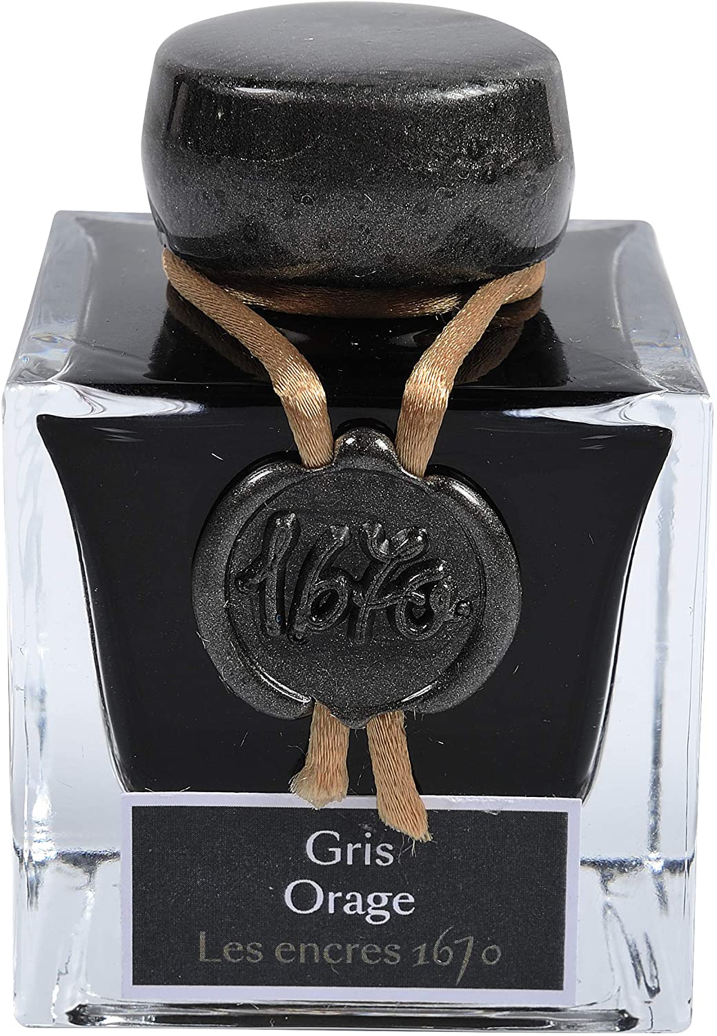 Si tratta di un inchiostro Jacques Herbin della linea 1670, il colore in inglese è chiamato Stormy grey, mentre in francese "gris orage illuminées de paillettes d'or", insomma un grigio tempesta con una puntinatura dorata