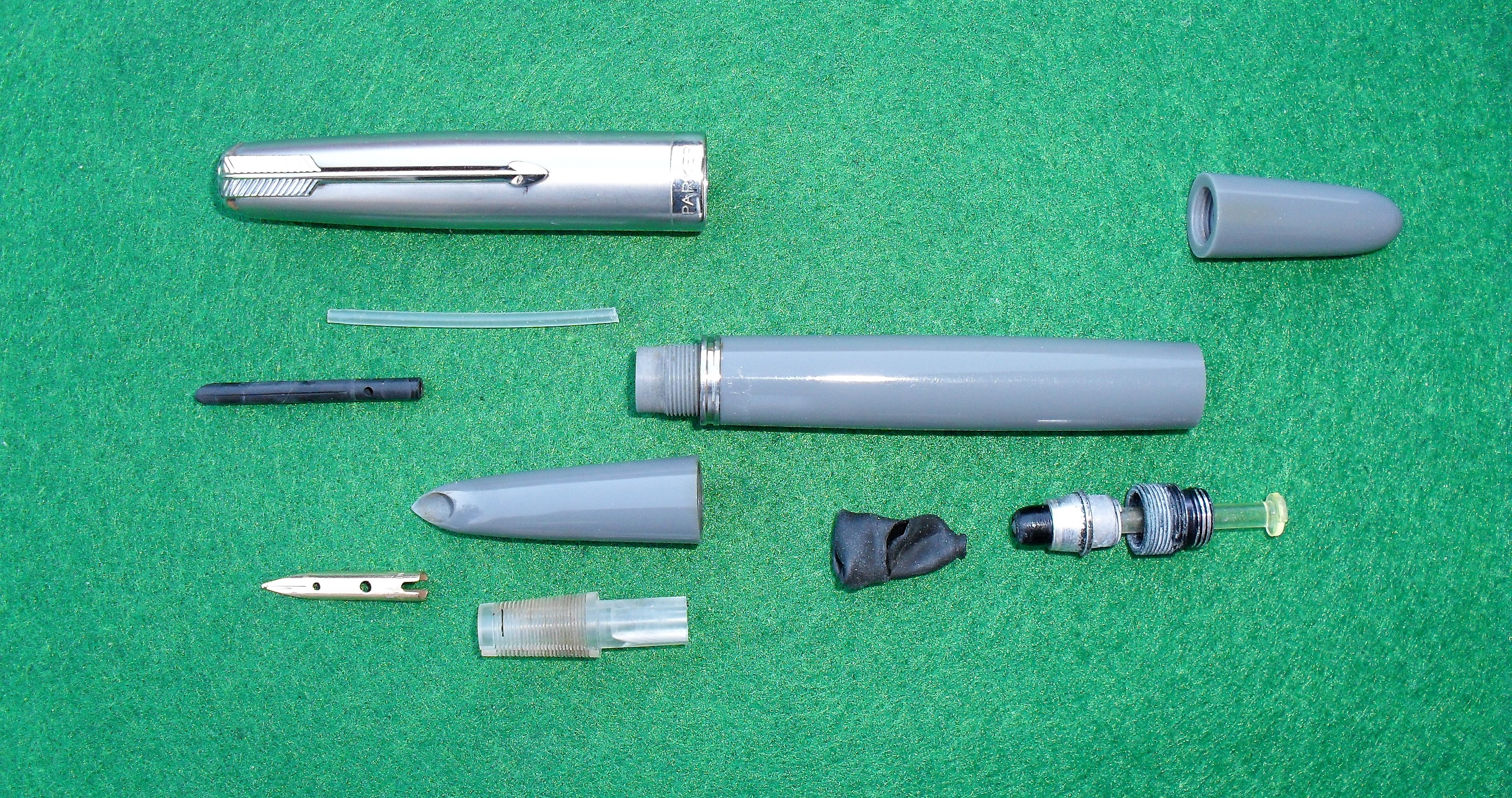 Oggi comincio il mio lavoro di restauro, ma date le buone condizioni delle penne dovrei forse parlare di revisione, di due Parker 51: una Mk 1 Vacumatic del 1948 (se non erro) in "dove grey" ed una Mk II Aerometric del 1969 - 71.