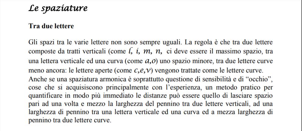Salve a tutti, mi sono iscritto da poco ed ho un dubbio che non riesco a risolvere. Mi sento un po' in imbarazzo perchè sento che sto sollevando una questione banale, che però non riesco a comprendere. Nell'utilissimo manuale di Cencetti e Quinn(Calligrafia Facile), a pagina undici si parla di spaziature tra le lettere. Gli autori distinguono tra lettere verticali, curve e aperte. Anche se c'è una breve descrizione di queste lettere, io non riesco a comprendere la differenza perchè vado totalmente in confusione. Qualcuno, se possibile, potrebbe cortesemente farmi una classificazione completa delle lettere verticali, di quelle curve e di quelle aperte? Allego un'immagine della parte del manuale a cui mi riferisco. Scusatemi, so che la domanda è banale ma sono alle primissime armi nel mondo delle arti calligrafe. Purtroppo sono alle prime armi anche con l'utilizzo del forum e spero di non aver sbagliato sezione.