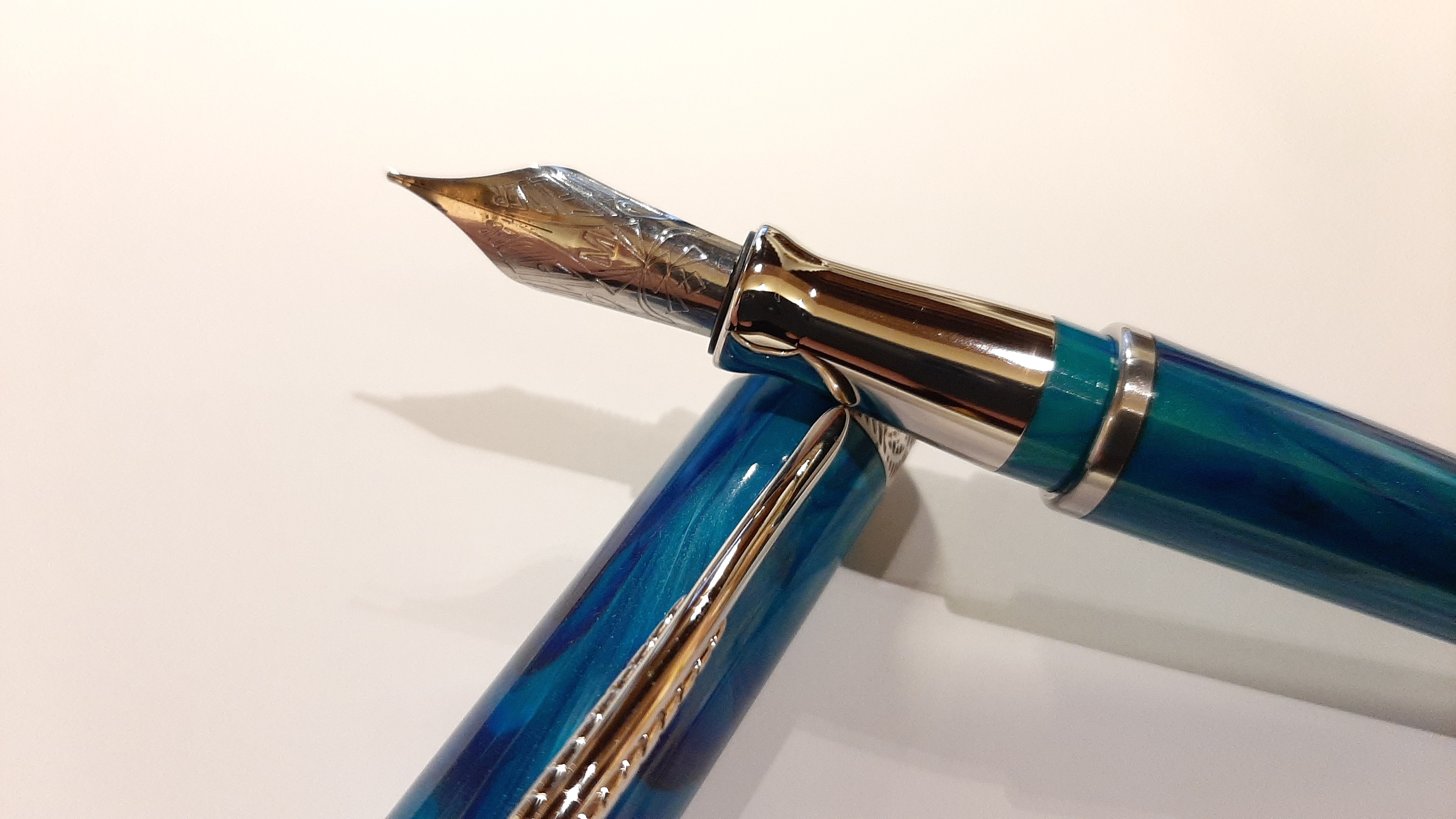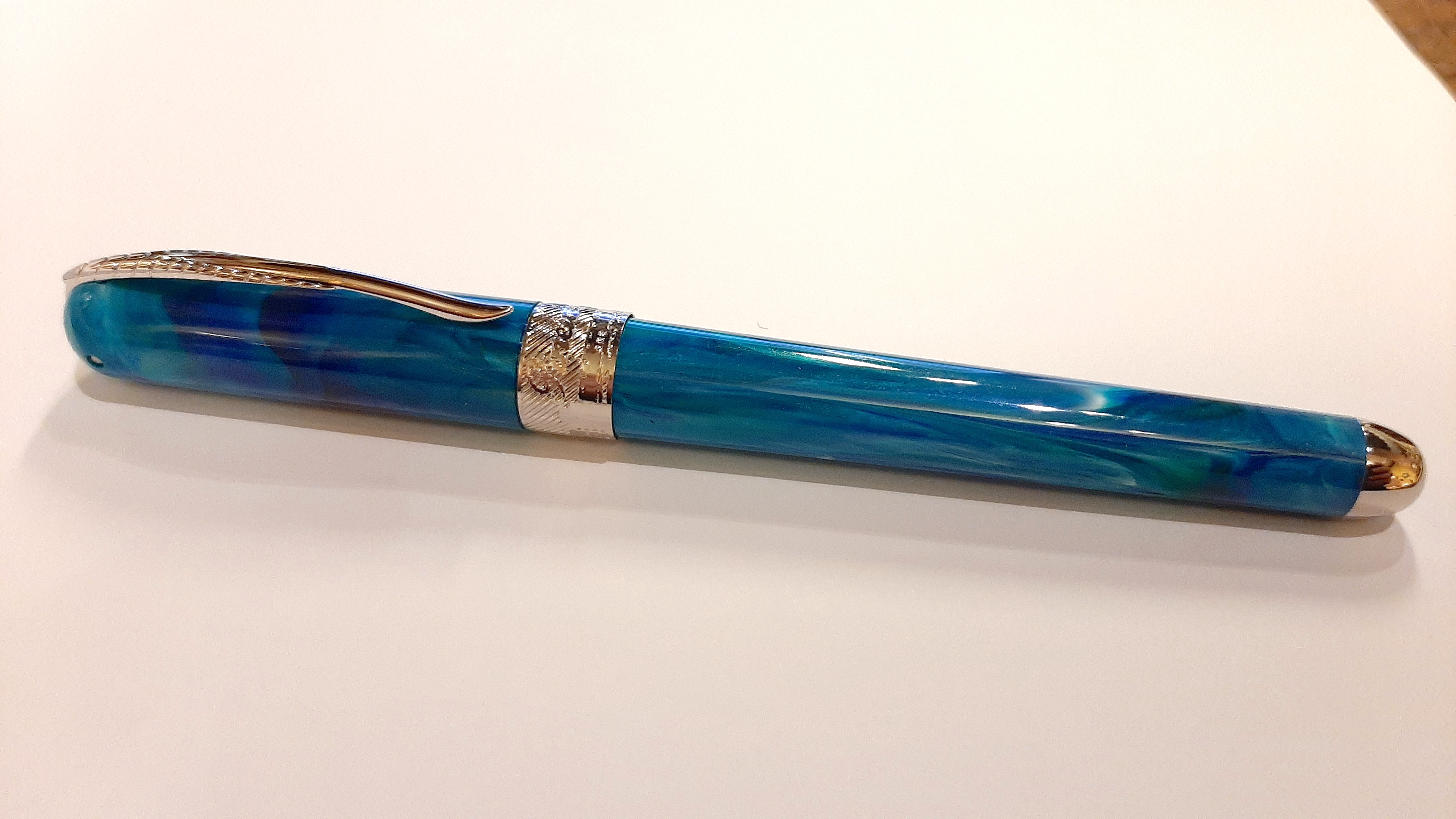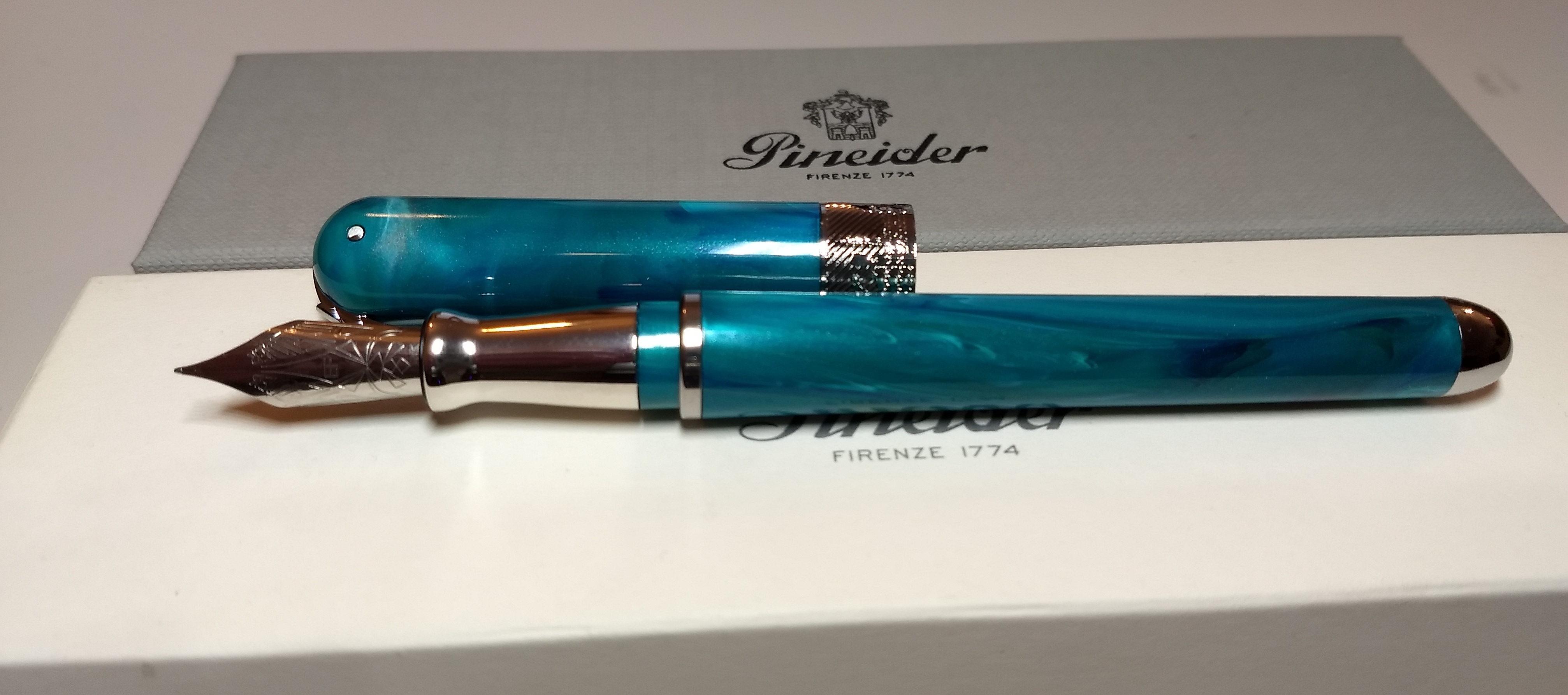 Trovo sia una penna meravigliosa, l'ultra resin di Pineider è davvero fascinosa , l'impugnatura sebbene metallica non è scivolosa e il pennino ef scrive molto molto bene . Tratto europeo ma gradevolissimo. Cappuccio magnetico, niente uso di colla...in poche parole è una penna da avere.