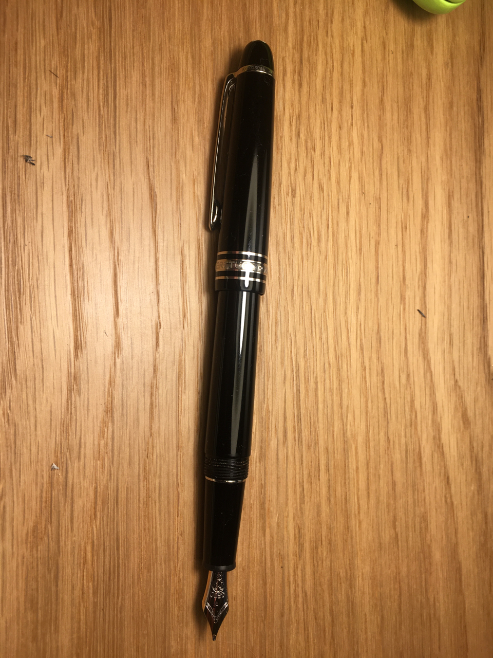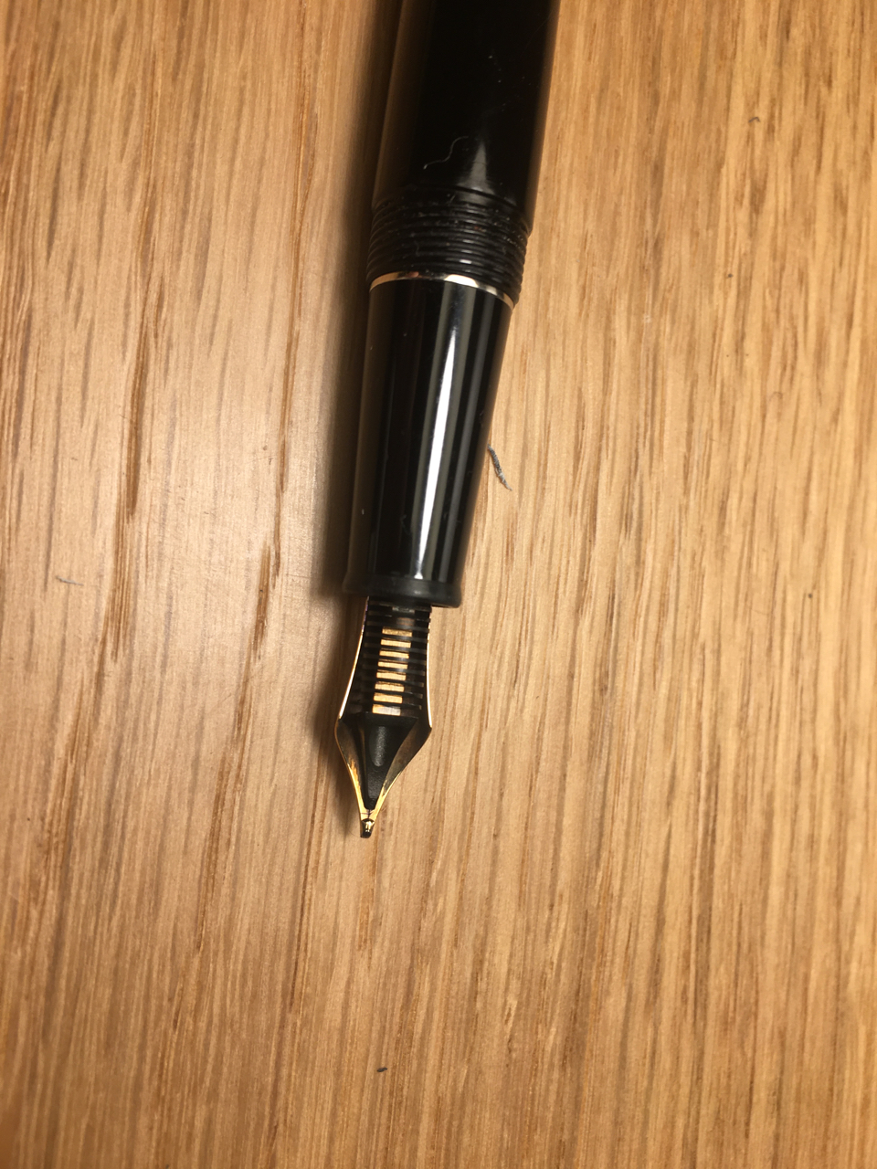 La penna è una Montblanc Meisterstuck 145 classique (o almeno credo, allego qualche foto). Mi è stata regalata quasi 18 anni fa, è del 2003 quindi. In questi anni l'ho utilizzata sporadicamente, lasciandola spesso inutilizzata per parecchi mesi. Quando la riprendevo in mano non ho mai avuto particolari problemi, forse risciaquavo la punta del pennino e, senza fare ammolli (di cui sono diventato esperto in questi giorni) innnestavo una nuova cartuccia (Pelikan 4001 nere di solito) e via. Ad un certo punto ho smesso di usarla ed è rimasta nel cassetto per molti anni. Circa un paio di anni fa decisi di riutilizzarla e come in passato non ci furono grandi problemi a farla ripartire, forse feci qualche ammollo ma più per scrupolo che per problemi reali.