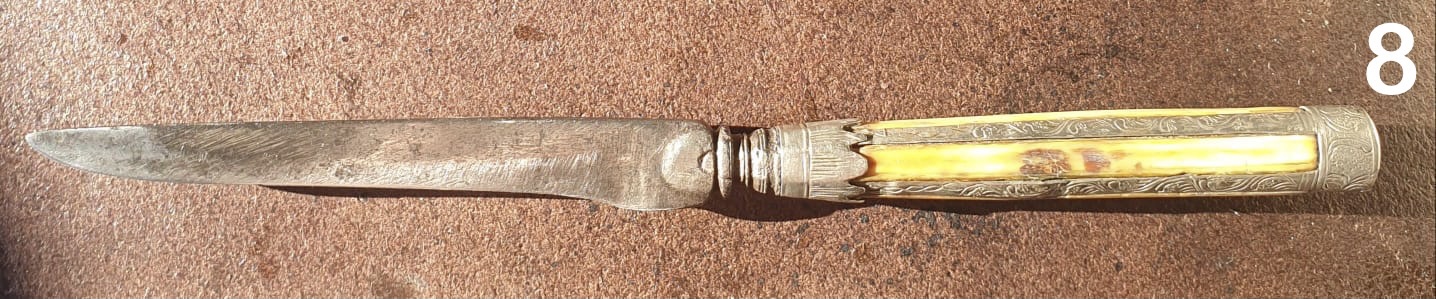 Un'altra delle mie "star" uniche! Foto 1: cinque/seicentesco penner in corno, da cintura. Foto 2: nel dettaglio, da sinistra: porta pennini d'oca (vedi foto 7), sandracchiera, calamaio, coperchio. Foto 3: sandracchiera. Foto 4: sandracchiera e calamaio. Foto 5: dettaglio del coperchio con la gola sede del mancante laccio per cintura. Foto 6: una confezione originale di penne d'oca. Foto 7: confezione di pennini d’oca. Foto 8: stupendo cinquecentesco, coltellino in avorio, argento ed acciaio, proveniente da casa dei nonni, a Montagnana.