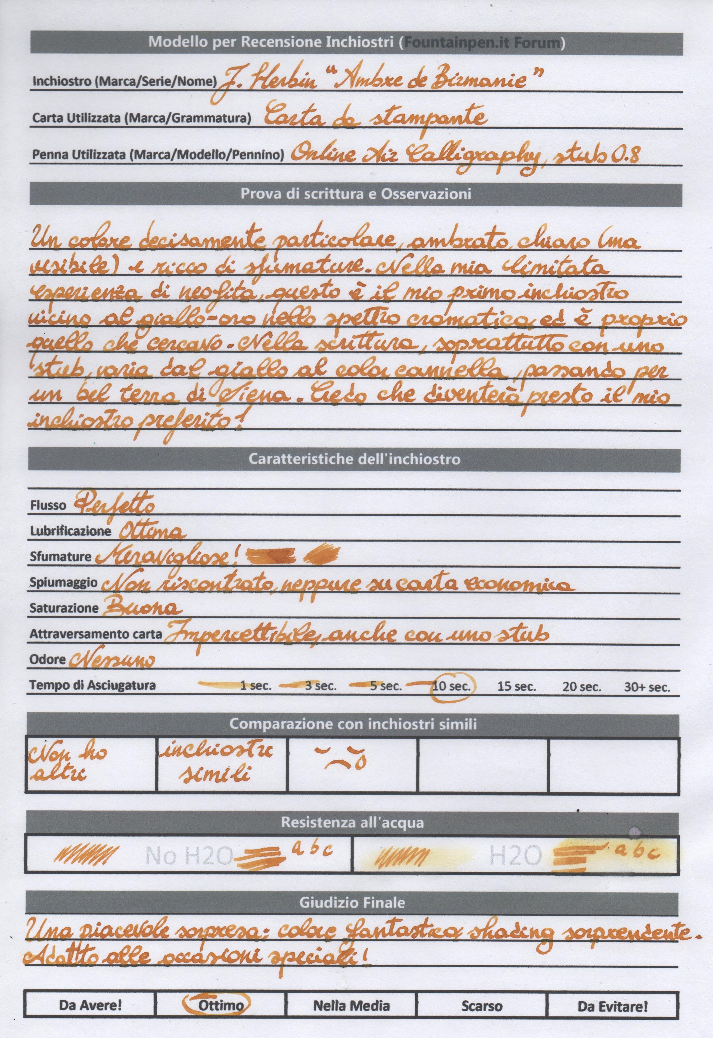 Condivido tutto quanto scritto nella tua recensione. Lo uso perché è legato ad un ricordo importante e attualmente è caricato nella nuovissima Noodler's Creaper Tortoise ricevuta oggi. Direi che è un'ottima combinazione. Questo inchiostro lo uso per gli appunti insieme al Noodler's Kiowa Pecan e al Noodler's Heart of Darkness (che userò, sperabilmente, per imparare a disegnare con penna ed inchiostro). Un punto di forza degli inchiostri J.Herbin è la facilità con cui possono essere rimossi dalla penna, inoltre sono scarsamente viscosi e favoriscono la scorrevolezza del pennino.
