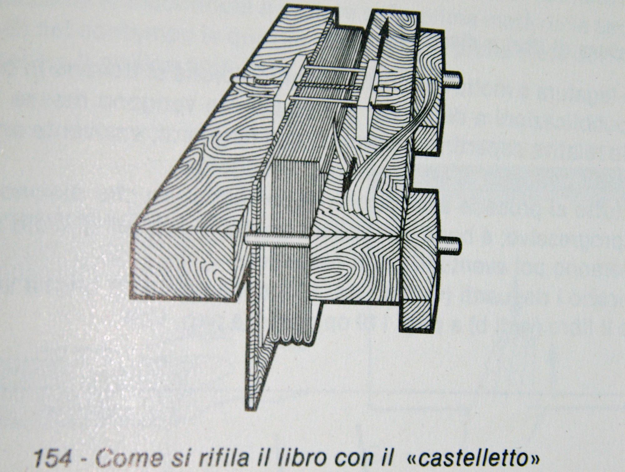 il castelletto viene utilizzato solo per rifilare (a meno di levare la lama). Per stringere il volume durante le varie lavorazioni, nel libro, si impiega il torchio grande o dei torchi più piccoli (torchietti) specifici.