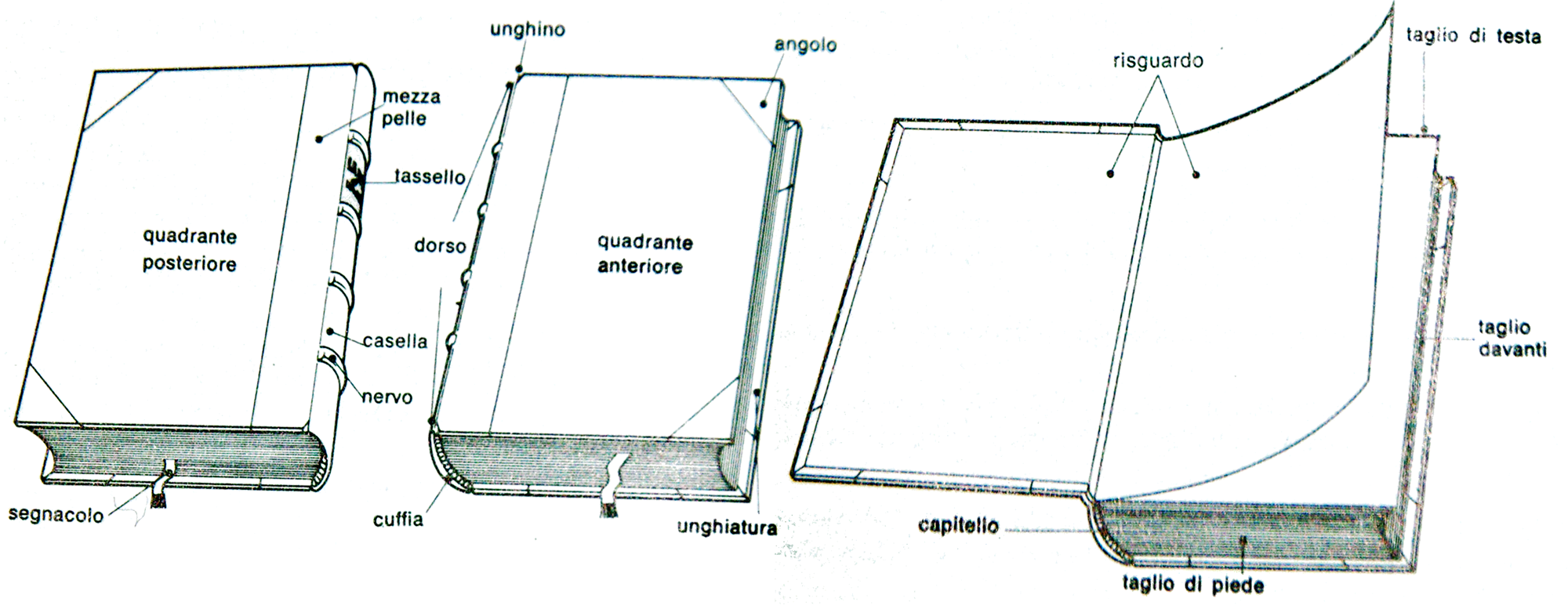 Nomenclatura (leggermente riassunta) adottata nel libro «Rilegare per hobby» di Elio Tonegato