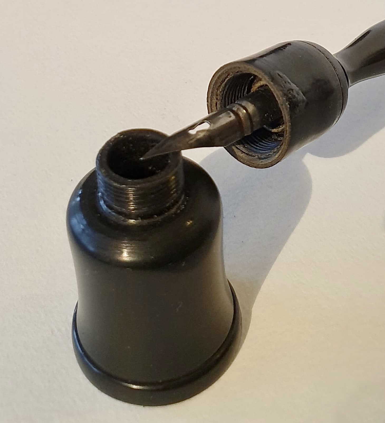 Penner in ebanite fine '800 circa, che ricorda, (anche se con pennino fisso nel tappo, senza porta mine e sandracchiera), l'elegantissimo, settecentesco Baradel*.