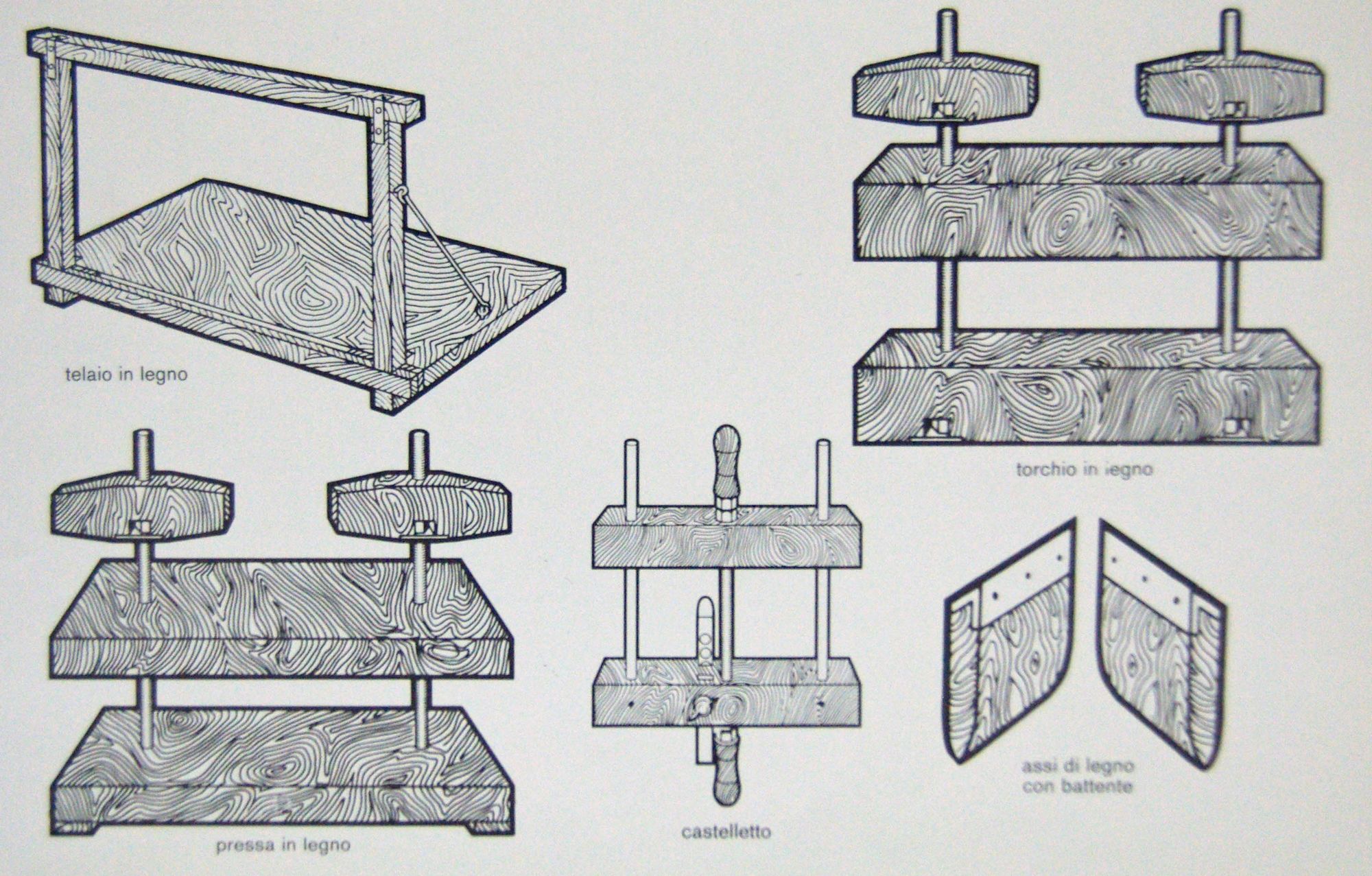 Io (parlo di tanti anni fa), con poche risorse, costruii il torchio, il castelletto (rifilatore) e il telaio per cucire nonché vari attrezzini tipo pieghetta in osso, sfibra spago, seghetto dedicato, ecc. Sono cose che negli anni ho utilizzato raramente, ma, mi piace sapere che in caso di necessità le ho.