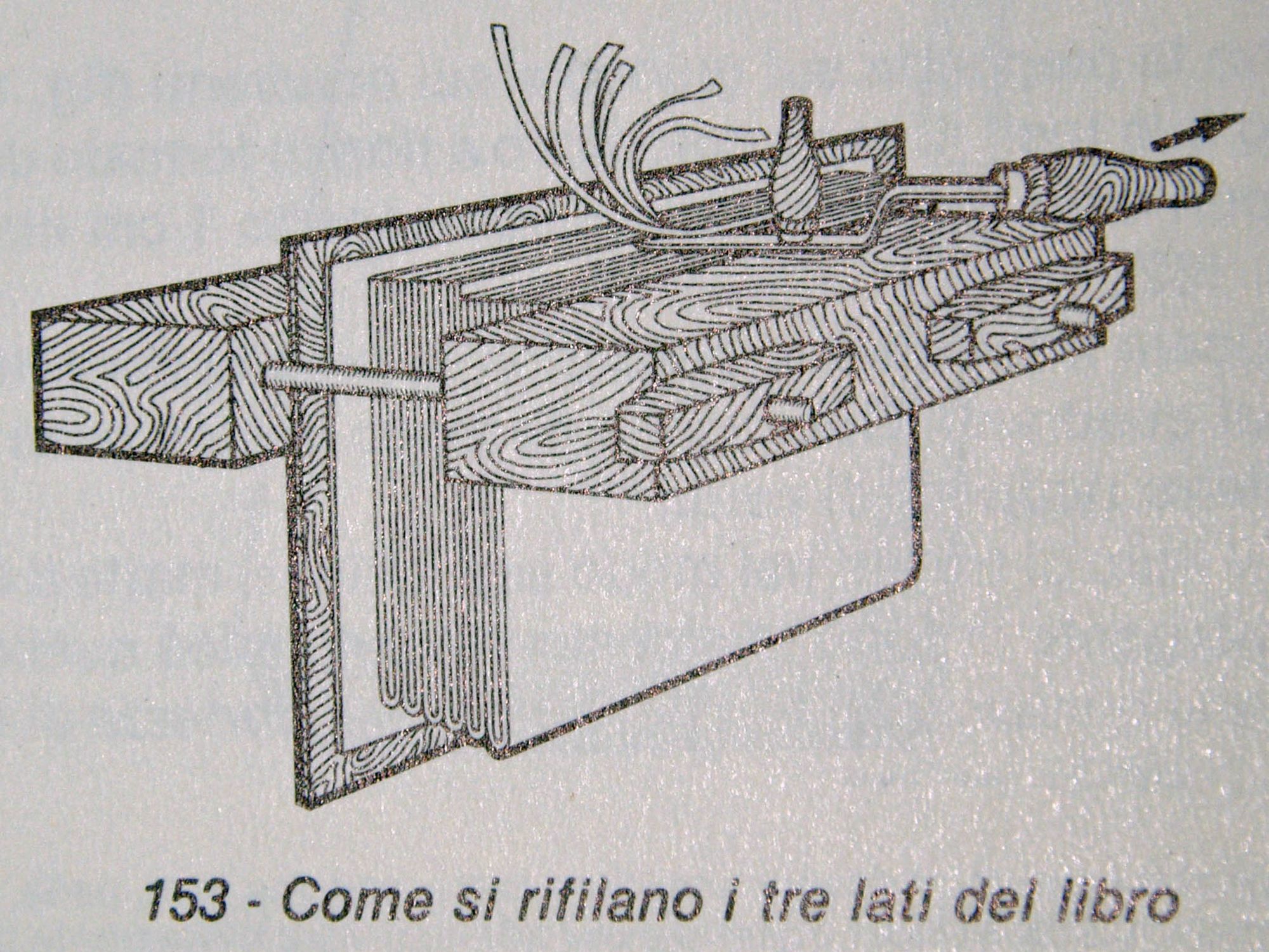 La prima è una panoramica di attrezzi tra cui quelli coinvolti nella rifilatura delle pagine: .