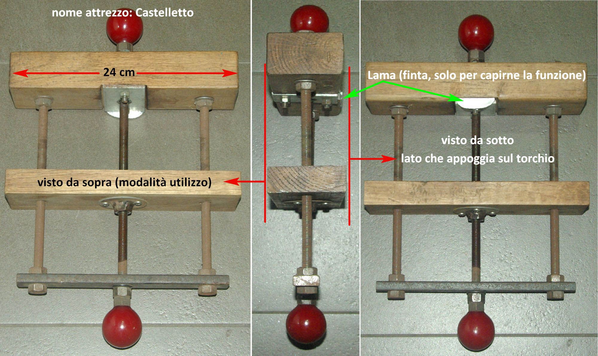 Tonegato in «Rilegare per hobby» lo chiama castelletto, ma Guido Giannini nel suo «il legatore di libri» ed.Hoepli, molto più vecchio (ho la settima edizione che è stata stampata nel 1970), lo chiama «torcoletto».