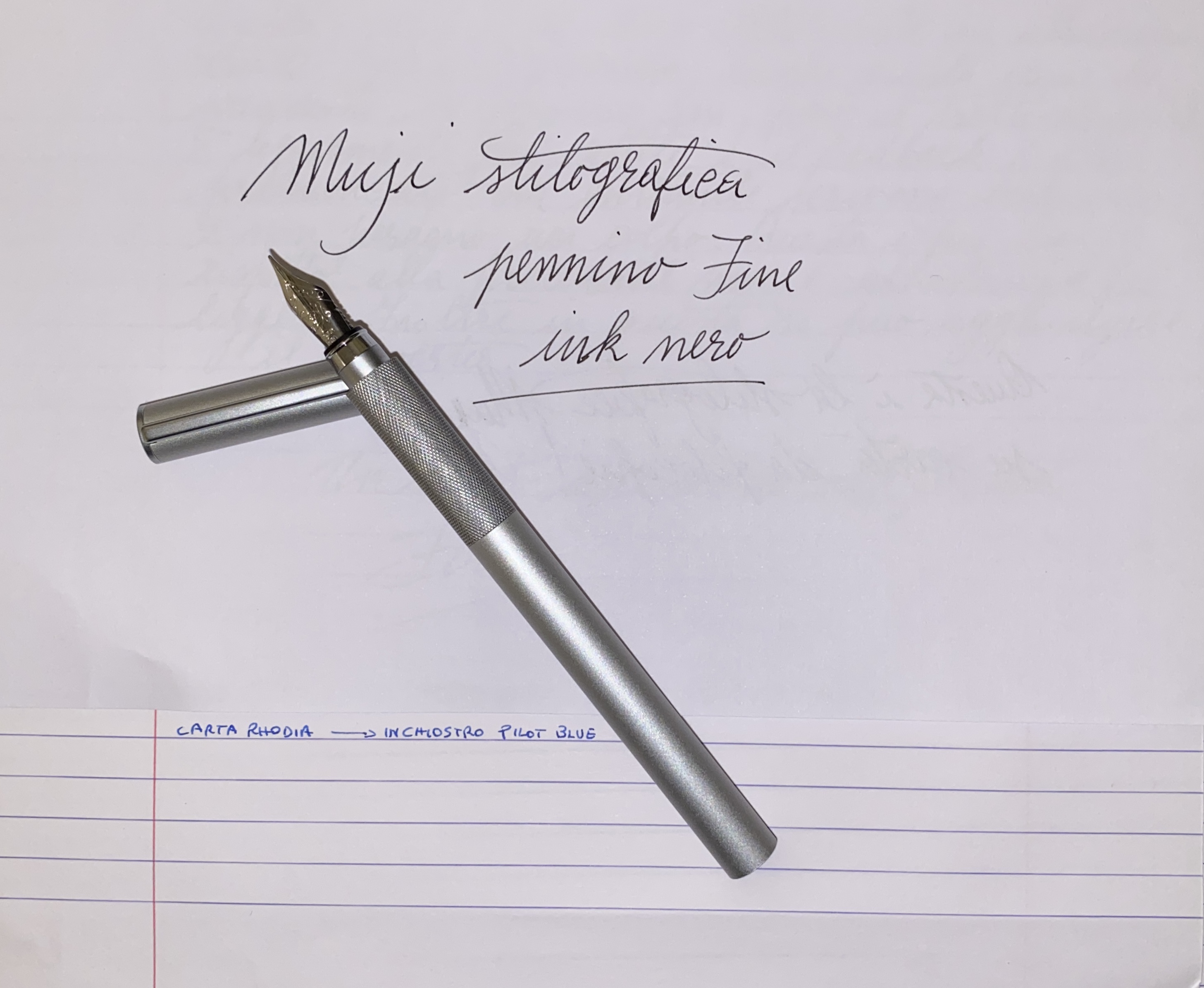Dall’altro lato abbiamo la Muji (non so come si chiami il modello) tutta in alluminio satinato con l’impugnatura sapientemente zigrinata per migliorare la presa. Anche lei ha un pennino fine che dovrebbe essere un tedesco Schmidt e che scrive benissimo anche lui ma il tratto è un po’ più sottile e il feedback un po’ più pronunciato. Questa penna è più lunga della precedente e può essere usata con e senza cappuccio senza che il bilanciamento ne risenta, infatti il cappuccio è leggerissimo. Nonostante le sue dimensioni maggiori risulta comunque più leggera dell’altra. Su questa si può montare un converter oppure due cartucce standard contemporaneamente. Per questa prova di scrittura l’ho usata con inchiostro nero della cartuccia in dotazione. Non so che inchiostro sia ma nonostante il tratto sottile rimane abbastanza scuro.