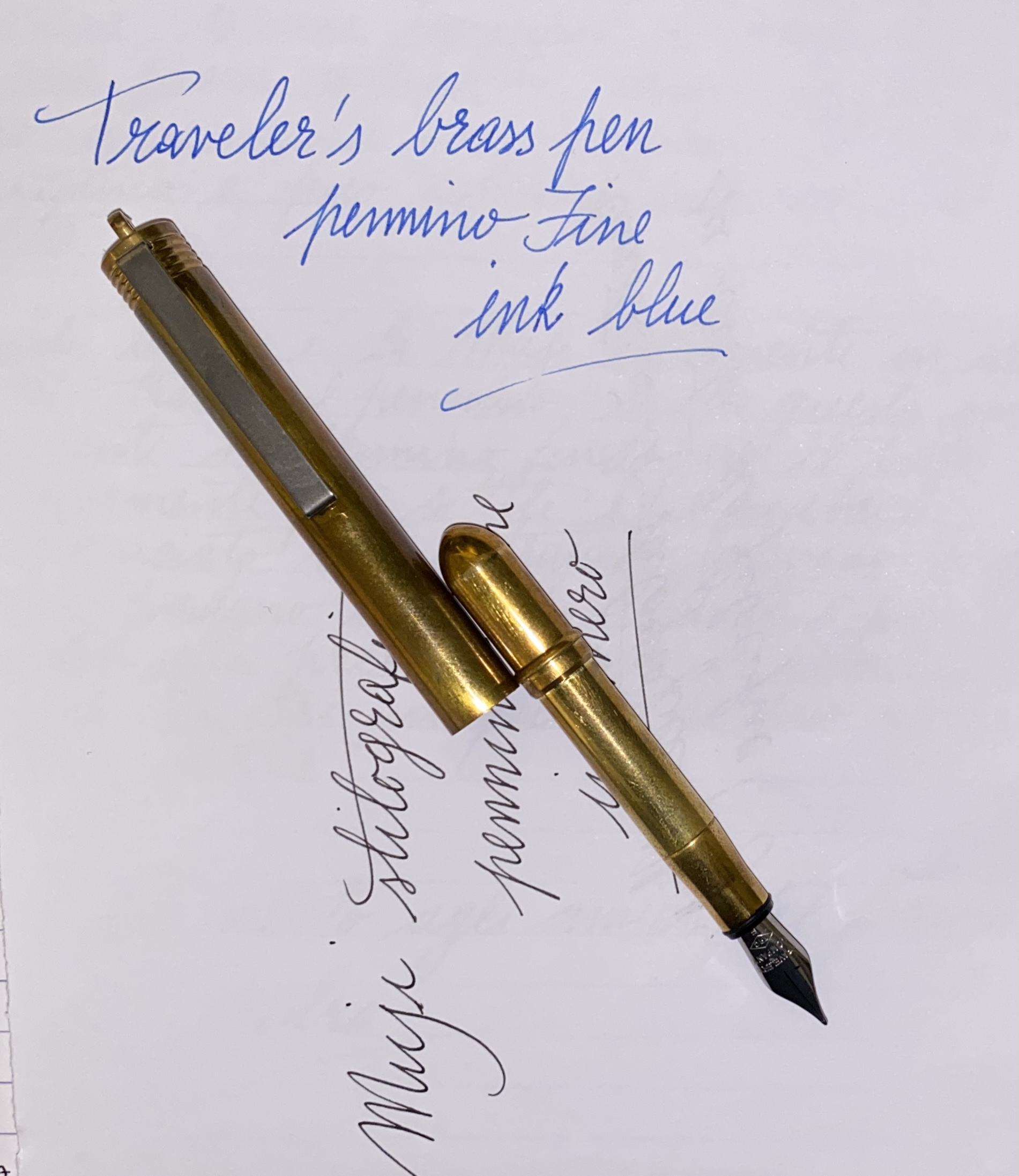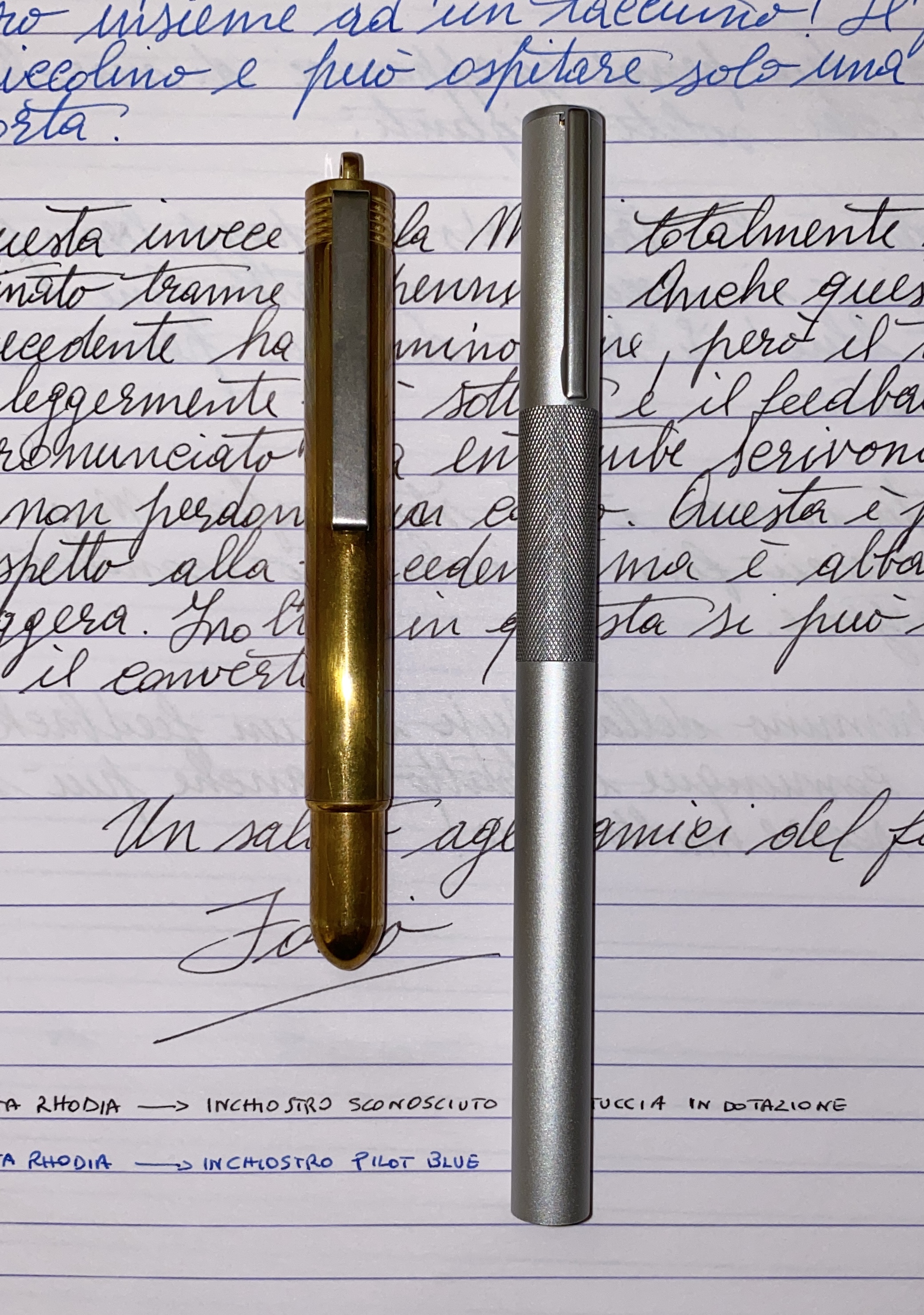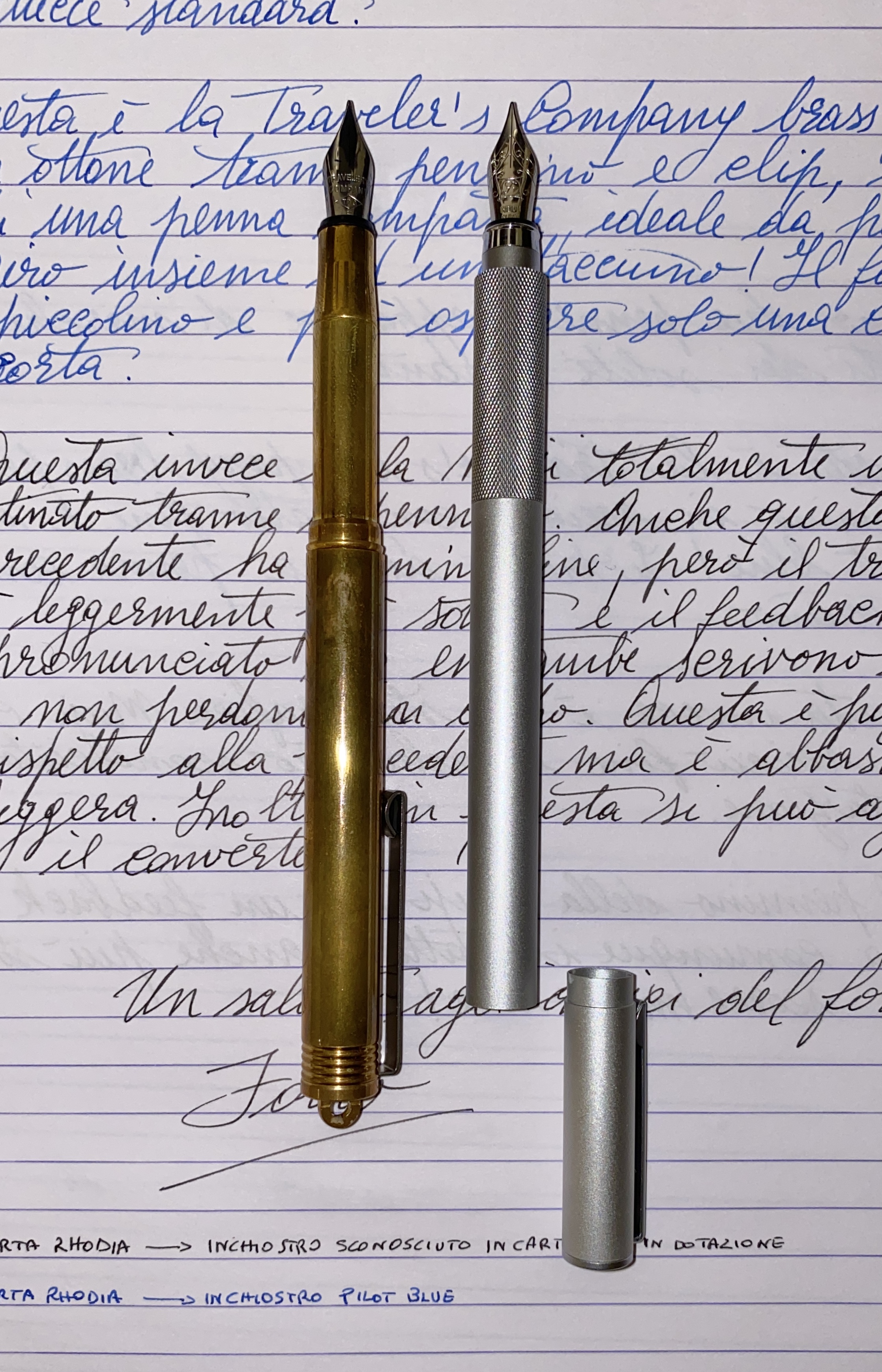 Da un lato abbiamo la Traveler’s Company brass pen, tutta in ottone tranne il pennino e la clip. Si tratta di una penna compatta, ideale da portare in giro accoppiata ad un taccuino. Il fusto è corto e può ospitare solo una cartuccia standard corta, ma dato il tratto sottile e il flusso giusto l’autonomia comunque è considerevole. Ovviamente va utilizzata con il cappuccio calzato e in questo modo le dimensioni sono perfette. Unico appunto, la sezione è sottile ma non in maniera drammatica e comunque non è scivolosa. L’ottone é un bel materiale da tenere in mano. In questa prova di scrittura l’ho caricata con inchiostro Pilot blue.