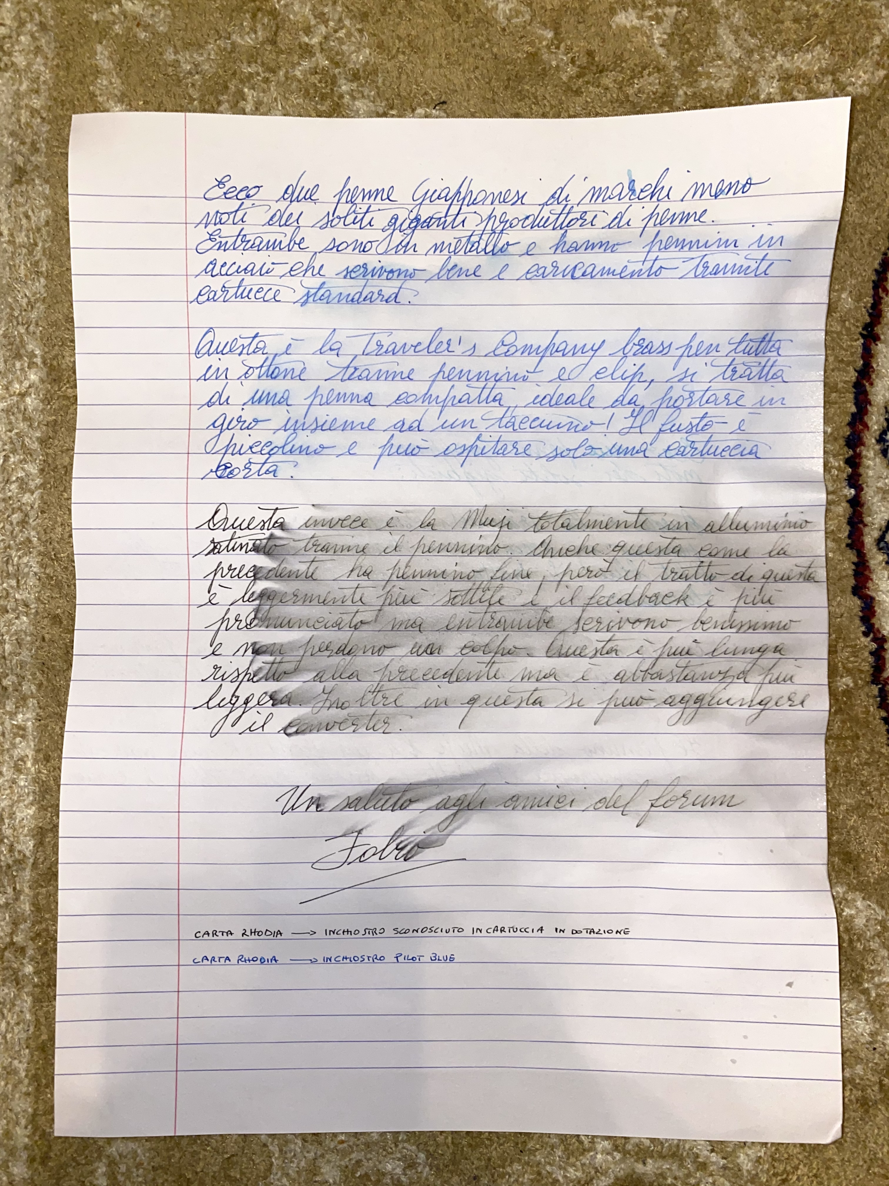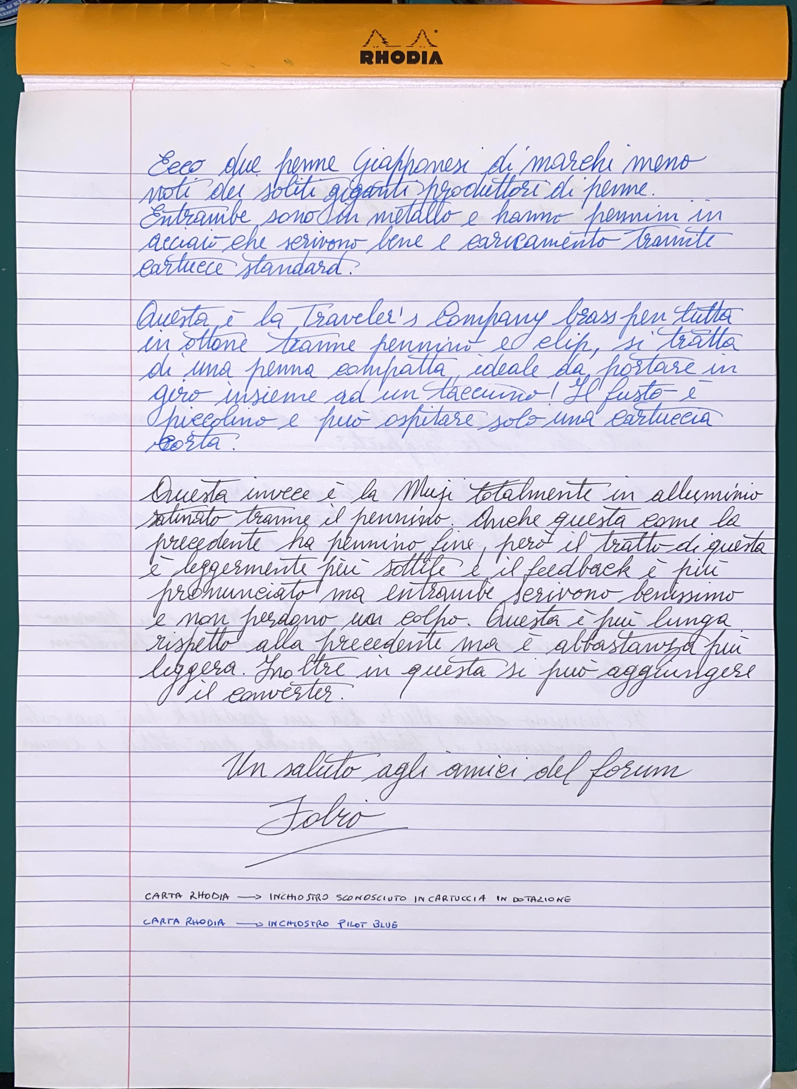 Ciao, ecco fatto. Vicino al rubinetto con la mano ho gettato manciate d’acqua più volte simulando il rovesciarsi di un bicchiere. Fatto 4 volte. Hanno resistito molto meglio di quanto mi aspettassi. Menzione d’onore al Pilot Namiki Blue.ctretre ha scritto: ↑martedì 9 febbraio 2021, 4:53 Ho comprato anch'io la Muji, trovo solo che il pennino abbia molto feedback ma almeno il tratto è più fine di quello della Kaweco Sport EF. Le cartucce saranno quelle che vendono loro a 1,90 € per un pacco da 6. Io non l'ho montata perché volevo una penna con cui consumare la montagna di Kaweco Royal Blu cancellabile che mi ritrovo dopo aver riciclato il bussolotto per il nero indelebile.