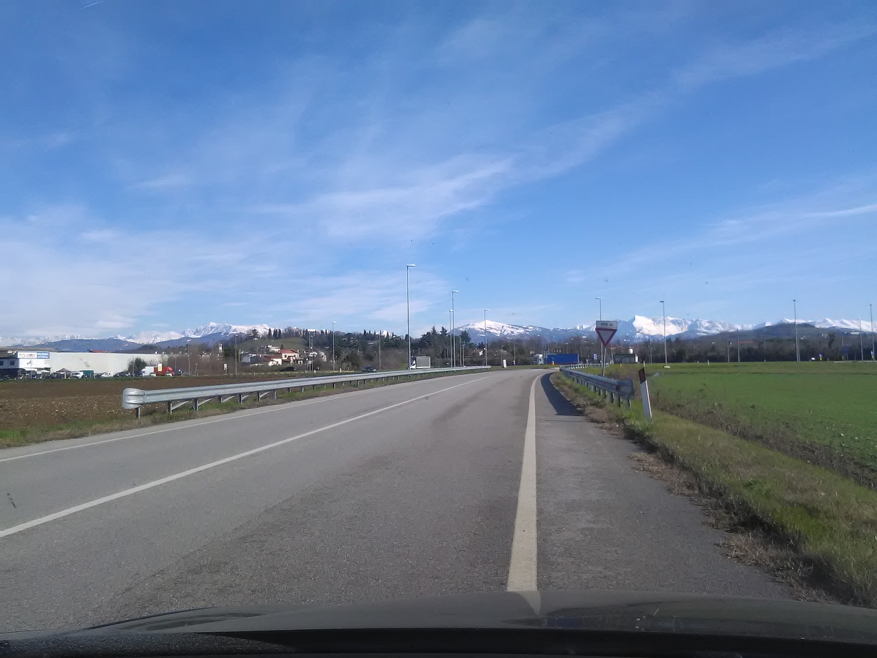 Da certi punti della tangenziale di Padova si ha un'ottima vista su Monte Carega, Pasubio, altopiano di Asiago, monte Grappa e le prime cime del Cadore. Fare una foto la vedo un po' dura in macchina da solo però... per adesso basteranno i nomi...