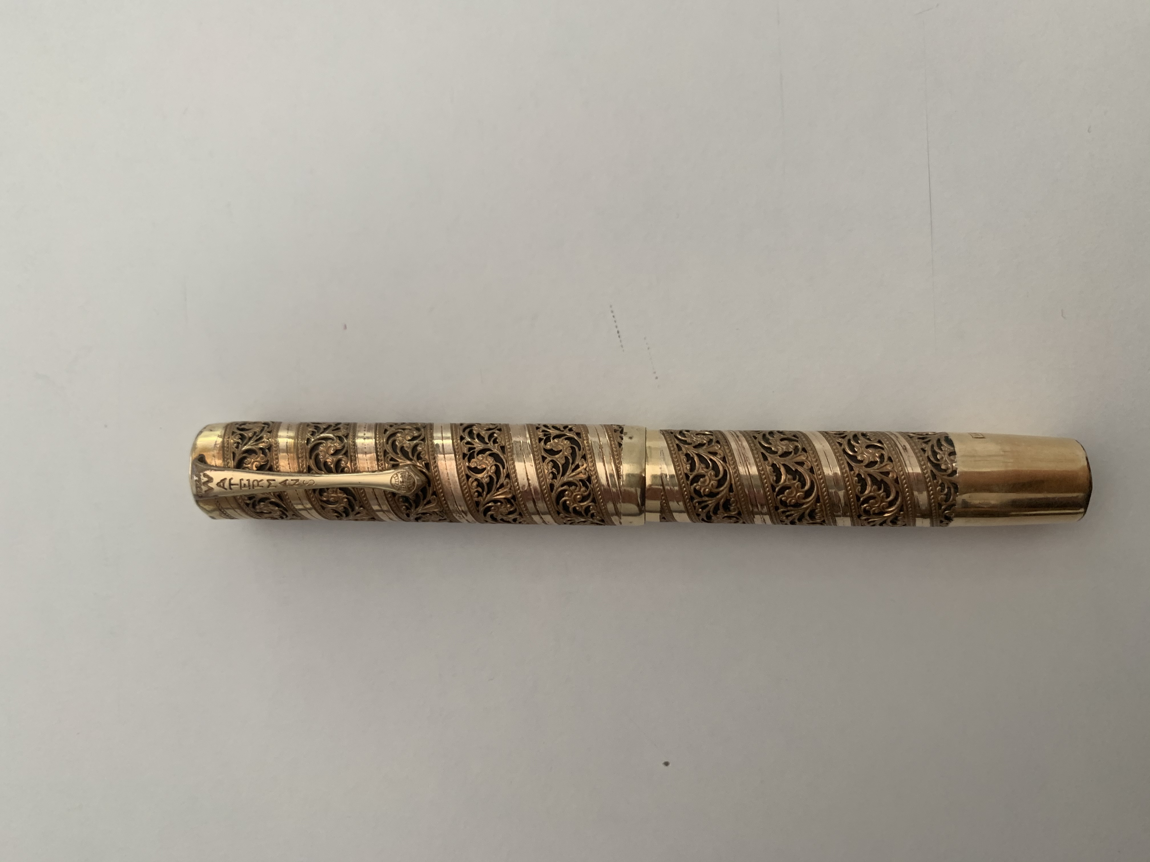 lavorazione a galleria o filigree di solito riservata alle rientranti, solo un paio di precisazioni per tua conoscenza visto che come affermi non sei esperto, la parte metallica non è in oro ma ottone laminato, come si evince dalle varie mancanze di doratura e dal punzone tipico, 18KR che appunto identifica le laminature, il pennino essendo penna americana è in oro 14K probabimente piacevolmente flessibile.