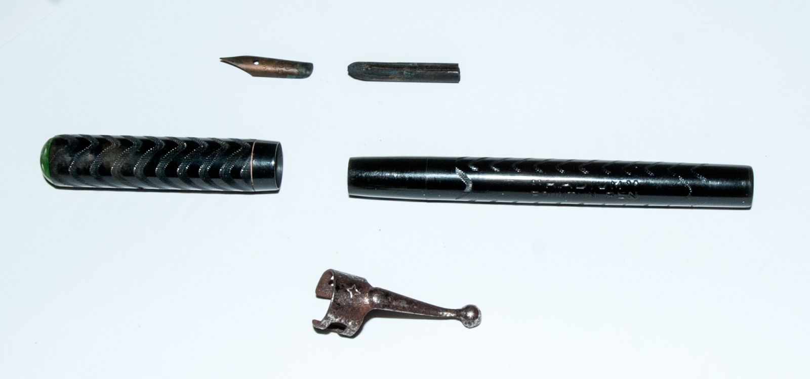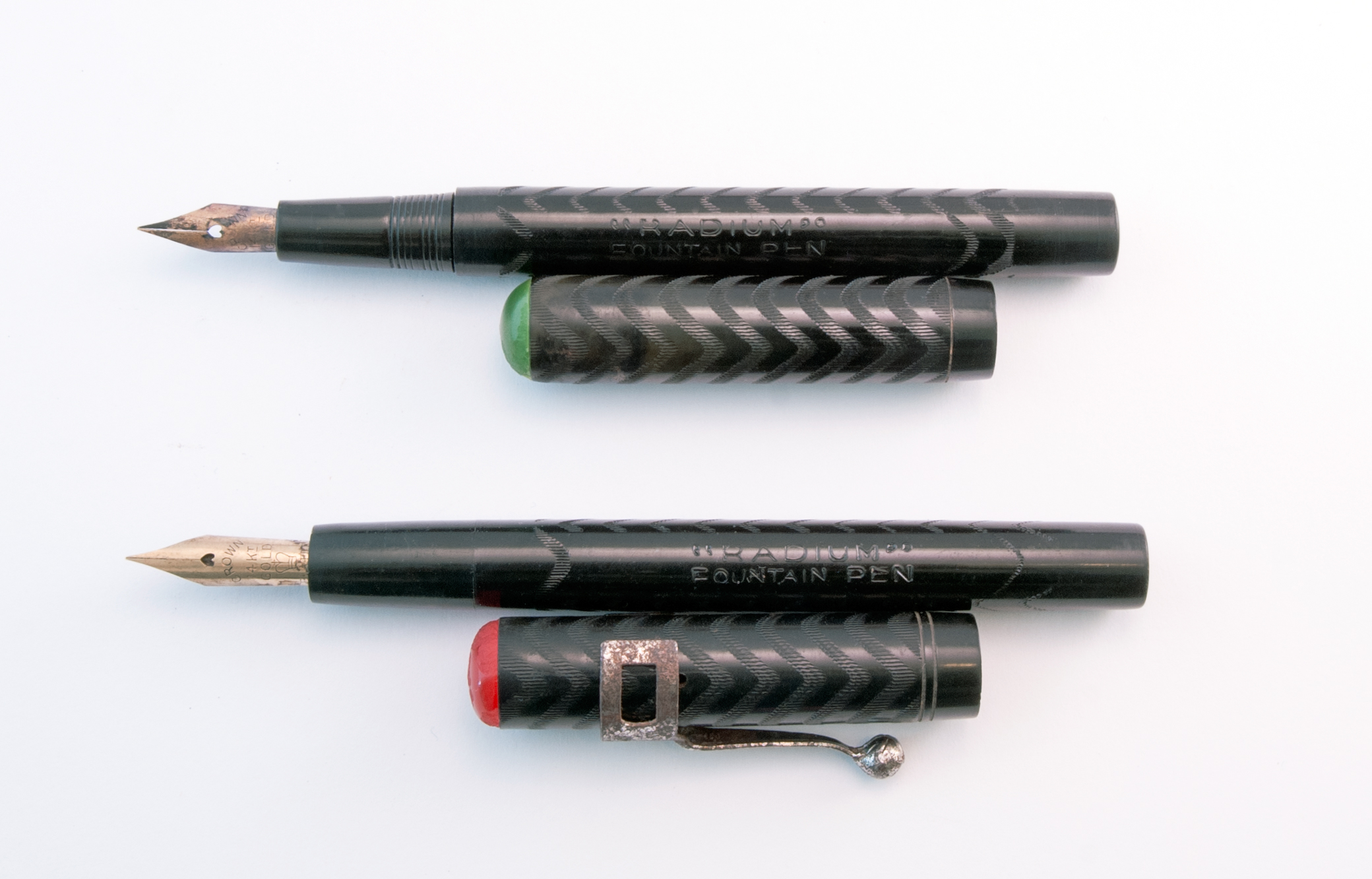 Ho cercato senza successo qualche informazione sulla marca, ma a quanto pare la "RADIUM" fountain pen ha fatto il possibile per far perdere le tracce della sua esistenza. Le due penne, a contagocce, sono molto simili alle Waterman d'inizio Novecento. Considerata l'età, direi siano ben conservate: l'ebanite è lucida, nerissima, le incisioni ben scolpite. Le sezioni si svitano agevolmente e il serraggio al fusto è ottimale in entrambe. Le parti che hanno evidenti segni del tempo sono i due "gioielli" - uno verde l'altro rosso - alla sommità dei cappucci. Hanno abrasioni, e quello verde è scagliato su un lato. I fermagli sono ossidati. Uno dei due conduttori è rotto - ne manca un pezzo! - l'altro invece sembra in buono stato, mentre i due pennini, in metallo placcato oro, sono decisamente da pulire da sporco e incrostazioni di inchiostro. Si tratta di due pennini "CROWN" 14K Gold plated, ed è presente il classico simbolo della corona.