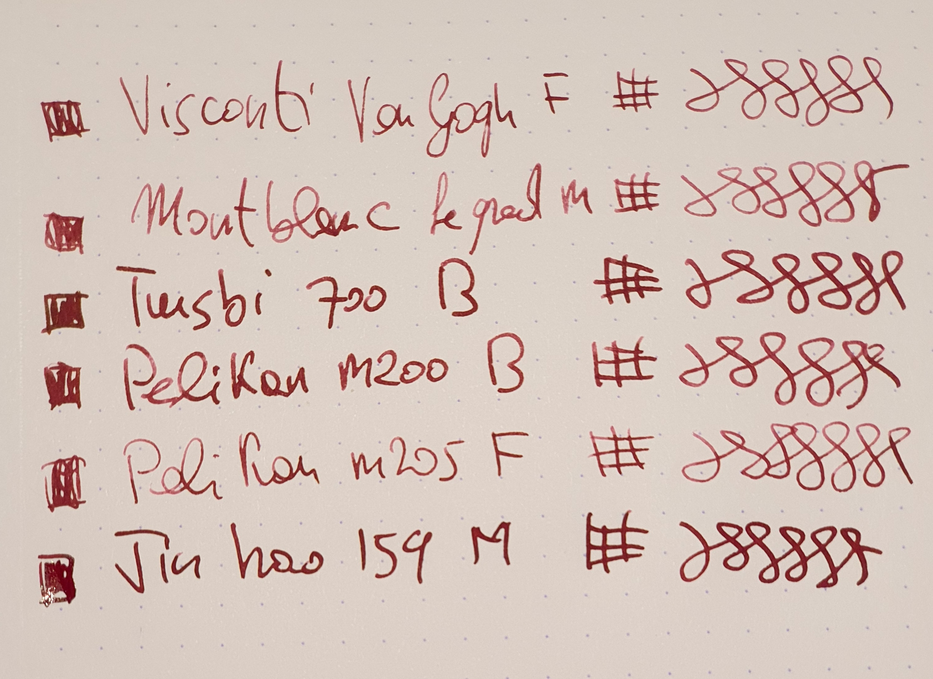 Tempo fa mi fidavo dei test di scrittura dei differenti inchiostri che trovavo sulla rete, poi rapidamente ho capito che al massimo possono essere una indicazione molto di massima; le variabili sono troppe, senza contare che i filmati, o peggio le foto, o ancora peggio le scansioni, risentono molto della luce utilizzata e del bilanciamento del bianco che molti non si preoccupano minimamente di ottimizzare, stravolgendo totalmente le tonalità dei colori.