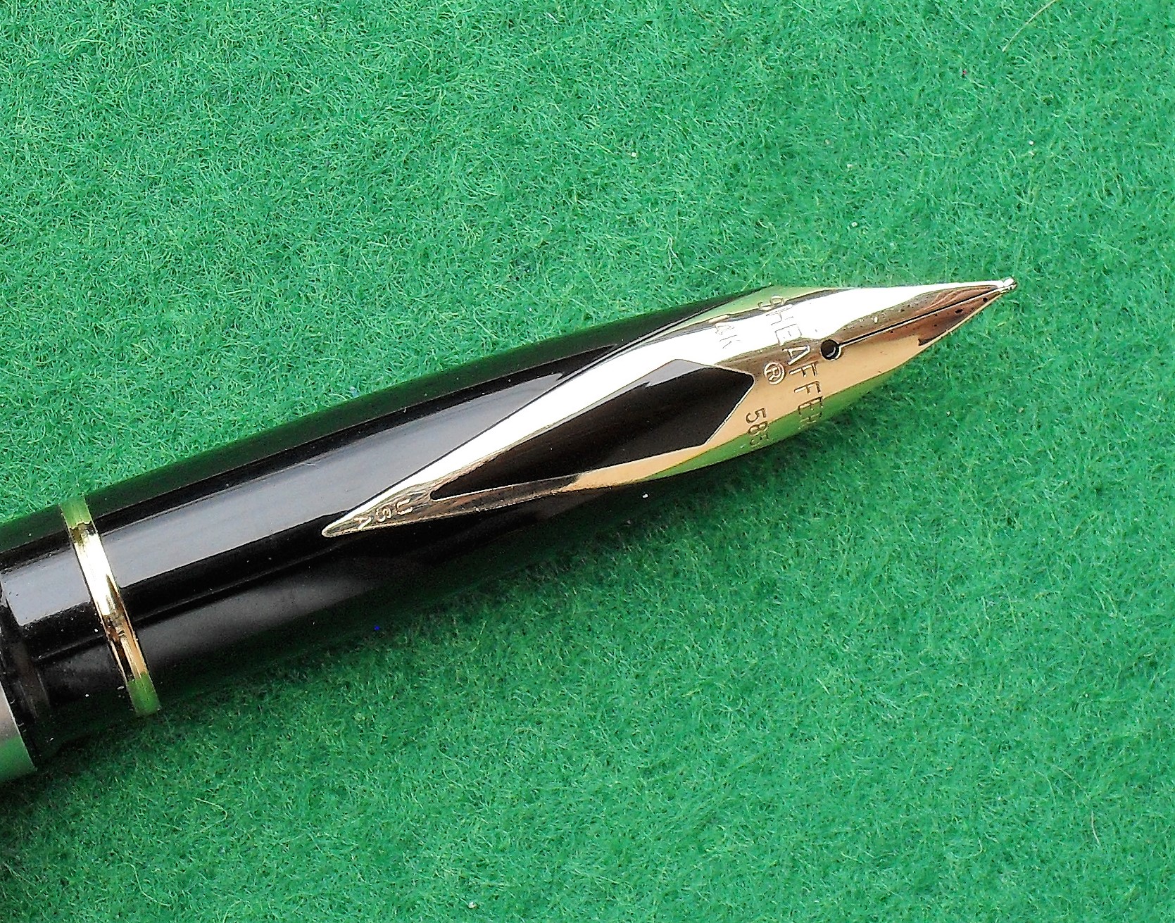 La penna sfoggia linee molto pulite, secondo il gusto del tempo, e non rinuncia ad uno dei tratti esclusivi e più caratteristici di Sheaffer: il bellissimo pennino intarsiato.