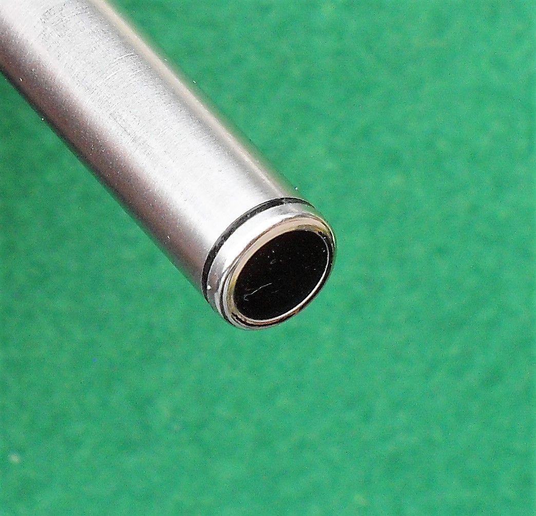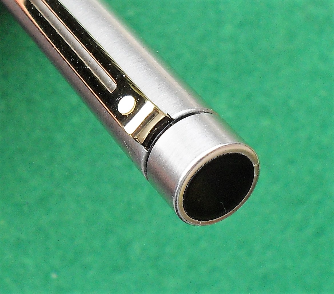 La pulizia della linea della penna chiusa è esaltata dalla mancanza d’un anello a contrasto alla base del cappuccio o del corpo. Due sottili anelli incisi e smaltati in nero aggiungono un tocco di rifinitura molto piacevole e si sposano benissimo con i due terminali “flat top”, nei quali sono incastonati due dischi anch’essi neri.