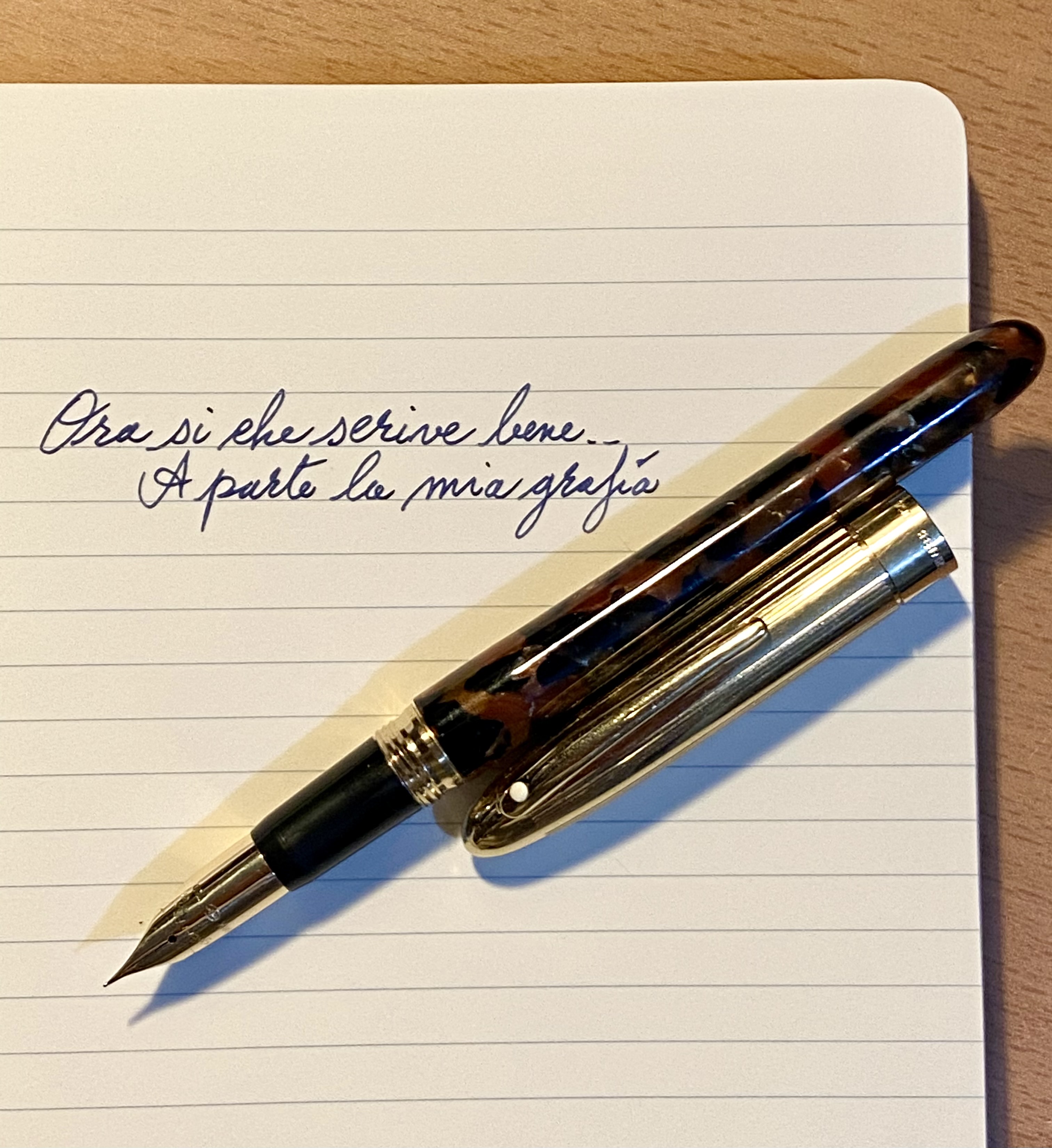 Asciugato e rimontato il tutto, vedo con mia soddisfazione che il flusso d'inchiostro era finalmente veramente appropriato. Solo il colore dell'inchiostro Sheaffer Blu/Black lasciava veramente (molto) a desiderare.. una specie di grigino slavato che si perdeva in un foglio a righe