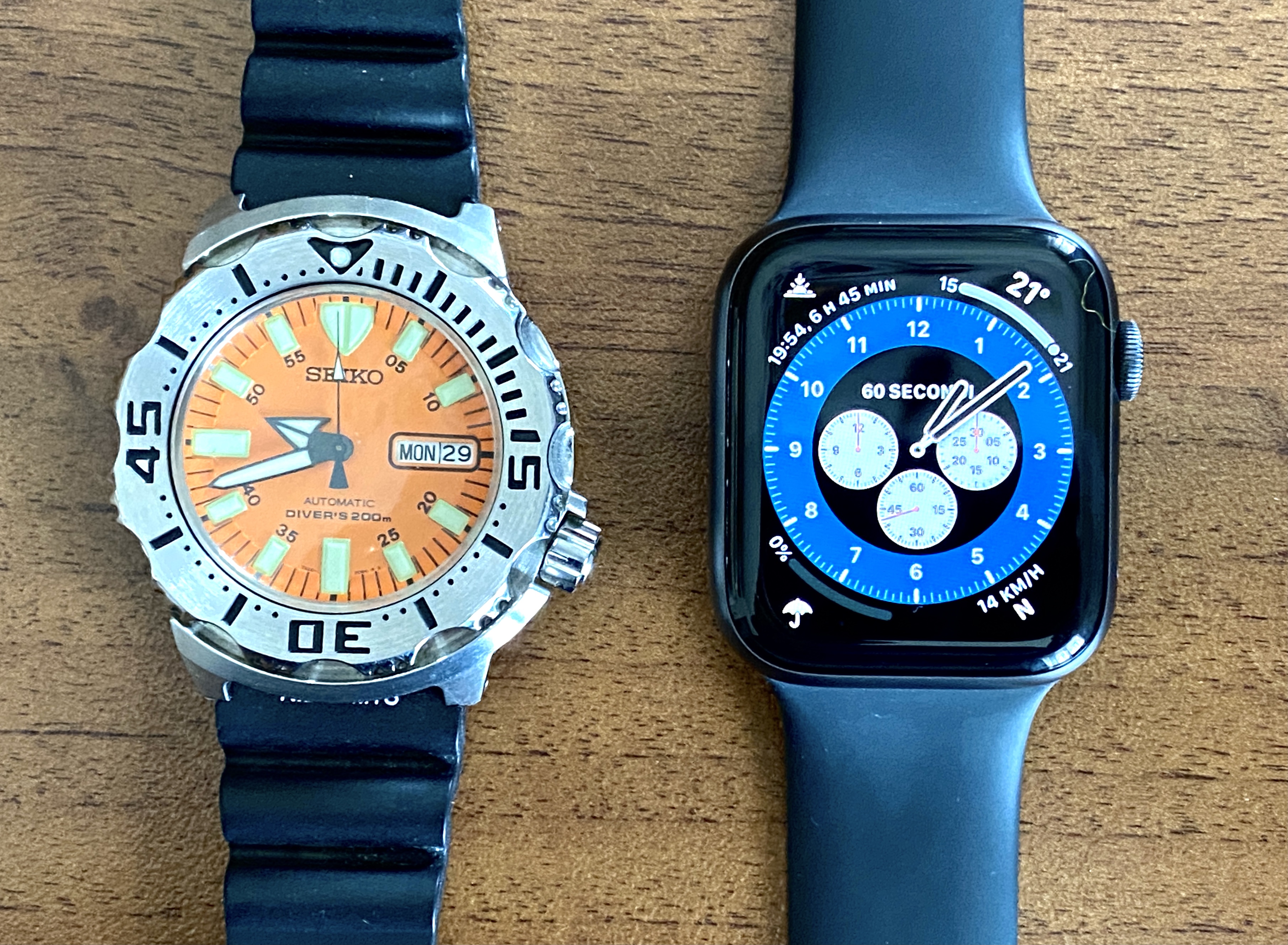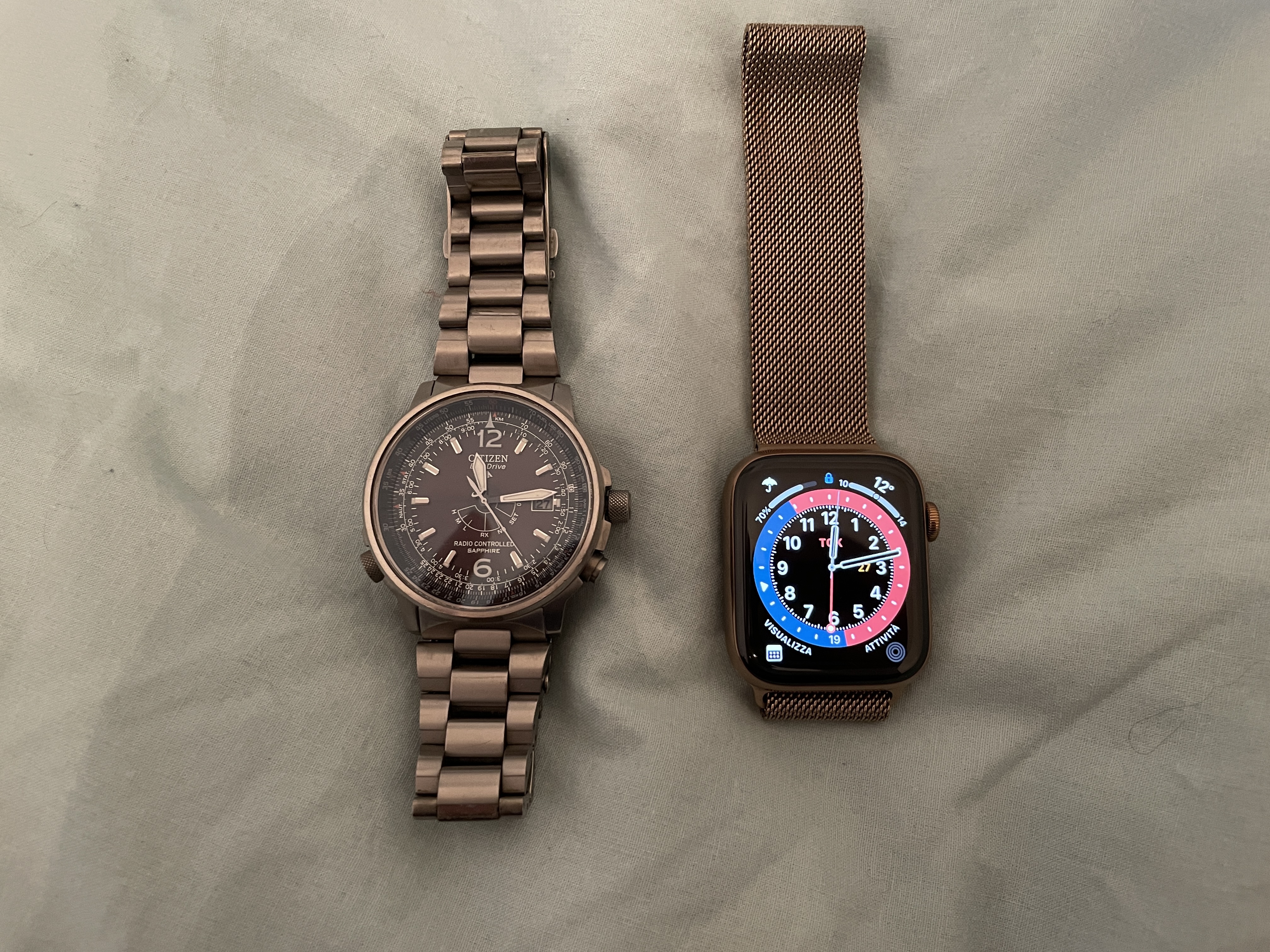 Allego una foto del mio citizen radio-controllato eco-drive soprattutto per chi ha iniziato chiedendo consiglio, segnalando che p un orologio che dopo 15 anni non sbaglia un colpo e si mantiene in punto perfettamente a ogni passaggio ora solare-ora legale. Accanto a lui l’Apple Watch che, come ho già detto, ormai da 4 anni è costantemente al mio polso. Ha i suoi pro e i suoi contro ma, per me, i pro sono maggiori: promemoria e calendario mi aiutano a rispettare le scadenze molto più che quando li segno sul calendario del cellulare o sull’agenda cartacea, c’è poco da fare; e anche la gestione delle notifiche mi è d’aiuto soprattutto sul lavoro, potendo vedere velocemente di cosa si tratta e decidendo cosa ignorare e cosa no.