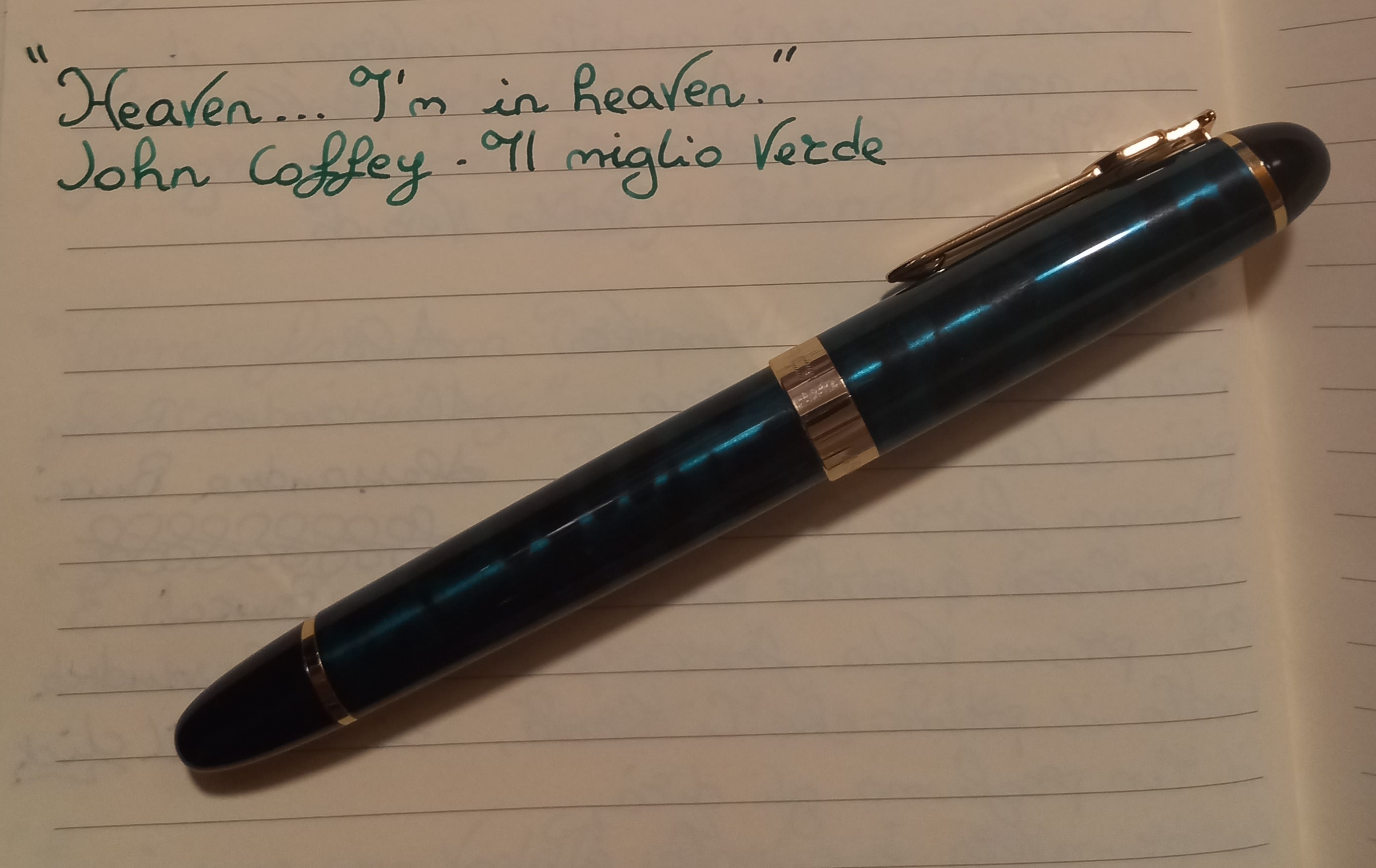 francoiacc ha scritto: martedì 20 aprile 2021, 22:04 Goldfink CusTom pen oversize in celluloide verde. Pennino nr. 8, ricarica a pistone.