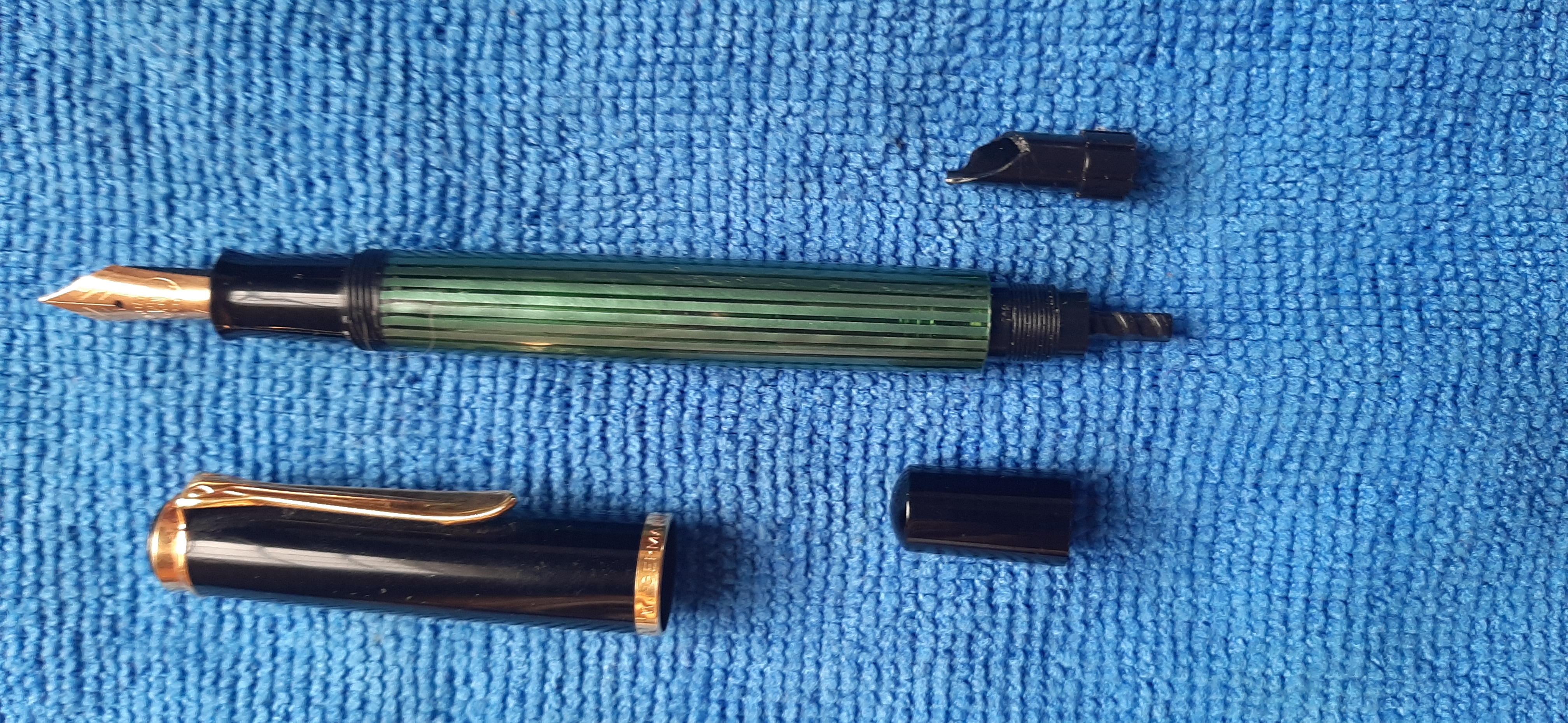 Sono un nuovo iscritto, ovviamente appassionato (incompetente) di stilo, ed ho subito necessità del vostro consiglio ed aiuto. Mi è stata regalata da un amico che la stava cestinando la Pelikan in foto. La penna, per il resto in ottime condizioni, è stata lasciata inchiostrata e nel tentativo di smuovere il pistone ( che si era incollato) il mio amico ha rotto un particolare ( quello piccolino in foto che appunto si vede danneggiato) del sistema di caricamento. Ho sottoposto la penna ad un bagno salutare e l'ho ripulita, ora ho necessità di ripristinare il sistema di caricamento. Non mi sembra il caso di inviarla da un riparatore trattandosi comunque di una penna di non elevato valore. Mi necessità il pezzo/raccordo rotto e vorrei sapere come si chiama per ricercarlo come ricambio e se mi sapete indicare dove trovarlo ( ebay ?), oppure si può trovare tutto il blocco di caricamento ? Questo nel fusto è montato a pressione od avvitato ? Come si smonta ? Sono tante domande ma sono certo della vostra competenza e del vostro aiuto. Vi ringrazio e spero di potervela presto mostrare rediviva.