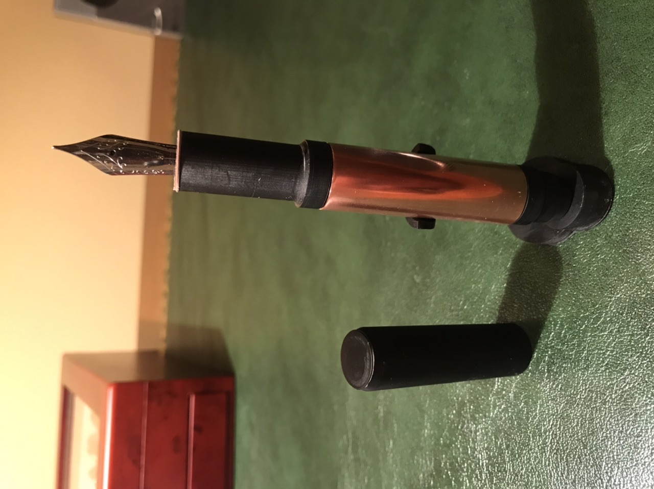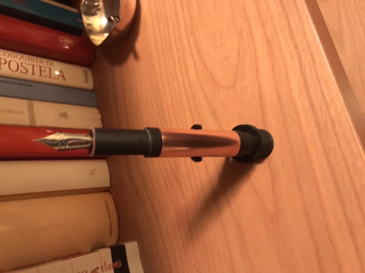 Il pennino è il noto jowo 6 che ho preso in misura M e scrive in maniera fluida e non troppo abbondante, io l’ho caricata con un Diamine Ancient copper che si abbina bene con il color rame.